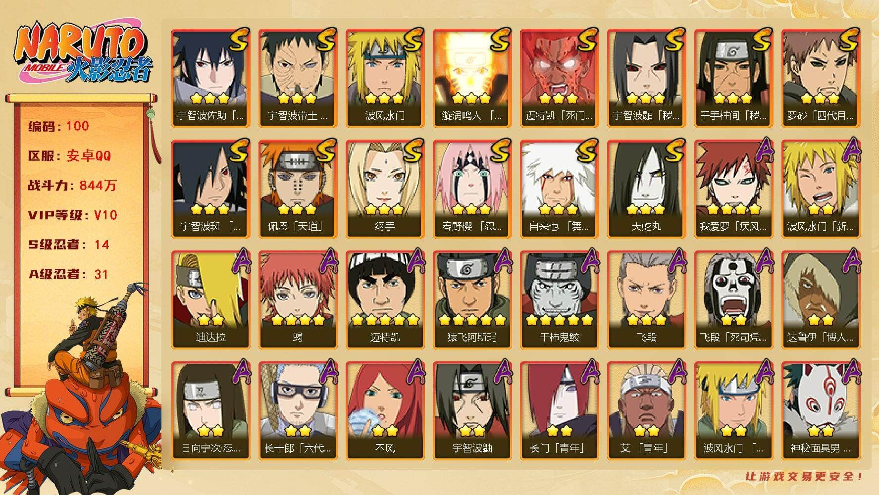 【游戏多多】 【可二次实名】可二次安卓QQ2451区 【V10】【844万战力】14S级忍者数-31A级忍者数【S级忍者】:千手柱间「秽土转生」(3星),宇智波鼬「秽土转生」(3星),春野樱「忍界大战」(3星),宇智波带土「忍界大战」(3星),宇智波斑「木叶创立」(3星),罗砂「四代目风影」(3星),自来也「舞之豪杰」(3星),大蛇丸(3星),纲手(3星),波风水门(3星),漩涡鸣人「九喇嘛连结」(3星),迈特凯「死门」(3星),佩恩「天道」(3星),宇智波佐助「永恒万花筒」(3星)【A级忍者】:艾「青年」(2星),长门「青年」(2星),波风水门「青年」(2星),波风水门「新春限定」(2星),达鲁伊「博人传」(2星),迪达拉(2星),奇拉比(2星),奇拉比「忍界大战」(2星),飞段(3星),飞段「死司凭血」(2星),干柿鬼鲛(5星),漩涡博人「桃式显现」(2星),迈特凯(5星),桃地再不斩「秽土转生」(2星),我爱罗「疾风传」(4星),蝎(4星),猿飞阿斯玛(5星),宇智波鼬(2星),宇智波佐助「须佐能乎」(2星),宇智波佐助「万花筒写轮眼」(2星),照美冥「五代目水影」(2星),日向宁次「忍界大战」(2星),日向雏田「最终章」(2星),长十郎「六代目水影」(2星),神秘面具男「忍者之路」(2星),李洛克「忍界大战」(2星),黑土「博人传」(2星),秋道丁次「忍界大战」(2星),千代「近松十人卫」(2星),不风(2星),宇智波泉奈(2星),各种道具详情看截图、低价出售找回包 赔、截图展示段位不代 表实际段位,如赛季更新等不可抗拒因素发生变化、时限道具不保证所剩时间、标题未写送点劵默认不送【卖号买号首选亿梦】