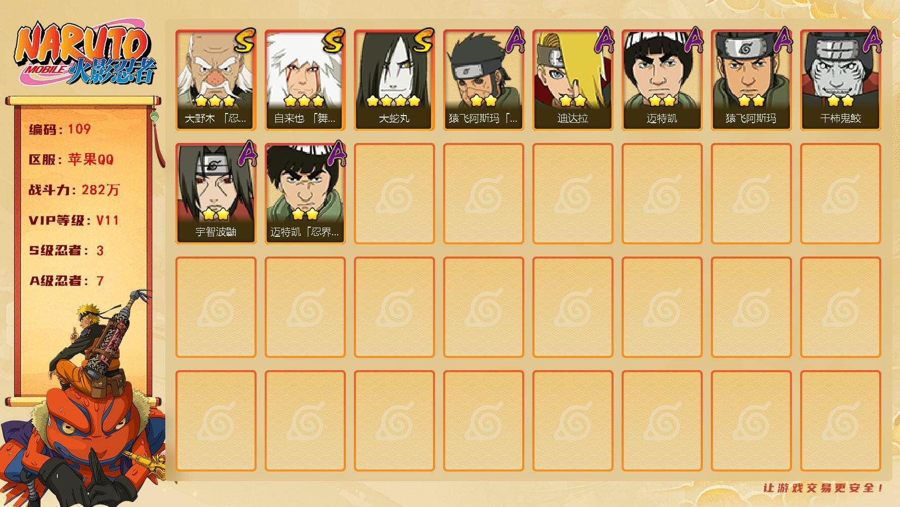 【游戏多多】 【可二次实名】可二次苹果QQ626区 【v11】【282万战力】 3S级忍者数-7A级忍者数【S级忍者】:大野木「忍界大战」(3星),自来也「舞之豪杰」(3星),大蛇丸(4星)【A级忍者】:迪达拉(2星),干柿鬼鲛(2星),迈特凯(2星),迈特凯「忍界大战」(2星),猿飞阿斯玛(2星),猿飞阿斯玛「秽土转生」(2星),宇智波鼬(2星)各种道具详情看截图、低价出售找回包 赔、截图展示段位不代 表实际段位,如赛季更新等不可抗拒因素发生变化、时限道具不保证所剩时间、标题未写送点劵默认不送【卖号买号首选亿梦】
