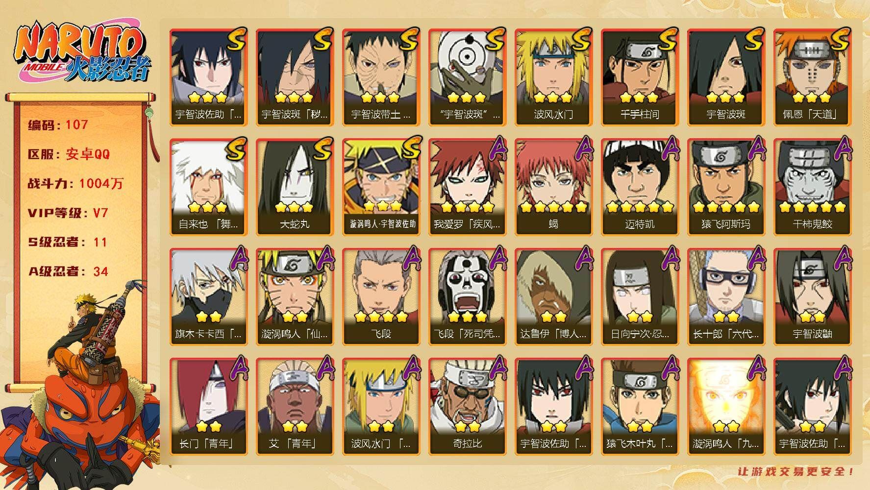 【游戏多多】 【可二次实名】可二次安卓QQ750区 【V7】【1004万战力】11S级忍者数-34A级忍者数【S级忍者】:宇智波斑「秽土转生·解」(3星),宇智波带土「忍界大战」(3星),自来也「舞之豪杰」(3星),大蛇丸(3星),千手柱间(3星),宇智波斑(3星),波风水门(3星),佩恩「天道」(3星),宇智波佐助「永恒万花筒」(3星),宇智波斑 「白面具」(3星宇智波斑「白面具」),漩涡鸣人·宇智波佐助(3星)【A级忍者】:艾「青年」(2星),长门「青年」(2星),波风水门「青年」(2星),达鲁伊「博人传」(2星),大蛇丸「晓」(2星),奇拉比(2星),飞段(4星),飞段「死司凭血」(3星),干柿鬼鲛(5星),漩涡博人「桃式显现」(2星),漩涡鸣人「仙人模式」(2星),漩涡鸣人「九尾查克拉」(2星),迈特凯(5星),旗木卡卡西「万花筒写轮眼」(2星),我爱罗「疾风传」(4星),我爱罗「忍界大战」(2星),蝎(5星),猿飞阿斯玛(5星),宇智波鼬(2星),宇智波鼬「夏日限定」(2星),宇智波佐助「须佐能乎」(2星),宇智波佐助「万花筒写轮眼」(2星),药师兜「半蛇斗篷」(2星),照美冥「五代目水影」(2星),日向宁次「忍界大战」(2星),长十郎「六代目水影」(2星),猿飞木叶丸「博人传」(2星),春野樱「百豪」(2星),秋道丁次「忍界大战」(2星),千代「近松十人卫」(2星),土台「忍界大战」(2星),大野木「侠隐江湖」(2星),巳月「仙人模式」(2星),迈特凯「青春爆炸」(2星)各种道具详情看截图、低价出售找回包 赔、截图展示段位不代 表实际段位,如赛季更新等不可抗拒因素发生变化、时限道具不保证所剩时间、标题未写送点劵默认不送【卖号买号首选亿梦】