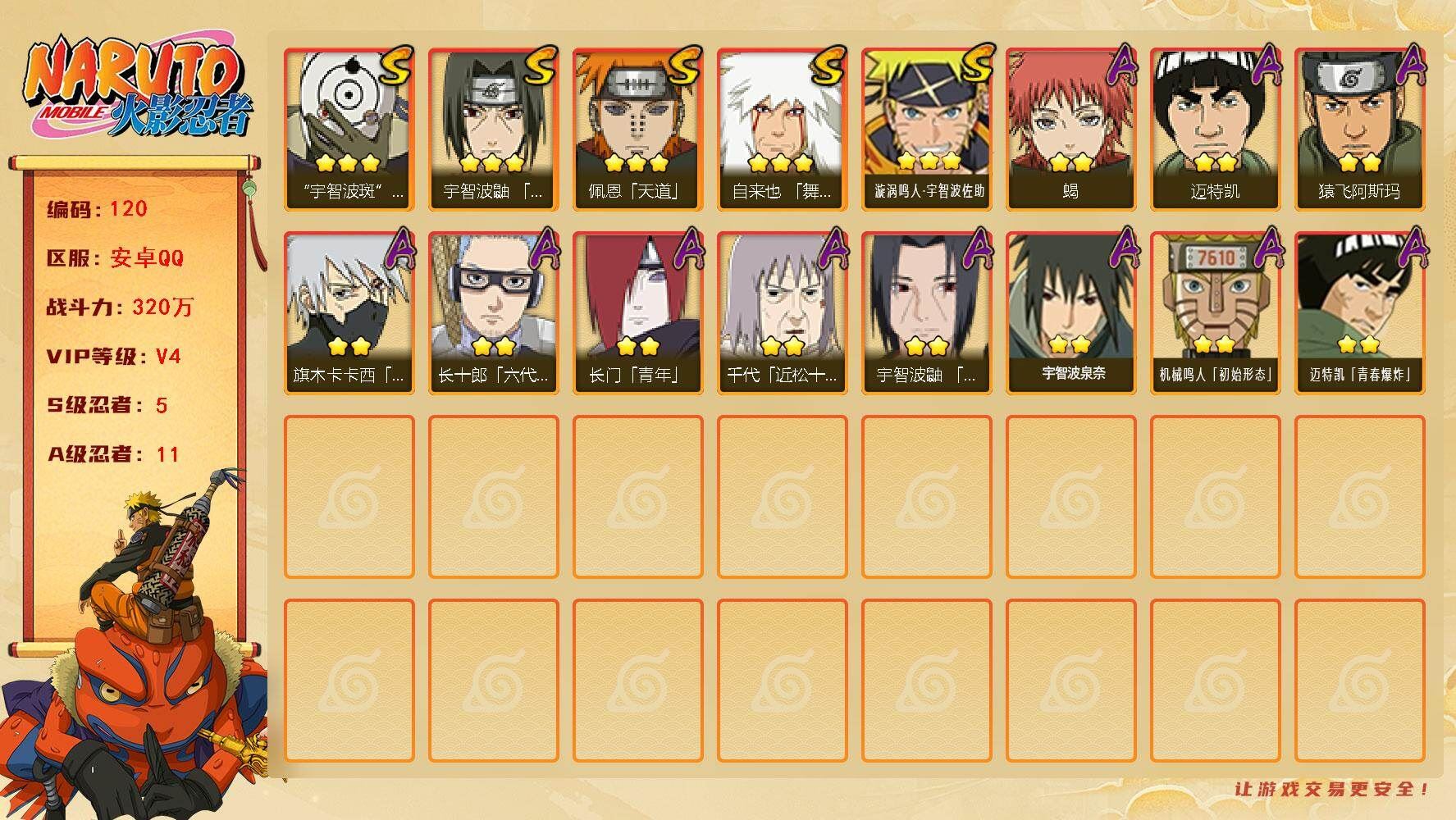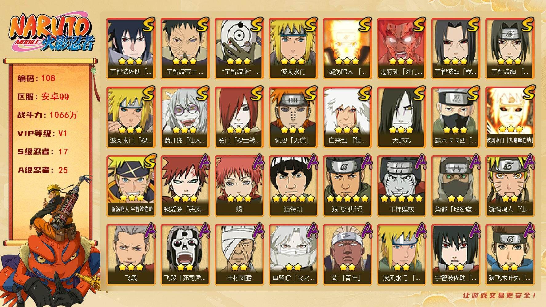 【游戏多多】 【可二次实名】可二次安卓QQ4072区 【V4】【320万战力】5S级忍者数-11A级忍者数【送金币4337】【S级忍者】:宇智波鼬「须佐能乎」(3星),自来也「舞之豪杰」(3星),佩恩「天道」(3星),宇智波斑 「白面具」(3星宇智波斑「白面具」),漩涡鸣人·宇智波佐助(3星)【A级忍者】:长门「青年」(2星),机械鸣人「初始形态」(2星),迈特凯(2星),旗木卡卡西「万花筒写轮眼」(2星),蝎(2星),猿飞阿斯玛(2星),宇智波鼬「夏日限定」(2星),长十郎「六代目水影」(2星),千代「近松十人卫」(2星),宇智波泉奈(2星),迈特凯「青春爆炸」(2星)