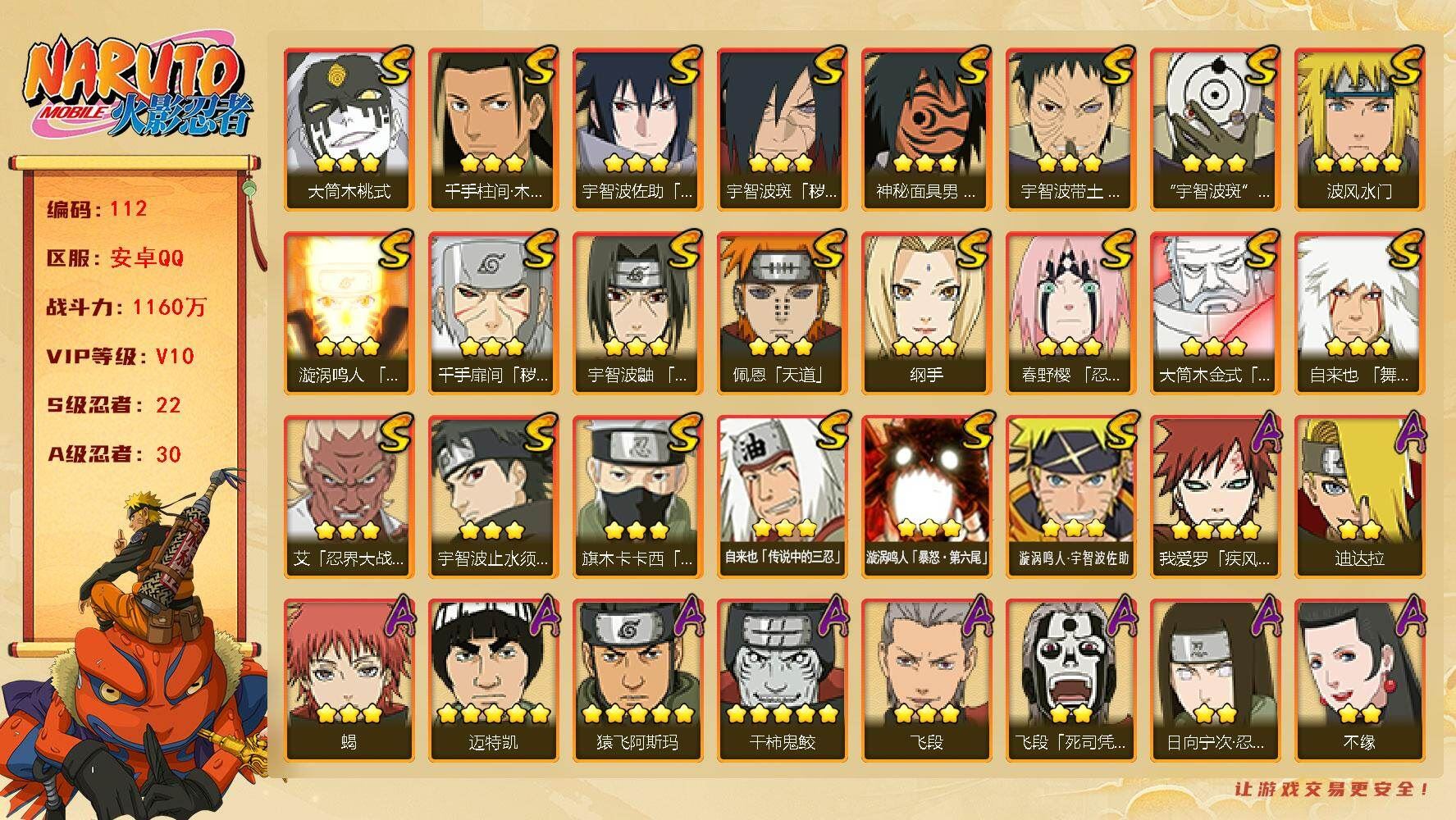 【游戏多多】 【可二次实名】可二次安卓QQ642区 【v10】【1160万战力】22S级忍者数-30A级忍者数【S级忍者】:千手扉间「秽土转生」(3星),宇智波斑「秽土转生·解」(3星),春野樱「忍界大战」(3星),宇智波带土「忍界大战」(3星),艾「忍界大战」(3星),宇智波鼬「须佐能乎」(3星),宇智波止水「须佐能乎」(3星),旗木卡卡西「须佐能乎」(3星),千手柱间「木叶创立」(3星),自来也「舞之豪杰」(3星),自来也「传说中的三忍」(3星),纲手(3星),波风水门(4星),神秘面具男「红夜之刃」(3星),漩涡鸣人「九喇嘛连结」(3星),佩恩「天道」(3星),宇智波佐助「永恒万花筒」(3星),宇智波斑 「白面具」(3星宇智波斑「白面具」),大筒木金式(3星),大筒木桃式(3星),漩涡鸣人「暴怒·第六尾」(3星),漩涡鸣人·宇智波佐助(3星)【A级忍者】:艾「青年」(2星),长门「青年」(2星),波风水门「青年」(2星),迪达拉(2星),飞段(3星),飞段「死司凭血」(2星),干柿鬼鲛(5星),漩涡博人「桃式显现」(2星),机械鸣人「初始形态」(2星),迈特凯(5星),旗木卡卡西「幻之真容」(2星),桃地再不斩「秽土转生」(2星),我爱罗「疾风传」(4星),蝎(3星),蝎「绯流琥」(2星),猿飞阿斯玛(5星),宇智波鼬(2星),宇智波佐助「须佐能乎」(2星),照美冥「五代目水影」(2星),日向宁次「忍界大战」(2星),长十郎「六代目水影」(2星),神秘面具男「忍者之路」(2星),李洛克「忍界大战」(2星),秋道丁次「忍界大战」(2星),千代「近松十人卫」(2星),神农「羁绊」(2星),土台「忍界大战」(2星),不缘(2星),宇智波泉奈(2星),迈特凯「青春爆炸」(2星)各种道具详情看截图、低价出售找回包 赔、截图展示段位不代 表实际段位,如赛季更新等不可抗拒因素发生变化、时限道具不保证所剩时间、标题未写送点劵默认不送【卖号买号首选亿梦】