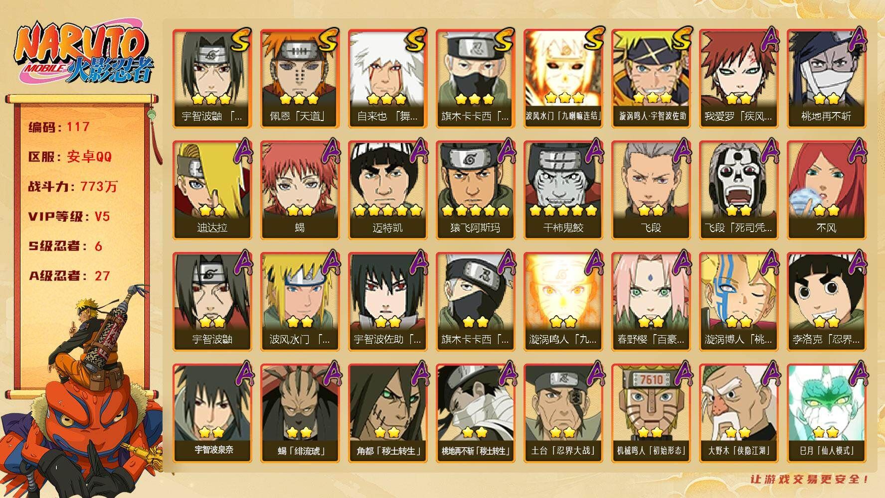 【游戏多多】 【可二次实名】可二次安卓QQ4186区 【V5】【773万战力】6S级忍者数-27A级忍者数【S级忍者】:宇智波鼬「须佐能乎」(3星),旗木卡卡西「须佐能乎」(3星),自来也「舞之豪杰」(3星),佩恩「天道」(3星),波风水门「九喇嘛连结」(3星),漩涡鸣人·宇智波佐助(3星)【A级忍者】:波风水门「青年」(2星),迪达拉(2星),飞段(2星),飞段「死司凭血」(2星),干柿鬼鲛(5星),漩涡博人「桃式显现」(2星),漩涡鸣人「九尾查克拉」(2星),机械鸣人「初始形态」(2星),迈特凯(5星),旗木卡卡西「忍界大战」(2星),桃地再不斩(2星),桃地再不斩「秽土转生」(2星),我爱罗「疾风传」(2星),蝎(2星),蝎「绯流琥」(2星),角都「秽土转生」(2星),猿飞阿斯玛(5星),宇智波鼬(2星),宇智波佐助「万花筒写轮眼」(2星),李洛克「忍界大战」(2星),春野樱「百豪」(2星),土台「忍界大战」(2星),不风(2星),宇智波泉奈(2星),大野木「侠隐江湖」(2星),巳月「仙人模式」(2星),迈特凯「青春爆炸」(2星)各种道具详情看截图、低价出售找回包 赔、截图展示段位不代 表实际段位,如赛季更新等不可抗拒因素发生变化、时限道具不保证所剩时间、标题未写送点劵默认不送【卖号买号首选亿梦】