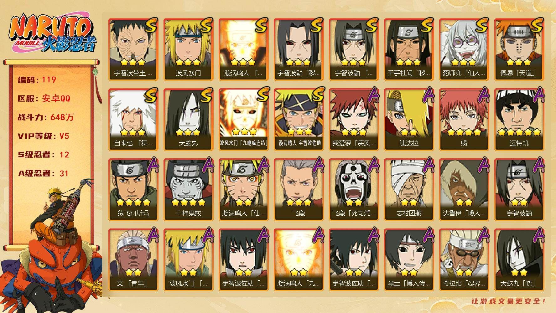 【游戏多多】 【可二次实名】可二次安卓QQ2378区 【V5】【648万战力】 12S级忍者数-31A级忍者数【送金币5037】【S级忍者】:千手柱间「秽土转生」(3星),宇智波鼬「秽土转生」(3星),宇智波带土「忍界大战」(3星),宇智波鼬「须佐能乎」(3星),自来也「舞之豪杰」(3星),大蛇丸(3星),波风水门(3星),药师兜「仙人模式」(3星),漩涡鸣人「九喇嘛连结」(3星),佩恩「天道」(3星),波风水门「九喇嘛连结」(3星),漩涡鸣人·宇智波佐助(3星)【A级忍者】:艾「青年」(2星),波风水门「青年」(2星),达鲁伊「博人传」(2星),迪达拉(2星),大蛇丸「晓」(2星),奇拉比「忍界大战」(2星),飞段(3星),飞段「死司凭血」(2星),干柿鬼鲛(4星),漩涡博人「桃式显现」(2星),漩涡鸣人「仙人模式」(2星),漩涡鸣人「九尾查克拉」(2星),机械鸣人「初始形态」(2星),迈特凯(5星),旗木卡卡西「幻之真容」(2星),我爱罗「疾风传」(3星),蝎(4星),猿飞阿斯玛(4星),猿飞日斩「火影继承人」(2星),宇智波鼬(2星),宇智波佐助「须佐能乎」(2星),宇智波佐助「万花筒写轮眼」(2星),黑土「博人传」(2星),秋道丁次「忍界大战」(2星),千代「近松十人卫」(2星),神农「羁绊」(2星),志村团藏(2星),宇智波泉奈(2星),巳月「仙人模式」(2星),纲手「妖怪奇谭」(2星),迈特凯「青春爆炸」(2星)各种道具详情看截图、低价出售找回包 赔、截图展示段位不代 表实际段位,如赛季更新等不可抗拒因素发生变化、时限道具不保证所剩时间、标题未写送点劵默认不送【卖号买号首选亿梦】