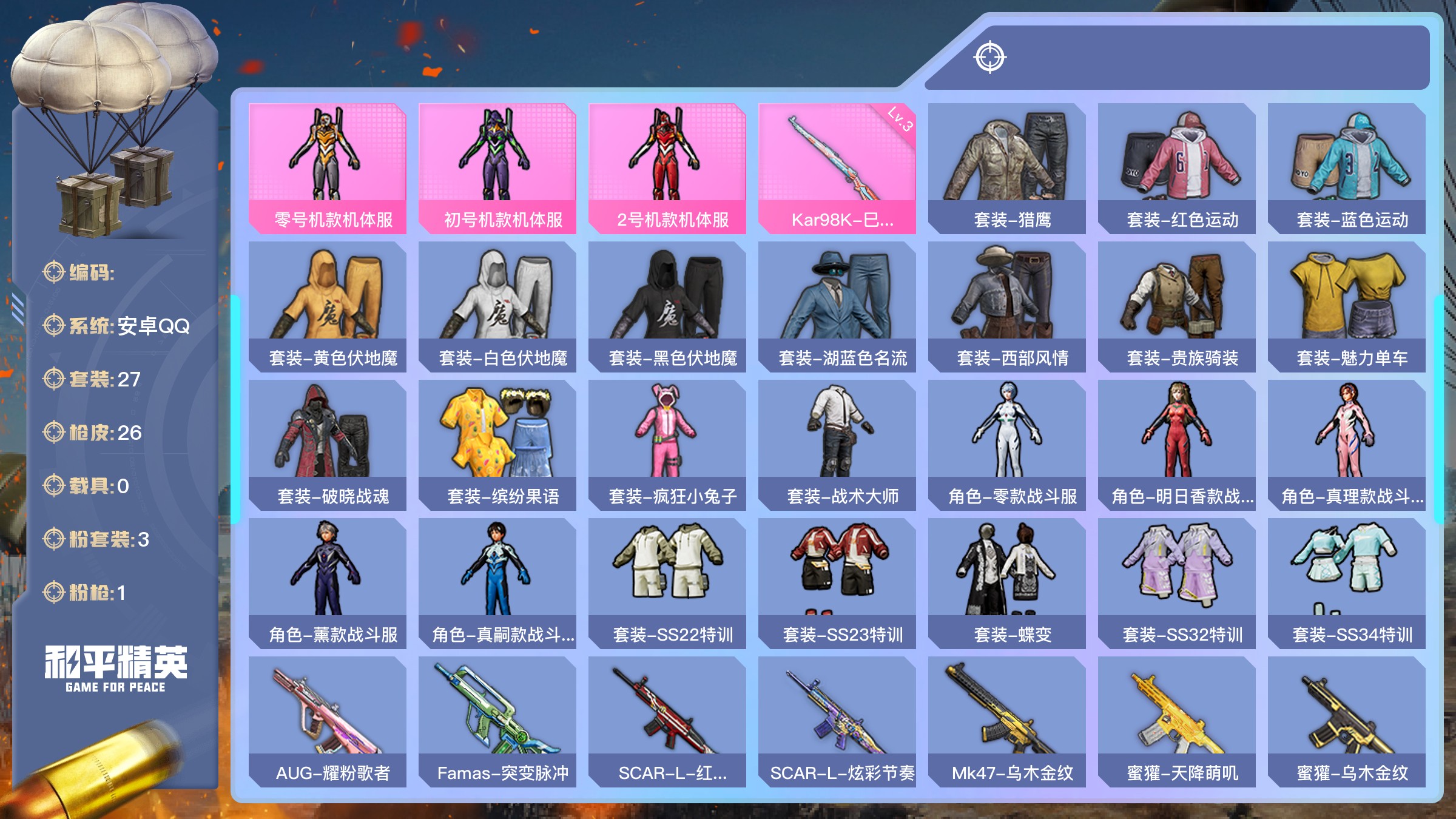 【游戏多多】 【可二次实名】【09x5pdha2】热力值:7933,3粉装,1粉呛,27套装,26呛械,16装备,4降落伞;等级:lv.39 历史最高段位:超级王牌1星 当前段位:荣耀.皇冠ⅱ;王牌印记1次; 【粉色套装】:粉装-零号机款机体服,粉装-初号机款机体服,粉装-2号机款机体服;【粉色呛械】:kar98k-巳巳如意[3级];【其他套装】:套装-猎鹰,套装-红色运动,套装-蓝色运动,套装-黄色伏地魔,套装-白色伏地魔,套装-黑色伏地魔,套装-湖蓝色名流,套装-西部风情,套装-贵族骑装,套装-魅力单车,套装-破晓战魂,套装-缤纷果语,套装-疯狂小兔子,套装-战术大师,角色-零款战斗服,角色-明日香款战斗服,角色-真理款战斗服,角色-薰款战斗服,角色-真嗣款战斗服,套装-ss22特训,套装-ss23特训,套装-蝶变,套装-ss32特训,套装-ss34特训;其他呛械:aug-耀粉歌者,famas-突变脉冲,scar-l-红色方程式,scar-l-炫彩节奏,mk47-乌木金纹,蜜獾-天降萌叽,蜜獾-乌木金纹,m416-糯团青竹,akm-彩虹符号,akm-破晓战魂,m762-天降萌叽,m24-影袭,莫辛纳甘-乌木金纹,mk14-冰河战士,mk20-h-乌木金纹,aks-74u-乌木金纹,汤姆逊-天降萌叽,uzi-冰河战士,dbs-创世救赎,dbs-乌木金纹,s1897-糯团青竹,dp-28-彩虹符号,mg3-幻世战舞者,mg3-乌木金纹,破片手留单-海盐豹豹;【其他降落伞】:ss22王牌降落伞,普通降落伞,夏日倾情降落伞,冰河战士降落伞;详情看图【实际信息请以最终验号结果为准】【安卓qq】【可二次实名】【无】
