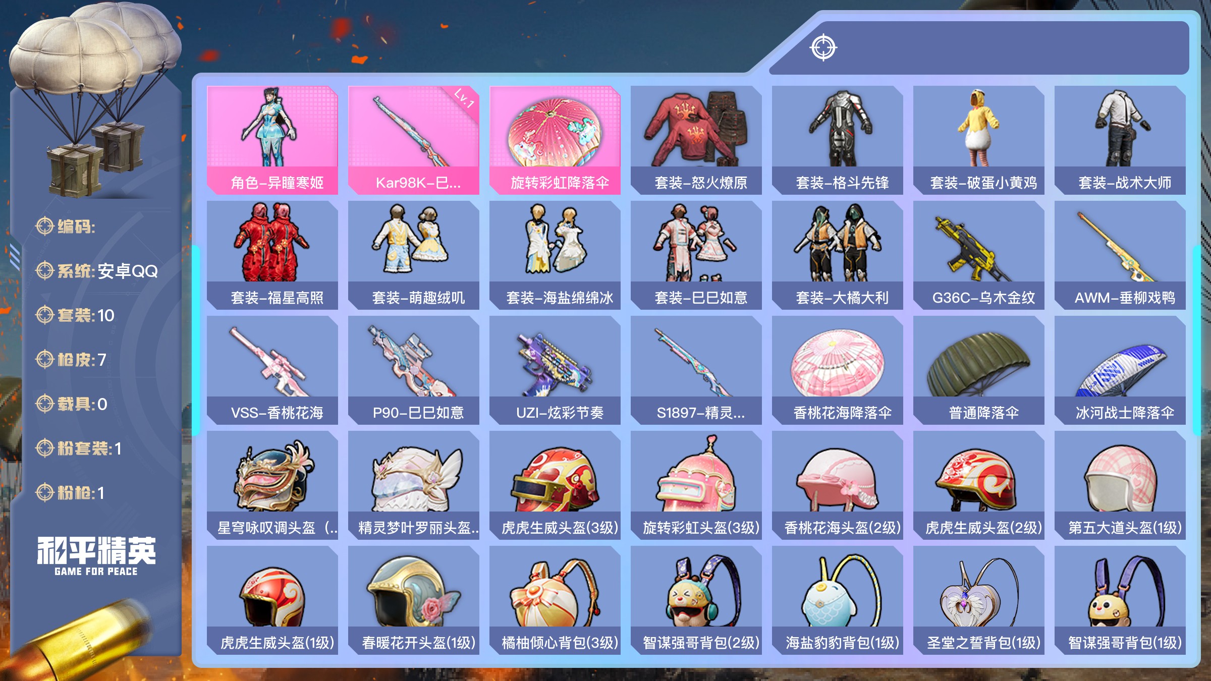 【游戏多多】 【可二次实名】永恒黄蜂!银碳小老虎!蜜语绒猫!D10913.安卓QQ-70套装7粉装6粉枪1个满级4载具2飞行器【稀有资产】玩偶服-美羊羊/套装-银碳小老虎 【粉色套装】套装-金属狂野/套装-青空秋雨/套装-粉樱探戈/角色-大黄蜂/角色-阿尔茜/角色-圣堂之誓/套装-蜜语绒猫 【粉色枪皮】M416-五爪金龙[5级]/AKM-梦之光华[5级]/Kar98K-巳巳如意[5级]/UMP45-宇宙意志[3级]/M249-猪猪侠[3级]/DP-28-豹影疾电[1级] 【载具】擎天重拳/玛莎拉蒂Quattroporte(夜幕蓝)/永恒黄蜂/幻影随行 【飞行器】歌者泠鸢飞行器 【珍稀背包】百万伏特背包(3级)/百万伏特背包(2级)/