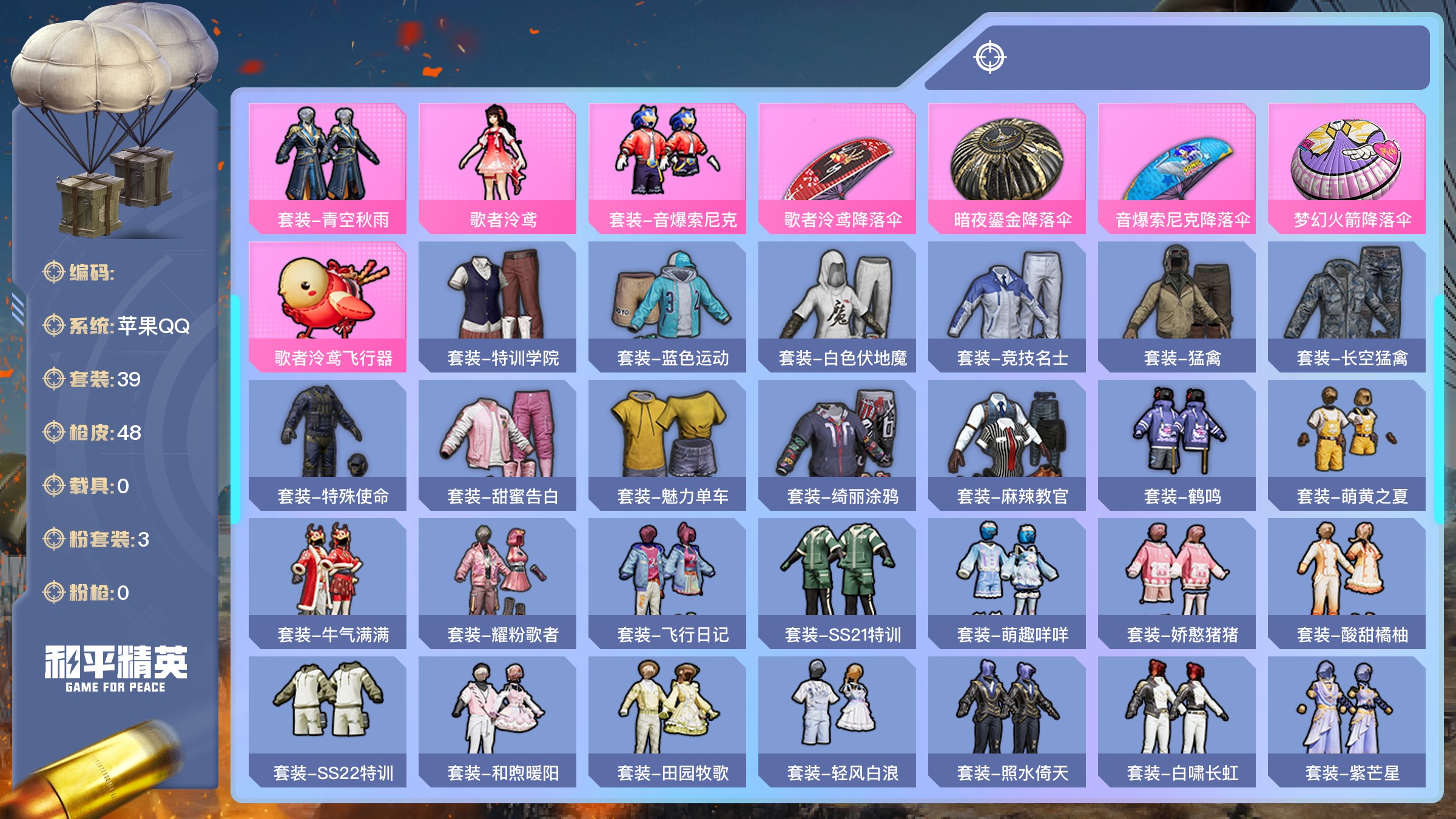 【游戏多多】 【可二次实名】【0vss5aacg】热力值:15523,3粉装,5粉色战备,39套装,48呛械,70装备,2滑翔尾翼,19降落伞;等级:lv.50 历史最高段位:超级王牌2星 当前段位:坚韧.铂金ⅱ;王牌印记2次; 【粉色套装】:粉装-青空秋雨,粉装-歌者泠鸢,粉装-音爆索尼克;【粉色滑翔尾翼】:歌者泠鸢飞行器;【粉色降落伞】:歌者泠鸢降落伞,暗夜鎏金降落伞,音爆索尼克降落伞,梦幻火箭降落伞;【其他套装】:套装-特训学院,套装-蓝色运动,套装-白色伏地魔,套装-竞技名士,套装-猛禽,套装-长空猛禽,套装-特殊使命,套装-甜蜜告白,套装-魅力单车,套装-绮丽涂鸦,套装-麻辣教官,套装-鹤鸣,套装-萌黄之夏,套装-牛气满满,套装-耀粉歌者,套装-飞行日记,套装-ss21特训,套装-萌趣咩咩,套装-娇憨猪猪,套装-酸甜橘柚,套装-ss22特训,套装-和煦暖阳,套装-田园牧歌,套装-轻风白浪,套装-照水倚天,套装-白啸长虹,套装-紫芒星,套装-绚烂繁星,套装-熠彩粉晶,套装-光之冒险,套装-ss23特训,套装-飞狐塔尔斯,套装-妙红点点,套装-幻彩翩翩,套装-王牌教练,套装-柠萌假日;其他呛械:groza-田园牧歌,scar-l-红色方程式,akm-彩虹符号,蜜獾-天降萌叽,蜜獾-娇憨猪猪,m762-彩虹符号,m762-天降萌叽,m762-暗夜鎏金,aug-耀粉歌者,mk47-乌木金纹,mk47-妙红点点,mk47-百万伏特,ac-val-天降萌叽,m416-暗夜行者,m416-糯团青竹,amr-暗夜行者,amr-妙红点点,莫辛纳甘-乌木金纹,kar98k-梦幻火箭,awm-音爆索尼克,slr-娇憨猪猪,mini14-旋转彩虹,mini14-梦幻火箭,m417-星兔领航员,vss-田园牧歌,汤姆逊-暗夜鎏金,汤姆逊-耀粉歌者,ump45-蓝色火焰,vect-田园牧歌,vect-音爆索尼克,uzi-墨染幽兰,uzi-娇憨猪猪,野牛-桃夭倾城,s1897-暗夜鎏金,dbs-歌者泠鸢,s12k-娇憨猪猪,s686-红色方程式,spas-12-田园牧歌,m249-破晓战魂,m249-妙红点点,mg3-妙红点点,mg3-乌木金纹,mg3-暗夜行者,mg3-青空秋雨,平底锅-娇憨猪猪,平底锅-田园牧歌,平底锅-光之冒险,平底锅-妙红点点;【其他滑翔尾翼】:粉色滑翔尾迹;【其他降落伞】:娇憨猪猪降落伞,墨染幽兰降落伞,绚烂橙彩降落伞,ss22王牌降落伞,蓝海之火降落伞,ss23王牌降落伞,钢铁雄心降落伞,田园牧歌降落伞,暗夜行者降落伞,绿草茵茵降落伞,妙红点点降落伞,普通降落伞,寂夜之火降落伞,勇者同行降落伞,光之冒险降落伞;【伙伴】:伙伴-呆呆,伙伴-啾啾,伙伴-盔仔,详情看图【实际信息请以最终验号结果为准】【苹果qq】【可二次实名】【无】