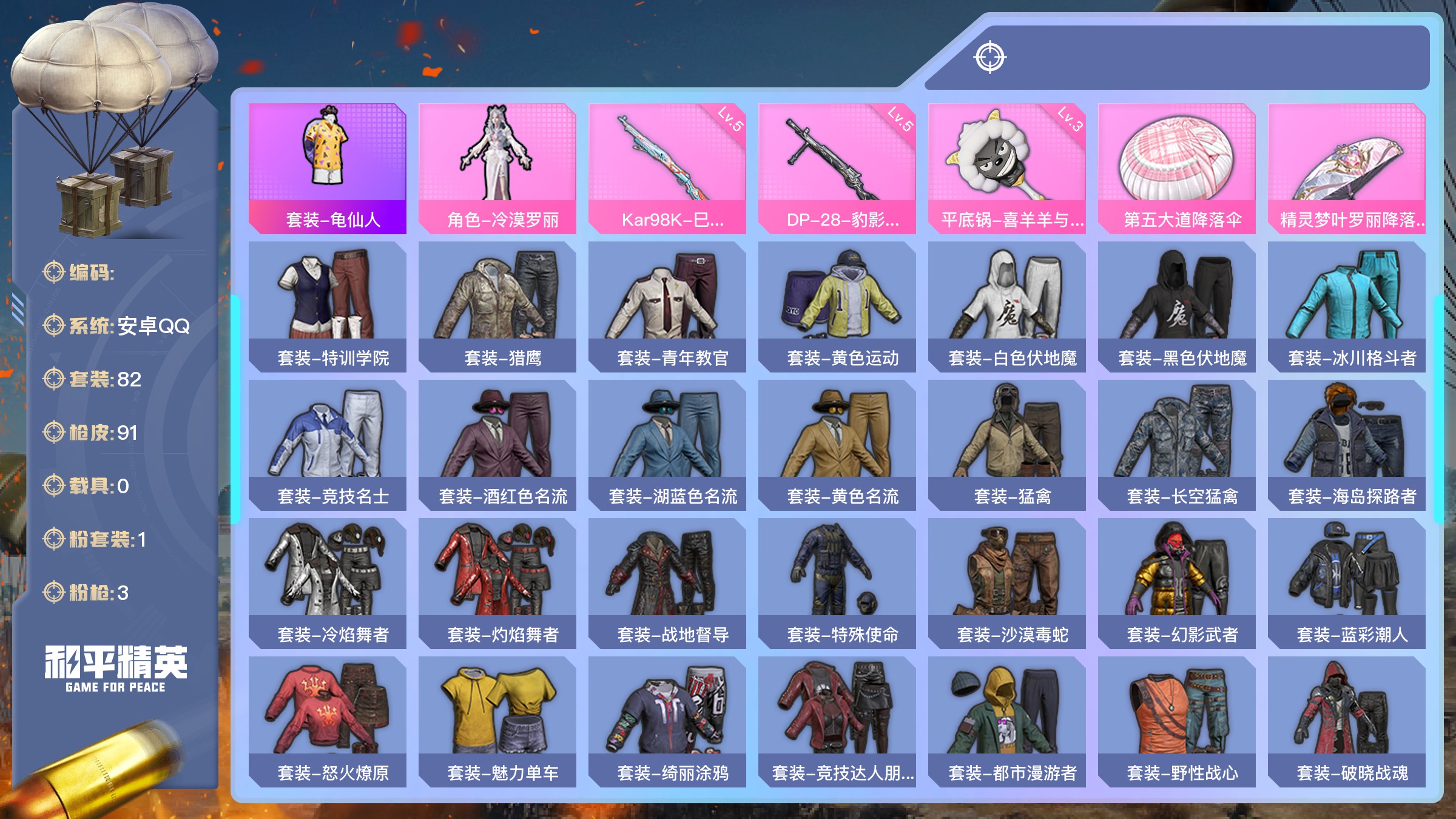 【游戏多多】 【可二次实名】一色螳螂!极限特训!清风波束!可二次!D10867安卓QQ3粉3枪 【枪械数量】225 【粉枪械数量】3 【粉套装数量】3 【载具数量】0 【飞行器数量】1 【稀有资产】角色-零号机款机体服/角色-明日香款战斗服/角色-零款战斗服/套装-粉红小猪/套装-雪山精英/套装-浪漫波比/角色-都市丽猫/角色-摩登魅猫/套装-冷酷挑战者 【粉色套装】套装-极限特训/套装-星穹咏叹调 【粉色枪皮】AKM-绿萝繁花[5级]/M762-青锋波束[5级]/Kar98K-巳巳如意[5级] 【飞行器】英伦信使飞行器 【珍稀背包】洛神天依背包(2级)/