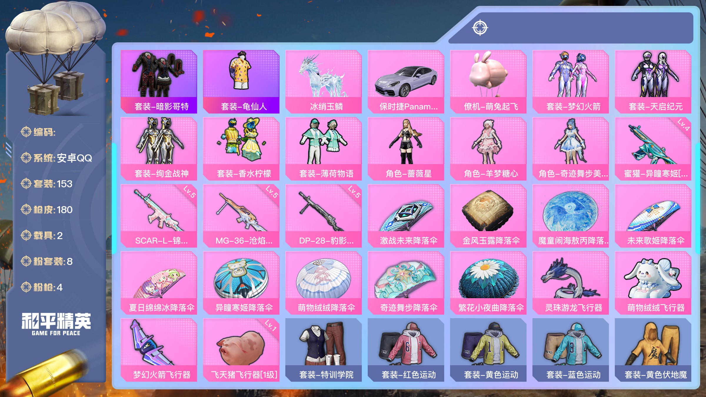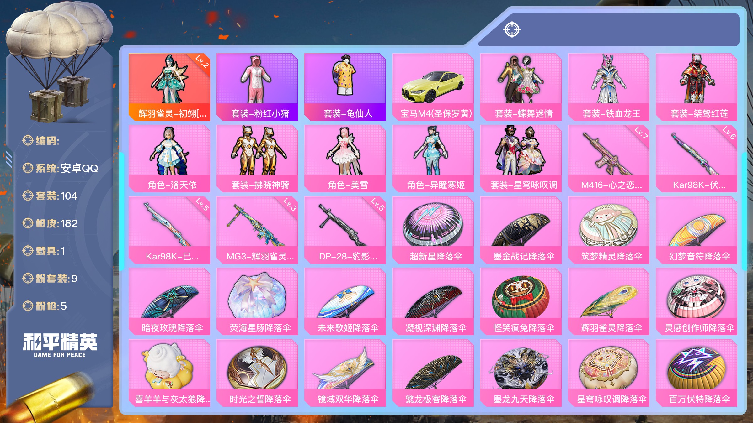 【游戏多多】 【06qoidaca】热力值:91281,11粉装,12粉呛,2载具,23粉色战备,203套装,271呛械,348装备,9滑翔尾翼,79降落伞;等级:lv.66 历史最高段位:超级王牌12星 当前段位:荣耀.皇冠ⅴ;王牌印记10次 卓越印记4次 传奇印记1次; 【热门套装】:套装-赤蝎幽灵,套装-都市猎人,套装-浪漫天命,套装-奇异狩猎者,套装-暗影哥特,套装-深海小丑鱼,套装-小丑鱼,角色-mark.06;【粉色套装】:粉装-未来战士,粉装-甜心巧克力,粉装-天使彩虹糖,粉装-梦幻火箭,粉装-王牌四分卫,粉装-放客神游,粉装-天禅智恒,粉装-炙焰红王,粉装-雪月幻音,角色-冷漠罗丽,角色-荧海星豚;【粉色呛械】:scar-l-魔童闹海哪吒[3级],蜜獾-荧海星豚[5级],akm-梦之光华[4级],m416-超新星[9级],m416-女娲灵识[3级],m416-心之恋语[1级],kar98k-巳巳如意[5级],aks-74u-星穹咏叹调[7级],p90-冷漠罗丽[5级],dp-28-豹影疾电[5级],mg-36-沧焰双生[5级],破片手留单-瓶中星球[7级];【粉色载具】:冰绡玉鳞,黑曜夜骑;【粉色滑翔尾翼】:节奏起飞飞行器,梦幻火箭飞行器,齐天大圣飞行器,灵珠游龙飞行器,镜光幻境飞行翼,灵猫魔法师飞行器,御兔特攻飞行器;【粉色降落伞】:甜心宝贝降落伞,未来战士降落伞,葫芦兄弟降落伞,百万伏特降落伞,湮灭星辰降落伞,幻影战神降落伞,灵猫魔法师降落伞,冷漠罗丽降落伞,荧海星豚降落伞,魔童闹海敖丙降落伞,环太平洋降落伞,辉羽雀灵降落伞,神秘黑猫降落伞,喜羊羊与灰太狼降落伞,星穹咏叹调降落伞,梦幻火箭降落伞;【其他套装】:套装-红色运动,套装-黄色运动,套装-蓝色运动,套装-黄色伏地魔,套装-白色伏地魔,套装-黑色伏地魔,套装-骑行爱好者,套装-深海格斗者,套装-竞技名士,套装-湖蓝色名流,套装-黄色名流,套装-猛禽,套装-野性山猫,套装-长空猛禽,套装-漫步者,套装-竞技勇士朋克,套装-黎明保卫者,套装-雨林探路者,套装-沙漠探路者,套装-六六大吉,套装-冷焰舞者,套装-特战装甲,套装-特殊使命,套装-青春校园,套装-灰色格斗者,套装-甜蜜告白,套装-迎春赐吉,套装-龙腾端午,套装-燃烧卡路里,套装-鹰眼刺客,套装-冰冻风暴,套装-冷酷挑战者,套装-幻影武者,套装-热血骑手,套装-特战英豪,套装-红潮炫舞,套装-蓝彩潮人,套装-魅力单车,套装-耀眼新星,套装-竞技达人朋克,套装-夜莺强袭者,套装-都市漫游者,套装-野性战魂,套装-超能勇士,套装-破晓战魂,套装-风行保卫者,套装-热血青春,套装-沙漠兵团,套装-丛林猎人,套装-雪山精英,套装-传奇侦探,套装-极地朋克,套装-幻世战舞者,套装-甜蜜菠萝,套装-蓝调潮人,套装-弄潮海豚,套装-迅捷狂鲨,套装-呆萌铁蟹,套装-夏日倾情,套装-甜蜜熊情侣,套装-青涩时光,套装-缤纷果语,套装-龙魂突击队,套装-风暴特警,套装-冰川特警,套装-海上生明月,套装-麻辣教官,套装-东方飞龙,套装-迷域探索者,套装-军械专家,套装-北国孤狼,套装-ss6特训,套装-跃动心情,套装-ss7特训,套装-霓虹街区,套装-ss10特训,套装-ss8特训,套装-智慧之神,套装-白熊同盟,套装-萌黄之夏,套装-摇滚狂鲨,套装-夏日音浪,套装-ss9特训,套装-顽皮玉兔,套装-探宝勇士,套装-粉甜马卡龙,套装-牛气满满,套装-ss11特训,套装-潮流游乐家,套装-原初圣火,套装-逆风勇士,套装-萌趣颜团子,套装-特种颜团子,套装-战术大师,套装-ss12特训,套装-牛气冲天,套装-闪金天王,套装-镭射皇者,套装-银白舞王,套装-迅捷之星,套装-治愈之星,套装-科技之星,套装-飞行日记,套装-ss13特训,套装-曼妙人鱼,套装-热情海星,套装-纯真浪花,套装-冰爽海盐,套装-ss14特训,套装-星梦畅游,套装-ss15特训,角色-英勇保护者,套装-ss17特训,套装-福星高照,套装-ss19特训,套装-炫蓝之夏,套装-ss20特训,套装-猎梦纪元,套装-甜心亚梦,套装-虚音幻奏,套装-ss21特训,套装-萌趣咩咩,套装-娇憨猪猪,套装-樱桃黑巧,套装-玉兔迎春,套装-ss22特训,套装-轻风白浪,套装-光之冒险,套装-ss23特训,套装-柠萌假日,套装-青玉碎影,套装-冰河战士,套装-恋语绒绒,套装-ss28特训,套装-蝶变,套装-湖畔霞光,套装-小熊娃娃,套装-ss29特训,套装-虚空漩涡,套装-雏菊兔兔,套装-萝兰蝴蝶,角色-紫俏灵猫,套装-异域银装,角色-摩登魅猫,套装-星途旅人,套装-ss30特训,套装-青团波波,套装-棉花软糖,套装-绒绒粉兔,套装-糖糖葫芦,套装-墨青刃影,套装-ss31特训,套装-鱼渊荷华,套装-燕燕于飞,套装-紫幽梦,套装-粉恋花,套装-ss33特训,套装-云朵鹅,套装-ss32特训,套装-彩虹兔,套装-樱梦幻音,套装-蓝冰羽,套装-顶瓜瓜,套装-雪绒豹,套装-大橘大利,角色-时希公主,角色-灵公主,角色-鲛海歌灵,套装-星渊小夜曲,套装-蜜露汐语,套装-星影赞美诗,角色-乐音,玩偶服-懒羊羊,玩偶服-喜羊羊,套装-元气之梦,套装-折梦之诗,套装-ss34特训,套装-擎苍青焰,套装-朱霞炽焰,套装-凌霄紫焰,套装-薄荷星砂,套装-ss35特训,套装-午间小调,套装-萌鸡速递;其他呛械:m16a4-乌木金纹,m16a4-幻世战舞者,m16a4-甜心亚梦,m16a4-红色方程式,m16a4-夜灯,m16a4-冰河战士,mk47-湮灭星辰,mk47-百万伏特,mk47-乌木金纹,mk47-风迹短诗,groza-影袭,groza-田园牧歌,groza-海盐豹豹,groza-荧海星豚,groza-生命誓言,groza-乌木金纹,groza-治愈之星,scar-l-炫彩节奏,scar-l-玉兔迎春,scar-l-星途旅人,scar-l-乌木金纹,scar-l-冷漠罗丽,scar-l-夏日绵绵冰,scar-l-未来战士,scar-l-黄金龙骨,arx-凌霄紫焰,蜜獾-风迹短诗,蜜獾-天降萌叽,蜜獾-糖糖葫芦,蜜獾-冰澜龙吟,蜜獾-折梦之诗,蜜獾-娇憨猪猪,蜜獾-乌木金纹