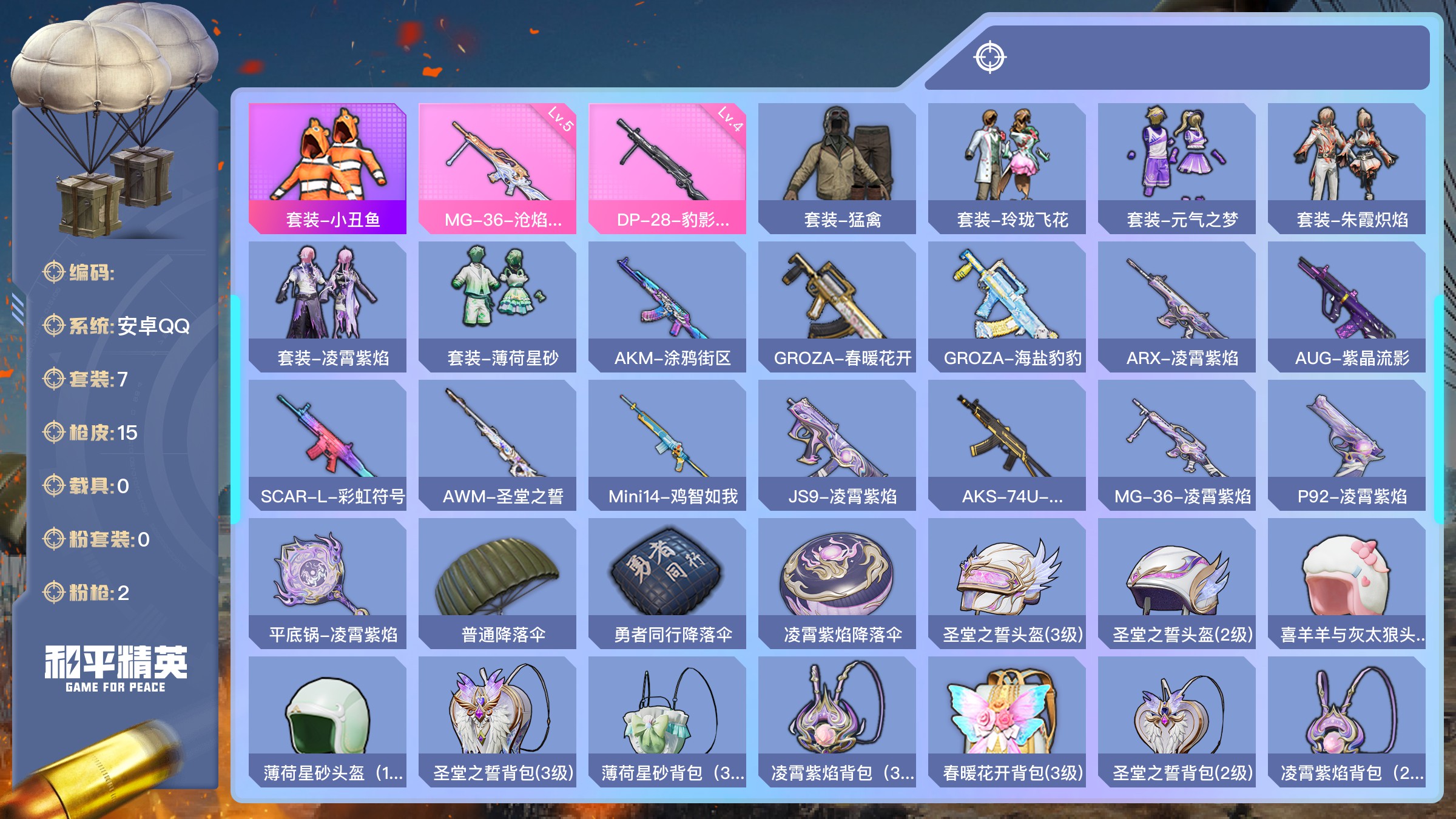 【游戏多多】 【037mnhhac】热力值:3785,2粉呛,7套装,15呛械,15装备,3降落伞;等级:lv.14 历史最高段位:不屈白银ⅳ 当前段位:不屈.白银ⅳ;; 【热门套装】:套装-小丑鱼;【粉色呛械】:mg-36-沧焰双生[5级],dp-28-豹影疾电[4级];【其他套装】:套装-猛禽,套装-玲珑飞花,套装-元气之梦,套装-朱霞炽焰,套装-凌霄紫焰,套装-薄荷星砂;其他呛械:akm-涂鸦街区,groza-春暖花开,groza-海盐豹豹,arx-凌霄紫焰,aug-紫晶流影,scar-l-彩虹符号,awm-圣堂之誓,mini14-鸡智如我,js9-凌霄紫焰,aks-74u-乌木金纹,mg-36-凌霄紫焰,p92-凌霄紫焰,平底锅-凌霄紫焰;【其他降落伞】:普通降落伞,勇者同行降落伞,凌霄紫焰降落伞;【伙伴】:伙伴-盔仔,详情看图【实际信息请以最终验号结果为准】【安卓qq】【不可二次实名】【无】
