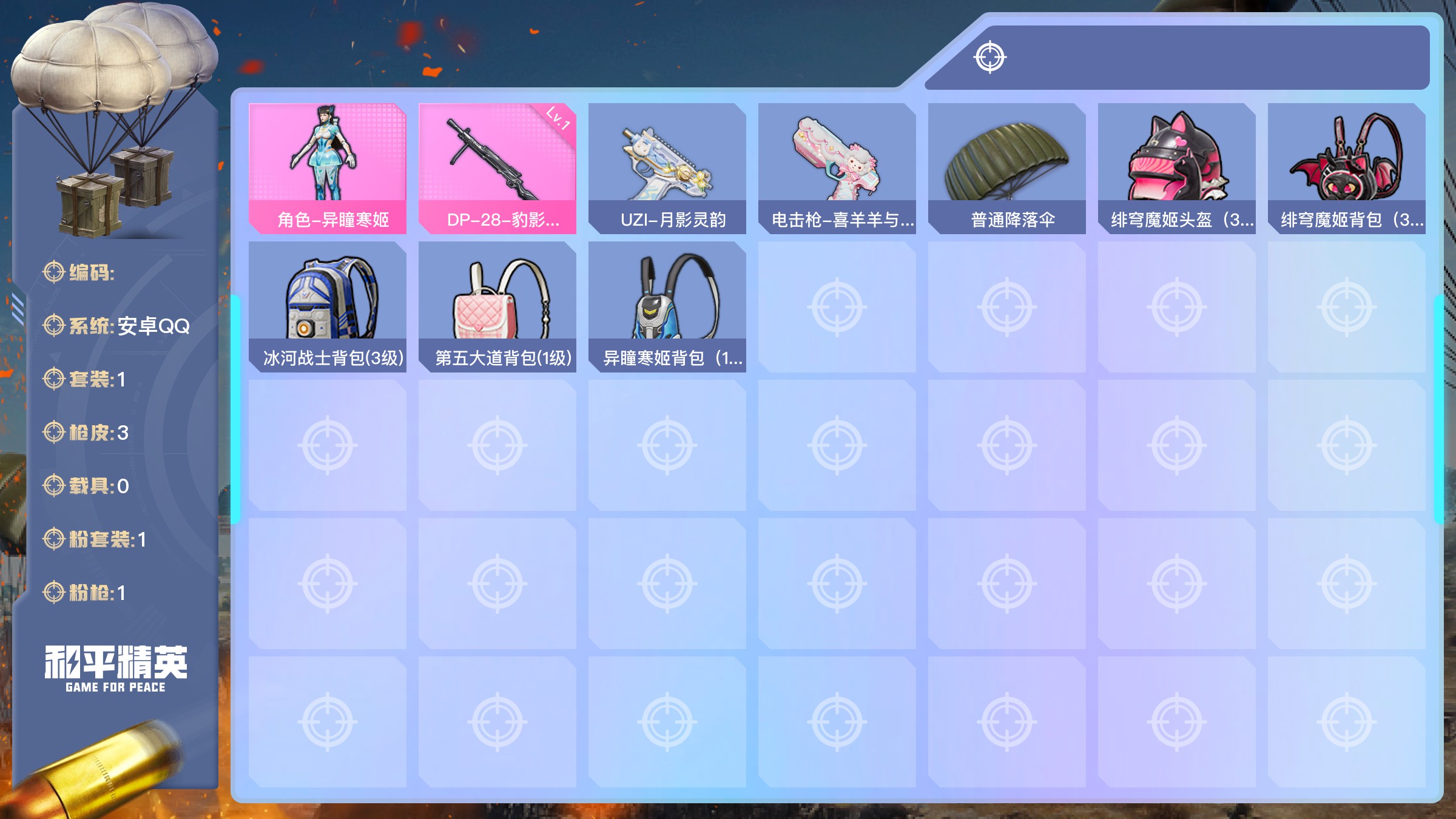 【游戏多多】 【可二次实名】【037mn1af1】热力值:860,1粉装,1粉呛,1套装,3呛械,6装备,1降落伞;等级:lv.5 历史最高段位:热血青铜ⅴ 当前段位:热血.青铜ⅴ;; 【粉色套装】:角色-异瞳寒姬;【粉色呛械】:dp-28-豹影疾电[1级];其他呛械:uzi-月影灵韵,电击呛-喜羊羊与灰太狼;【其他降落伞】:普通降落伞;【伙伴】:伙伴-盔仔,详情看图【实际信息请以最终验号结果为准】【安卓qq】【可二次实名】【无】