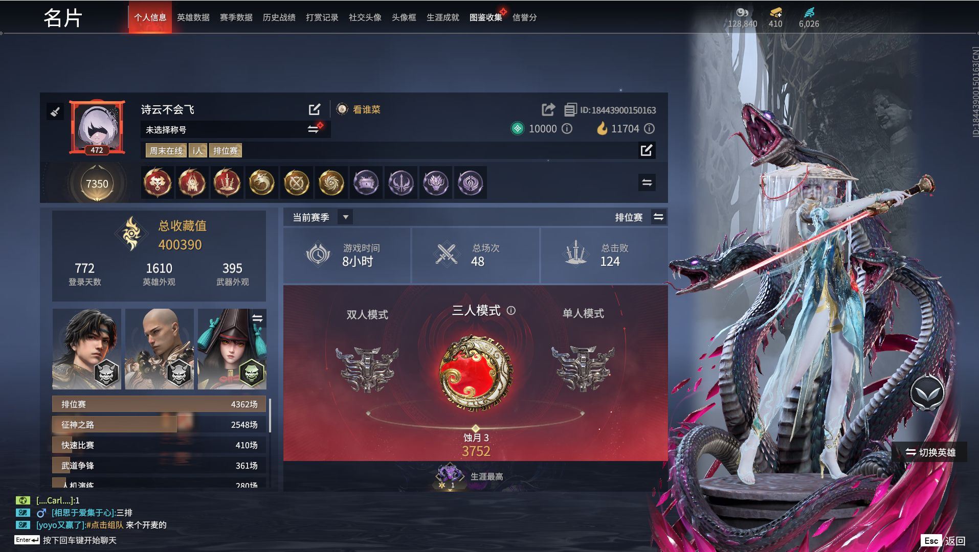 【游戏多多】 r50483 永杰网易手机【总收藏值】 169886 【游戏等级】 284 【游戏段位】 单排黄金5, 双排黄金3, 三排黄金5 【通行证等级】 通行证未升级Lv.2 【技能奥义】 珥冰 宁红夜: 夜华朝/蜘蛛精/簪缨发 沈妙: 星辉魔纱 天海: 化生明王/悟净/八宝龙王 殷紫萍: 伏苓发 特木尔: 唐三/海神发 季沧海: 巨阙/杰洛特/江海发/含锋发/白狼发 胡桃: 贵胄少女/清雅少女/月丹发 妖刀姬: 樱雨刀舞 崔三娘: 无拘/阿娜希塔 无尘: 朝闻道/申公豹/柳生 顾清寒: 龙吉公主/禄运玉霄/金襦玉衫/绯霜发/红鸾星发 武田信中: 枫狩 迦南: 玉叶景/瀚海苍鹰/琳琅发 胡为: 监兵凶神/蛤蟆头领/福瑞天泽 季莹莹: 持国天王/干将莫邪/缱绻发 玉玲珑: 赤羽/妲己/日影花阴/笼烟芍药发 哈迪: 云中君/夜绸袍/天工奥妙/秀逸发 魏轻: 执金/热力节拍/玉脍/獬豸/玄冥发 刘炼: 姜子牙/仙风发 席拉: 暧冬茶馨/雪铃绮歌/蜜语发 蓝梦: 牵云霞发 万钧: 炽羽尘光发 拳刃: 天狐/无相印/醒狮/镇恶 长剑: 亢龙/壶中日月/永乐/炼/隐锋 太刀: 切影/念珠丸/数珠丸/暝视 横刀: 帝星/无韵/烛泪 阔刀: 狼主/听涛_/破天/青石猊 斩马刀: 潮/麒麟牙 枪: 仙彩/建木/灵木角/焦钰/藤魂/长虹 棍: 冰辉/糖果棍/降魔 匕首: 仙舞/判官笔/曼提柯尔之牙/残霄/马首刀 扇: 耀夜流华/腾云歌/舞扇 双截棍: 咯咯/嘶风/夔牛槌/精武 双刀: 怨憎/登山镐/破重云/蛋仔派对咸鱼 双戟: 惊百里/光影裁决/隐天渊 连弩: 乱风云/天牛翼/穿云燕 鸟铳: 引冰落/戏祥云 火炮: 钻山/雪国礼炮/龙啸 五眼铳: 凝冰魄/心魔/梦魇/迎宵 弓箭: 乌木弓/豹胎易筋弓/逆逢 一窝蜂: 莲心剑雨 喷火筒: 炎魔 7红色神品: 星辉魔纱/化生明王/监兵凶神/帝星/狼主/惊百里/墨离 挂饰: 明心/脑子给我/雪鹿雌角/红绒暖女/烟云聚/业火残红笛/福虎帽/簪金缨/万息铜钱/骇人面具/夜露帽/火烬/红绒暖男/倾城/封神榜/癸卯兔/喵彩/雁落笠/防风帽/安歌帽/炎流云禅笠/甲辰龙/梦棠/婵娟/伏魔杵/千手/狼首腰扣/鲛人角/吕布铁面/昼隐/鎏金螭龙/葫芦兄弟蛤蟆头/鸠羽帽/兔尾/鬼神引/龙葵拂/窥鲸镜/红玉壶/狼面具/风羽面/苍鹰之羽/粽香远/军令状/叠嶂宝鉴/月宫秋/虎绒耳/蛛丝坠/玉井印/碎釜/鹿铃角/蛋仔派对条状眼镜/桂花糕/飞狐帽/阴阳灵狐/委蛇朱冠/捆龙索/曜石面具/避彩/熔金峰/团上头了/雪鹿雄角/怜光满/缕金魄/金瑛冠/真的抱歉/捕光镜/糖心/浣云巾/霞彩/青莲唤云铃/探险家墨镜/雾隐繁花/戏鱼灯 飞索: 墨离,各种道具详情看截图、低价出售找回包 赔、截图展示段位不代 表实际段位,如赛季更新等不可抗拒因素发生变化、时限道具不保证所剩时间、标题未写送点劵默认不送【卖号买号首选亿梦】