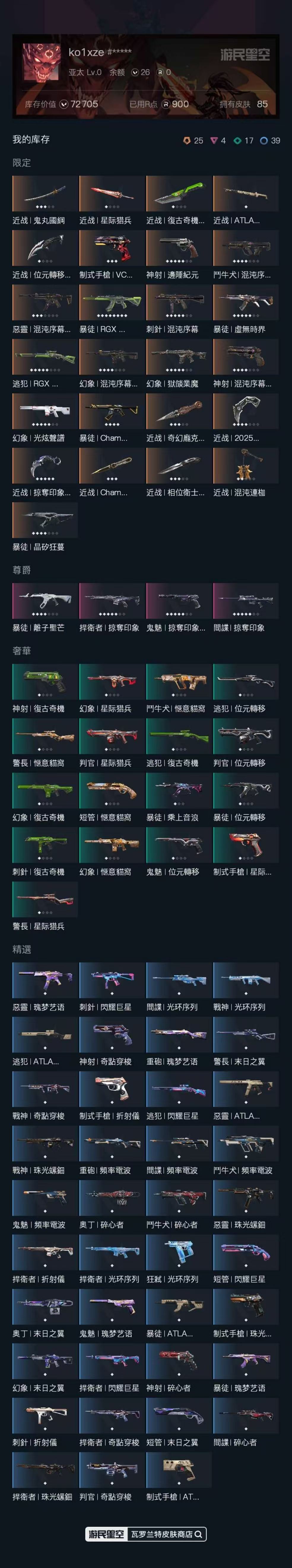 【游戏多多】 ff4443 港服 超凡1 库存9.04W 怜悯之刃 鬼丸国纲 电光钳 掠夺爪 边陲斧 显卡2.0蝴蝶刀 盖亚之愠 电玩獠犬 边陲飞将 边陲正义 全息狂怒 虚无正义 LEV标配 混沌短炮 混沌ak 显卡ak 虚无ak 混沌狙 哨兵正义 噬影者ak 天界鬼魅 起源雄鹿 盖亚ak 紫金ak 弃王狙 离子狙 掠夺ak 离子2.0ak 盖亚飞将 侦查幻影 假面幻影 掠夺狙 源能幻影 海洋ak 弃王骇灵 假面戍卫