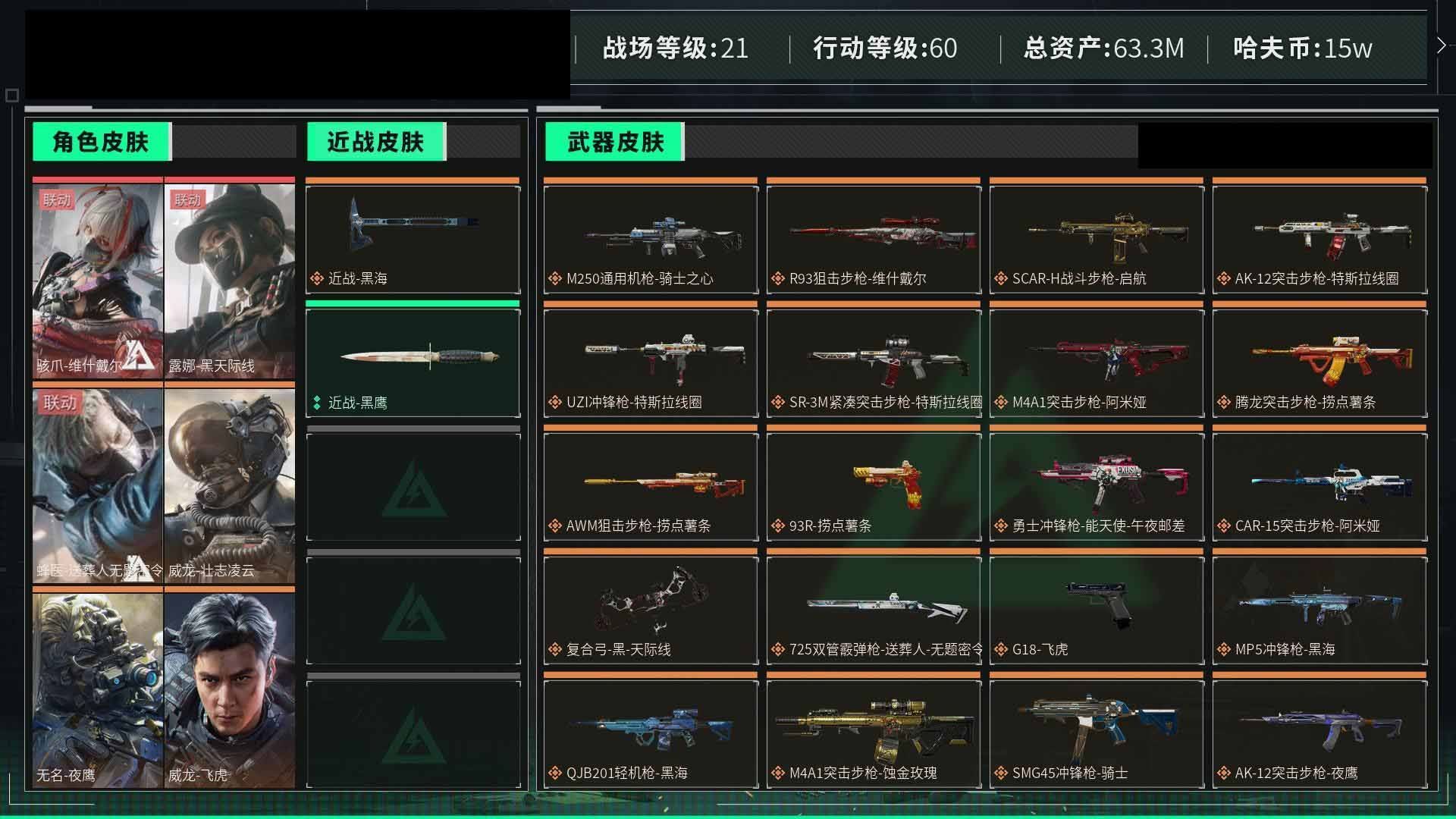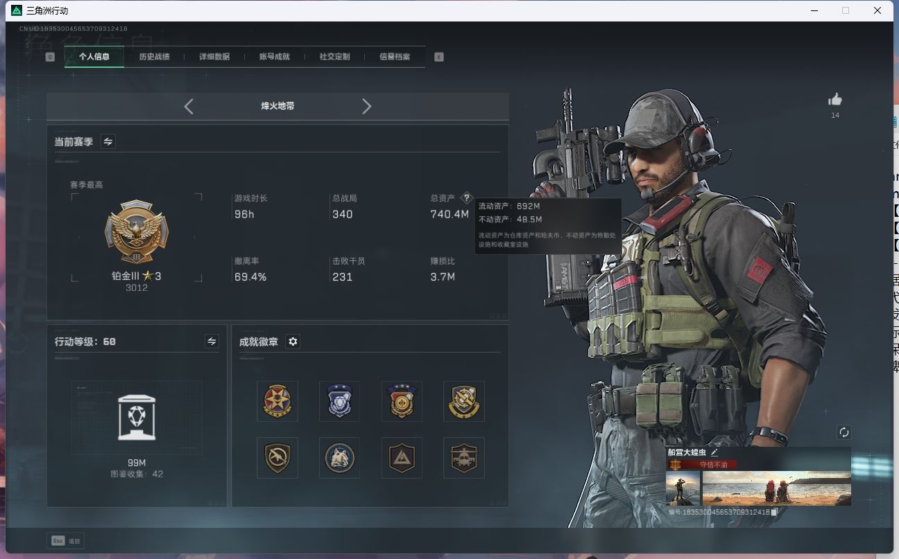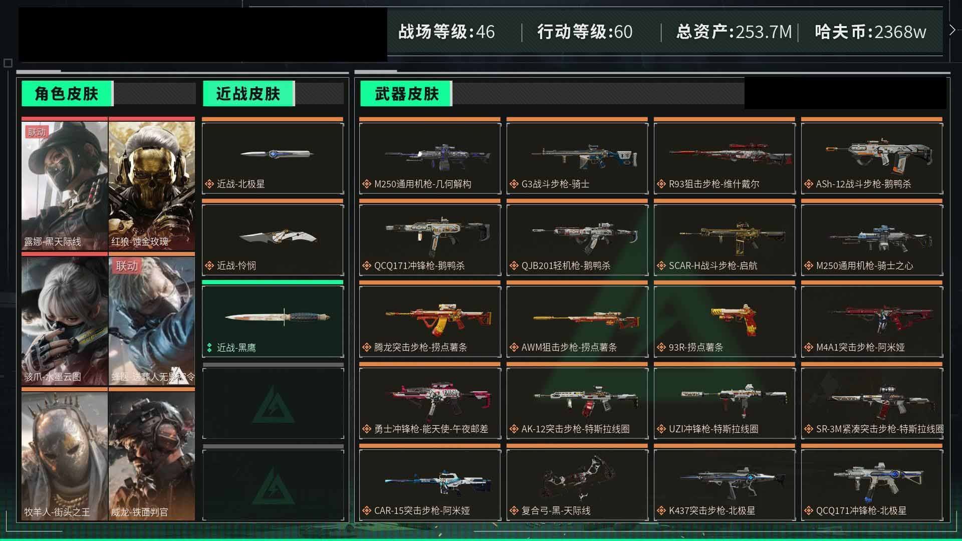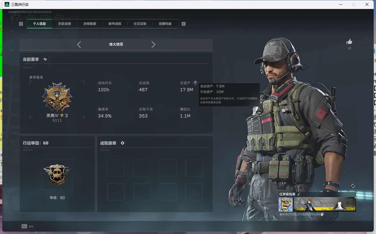 【游戏多多】 ljh AK025667 包人脸 行动等级60黑鹰 总资产48.4m【亮点解析 3*3安全箱】【M250通用机枪-几何解构ASh-12战斗步枪-鹅鸭杀0CQ171冲锋枪-鹅鸭杀0J日201轻机枪-鹅鸭杀SCAR-H战斗步枪-启航M14射手步枪-电锯惊魂G3战斗步枪-骑士AK-12突击步枪-特斯拉线园 AK-12突击步枪-特斯拉线园UZ1冲锋枪-特斯拉线园SR-3M紧凑突击步枪-特斯拉线园联动 M4A1突击步枪-阿米娅联动 勇士冲锋枪-能天使-午夜邮差腾龙突击步枪-捞点薯条AWM狙击步枪-捞点薯条 联动 CAR-15突击步枪-阿米娅联动 复合弓-黑-天际线M4A1突击步枪-蚀金玫瑰联动 725双管弹枪-送葬人-无题密令K437突击步枪-极速狂飙SMG-45冲锋枪】【近战 北极星 黑鹰】【角色皮肤 蚀金玫瑰 飞虎队 壮志凌云 夜鹰 无题密令 街头之王 黑天际线】----安全箱等时效性道具请以游戏内数据为准:详情请看图----截图展示段位不代实际段位,赛季更新等不可抗拒因素发生变化、时限道具不保证所剩时间、标题未写送三角币默认不送】【主播担保+安全至上+性价比 买号卖号只选金牌商家一左友】