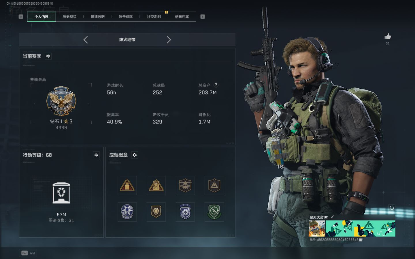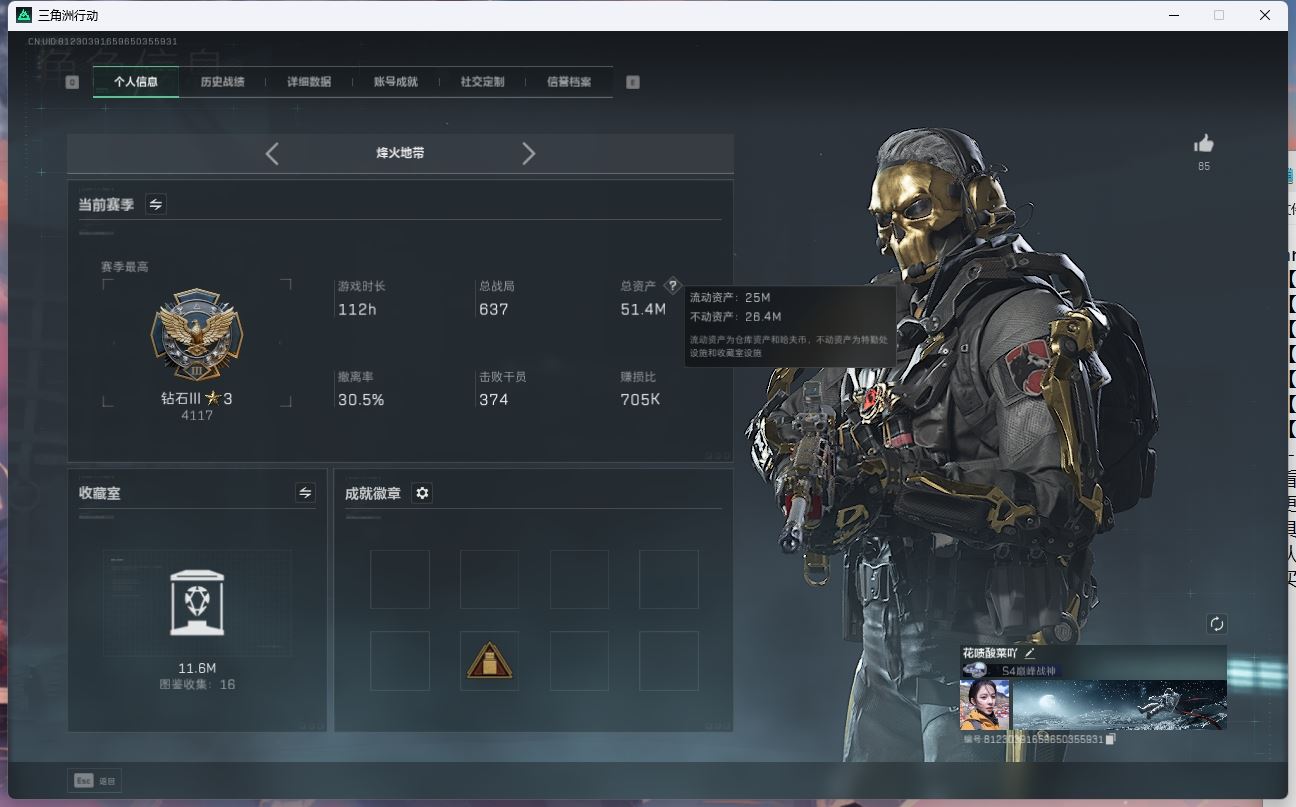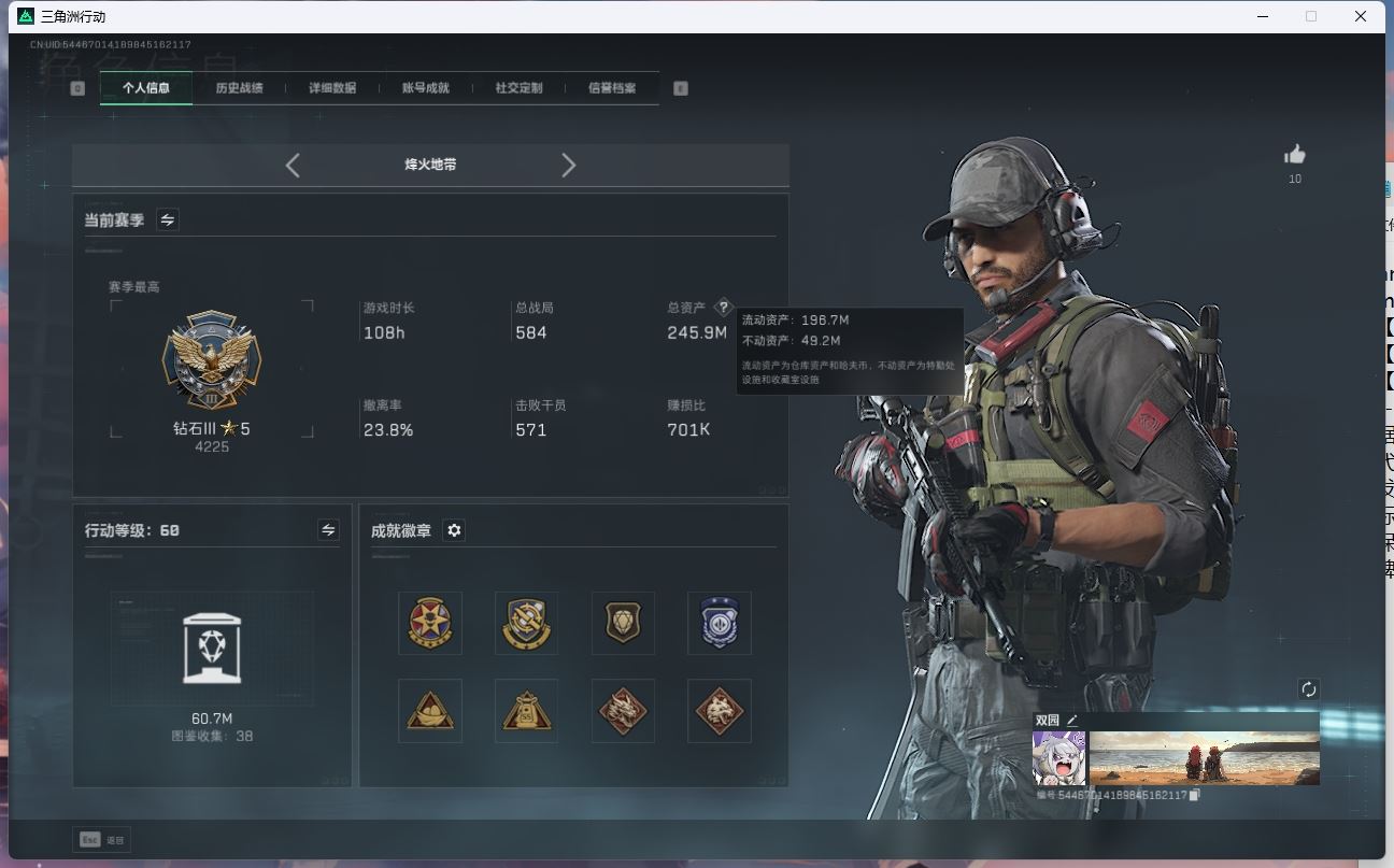 【游戏多多】 hmc AK025661行动等级:60钻石,总资产245.9m哈夫币 【呛皮:联动 725双管殿弹枪-送葬人-无题密令联动 复合弓-黑-天际线联动 CAR-15突击步枪-阿米娅M16A4突击步枪-狩猎G3战斗步枪-狩猎时刻Vector冲锋枪-狩猎时刻联动 M4A1突击步枪-阿米娅 联动 勇士冲锋枪-能天使-午夜邮差联动 Vector冲锋枪-能天使AK-12突击步枪-特斯拉线围UZ1冲锋枪-特斯拉线圈SR-3M紧凑突击步枪-特斯拉线圈M250通用机枪-骑士之心 ASh-12战斗步枪-鹅鸭杀0CQ171冲锋枪-鹅鸭杀0JB201轻机枪-鹅鸭杀】 【角色皮肤:蜂医-送葬人无题密令 露娜-黑天际线 】【近战:黑鹰】----安全箱等时效性道具请以游戏内数据为准:详情请看图----截图展示段位不代实际段位,赛季更新等不可抗拒因素发生变化、时限道具不保证所剩时间、标题未写送三角券默认不送】【主播担保+安全至上+性价比 买号卖号只选金牌商家一左友】