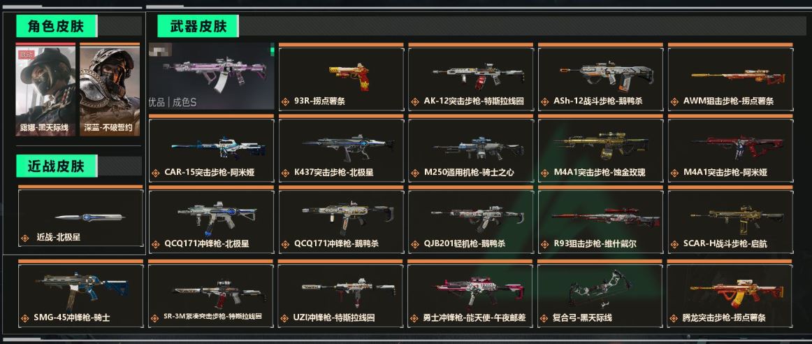 【游戏多多】 【个人信息】战场等级30上等兵, 行动等级60钻石 【哈夫币】110w 【总资产】77.1M 【货币】9曼德尔币/80三角券/49三角币 【特勤处】技术中心Lv.3/工作台Lv.3/制药台Lv.3/防具台Lv.3/仓库Lv.9/指挥中心Lv.4/训练中心Lv.6/靶场Lv.3/潜水中心Lv.1/收藏室Lv.1 【角色皮肤】露娜-黑天际线/深蓝-不破誓约 【已有捆绑包】北极星捆绑包/捞点薯条捆绑包 【近战皮肤】近战-北极星/近战-黑鹰 【传说典藏】腾龙突击步枪-气象感应(优品S) 【挂饰】重装记者/阿萨拉徽章/挂饰-骑士之心/挂饰-阿米娅/诡影喷火兵/挂饰-维什戴尔/挂饰-彩蛋/演出导演/阿萨拉霰弹兵/挂饰-北极星/阿萨拉狙击兵/阿萨拉机枪兵/阿萨拉喷火兵/乐队纪念/挂饰-水墨云图/挂饰-黑/挂饰-磁吸炸弹/挂饰-蚀金玫瑰/挂饰-黑天际线 【步枪皮肤】K437突击步枪-北极星/K437突击步枪-守护者/SG552突击步枪-深海恐惧/AK-12突击步枪-特斯拉线圈/ASh-12战斗步枪-无极限/SCAR-H战斗步枪-启航/PTR-32突击步枪-英雄/腾龙突击步枪-捞点薯条/AUG突击步枪-天命/ASh-12战斗步枪-鹅鸭杀/M4A1突击步枪-蚀金玫瑰/AUG突击步枪-蝮蛇/CAR-15突击步枪-阿米娅/AKM突击步枪-林中猎手/M4A1突击步枪-阿米娅 【冲锋枪皮肤】QCQ171冲锋枪-北极星/UZI冲锋枪-特斯拉线圈/MP5冲锋枪-战术竞备/QCQ171冲锋枪-鹅鸭杀/MP5冲锋枪-深海恐惧/Vector冲锋枪-阿萨拉文明/勇士冲锋枪-深海恐惧/MP7冲锋枪-守护者 【霰弹枪皮肤】M1014霰弹枪-林中猎手 【轻机枪皮肤】QJB201轻机枪-鹅鸭杀/M250通用机枪-骑士之心/PKM通用机枪-蝮蛇/QJB201轻机枪-OldHabits 【精准射击步枪皮肤】SR-25射手步枪-天命/Mini-14射手步枪-守护者 【狙击步枪皮肤】AWM狙击步枪-捞点薯条/SV-98狙击步枪-林中猎手/AWM狙击步枪-无极限/M700狙击步枪-蝮蛇/R93狙击步枪-维什戴尔 【特殊武器】复合弓-黑天际线 【载具皮肤】轮式突击炮-荣耀/全地形车-纷争 (典藏皮肤颜色请以典藏展示为准,安全箱等时效性道具请以游戏内数据为准)