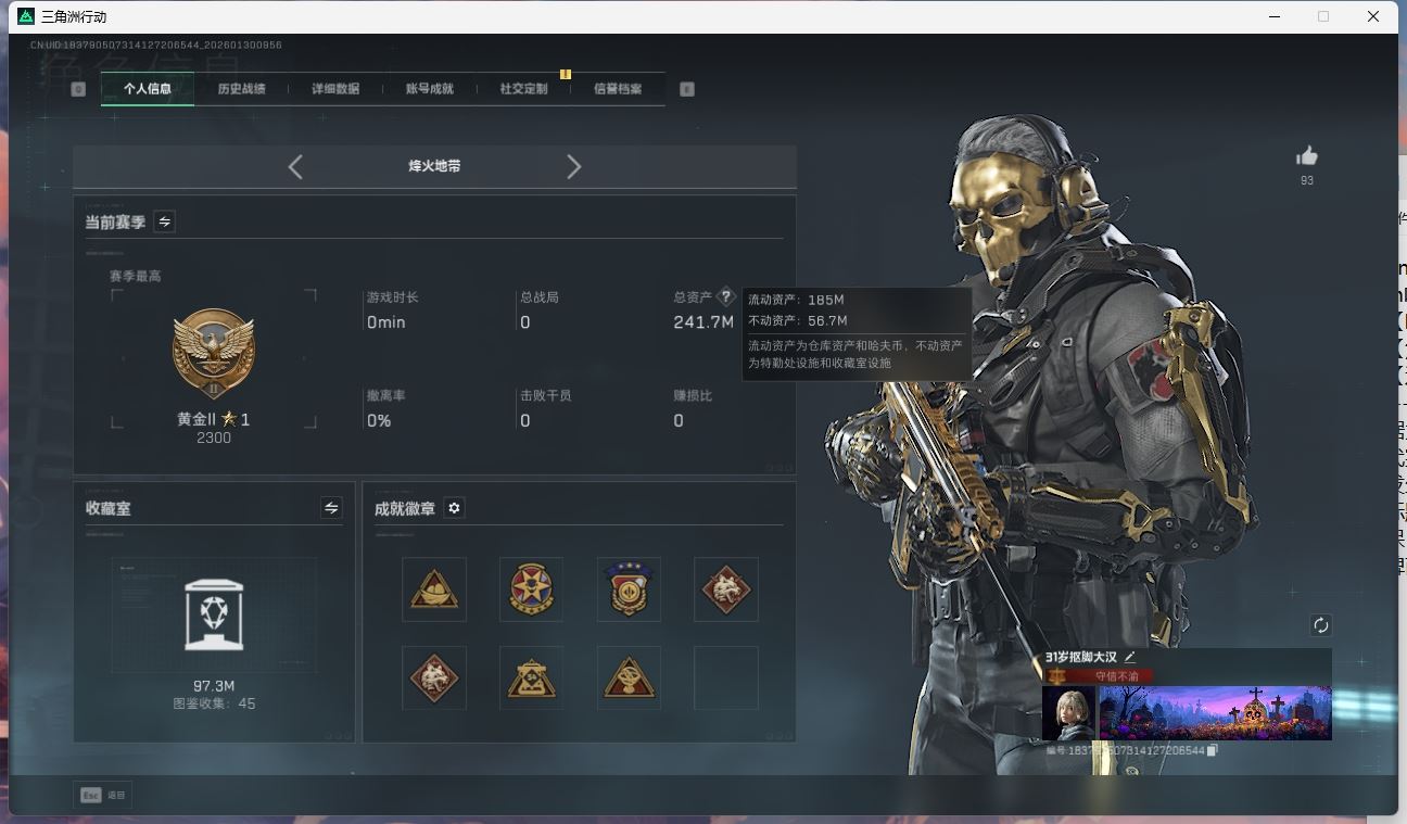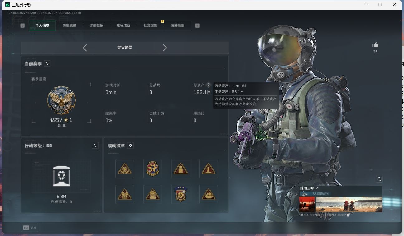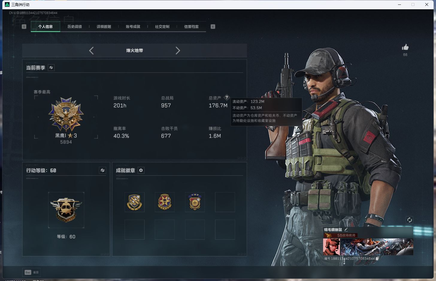【游戏多多】 ljh AK031543 行动等级60黑鹰 总资产176.7m 流动123.2m 满体满负重满潜水 s7赛季3*3【SG552突击步枪-运动员P90冲锋枪-信条SR-25射手步枪-信条KC17突击步枪-电锯惊魂G3战斗步枪-骑士ASh-12战斗步枪-鹅鸭杀QCQ171冲锋枪-鹅鸭杀 SCAR-H战斗步枪-启航M250通用机枪-骑士之心AK-12突击步枪-特斯拉线圈UZI冲锋枪-特斯拉线圈SR-3M紧凑突击步枪-特斯拉线圈M4A1突击步枪-阿米娅 】【近战 近战-信条 近战-电锯惊魂 近战-黑鹰】【角色皮肤 红狼-电锯惊魂 无名-夜鹰 蜂医-送葬人无题密令 深蓝-不破誓约 露娜-金牌射手 】----安全箱等时效性道具请以游戏内数据为准:详情请看图----截图展示段位不代实际段位,赛季更新等不可抗拒因素发生变化、时限道具不保证所剩时间、标题未写送三角币默认不送】【主播担保+安全至上+性价比 买号卖号只选金牌商家一左友】
