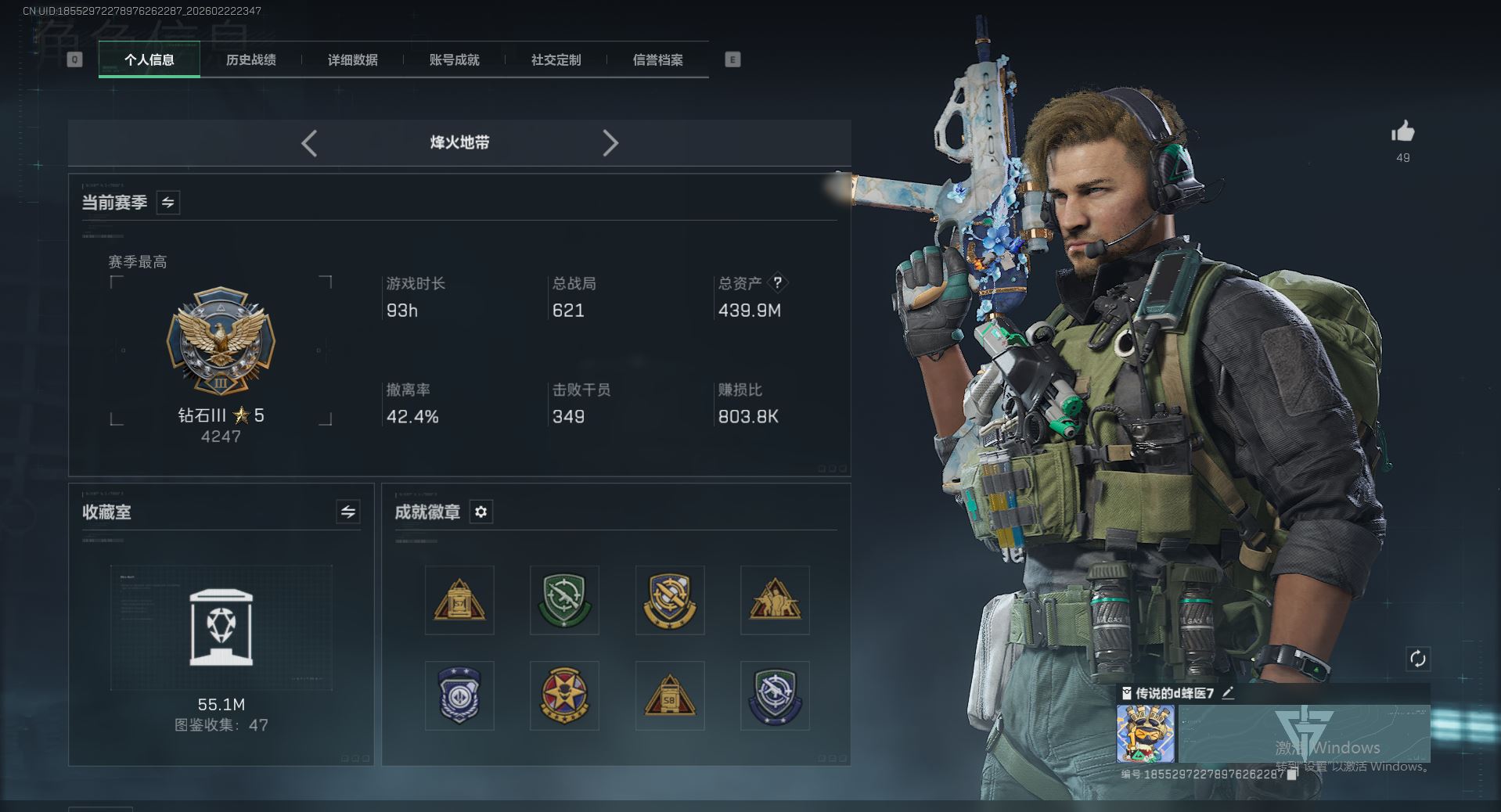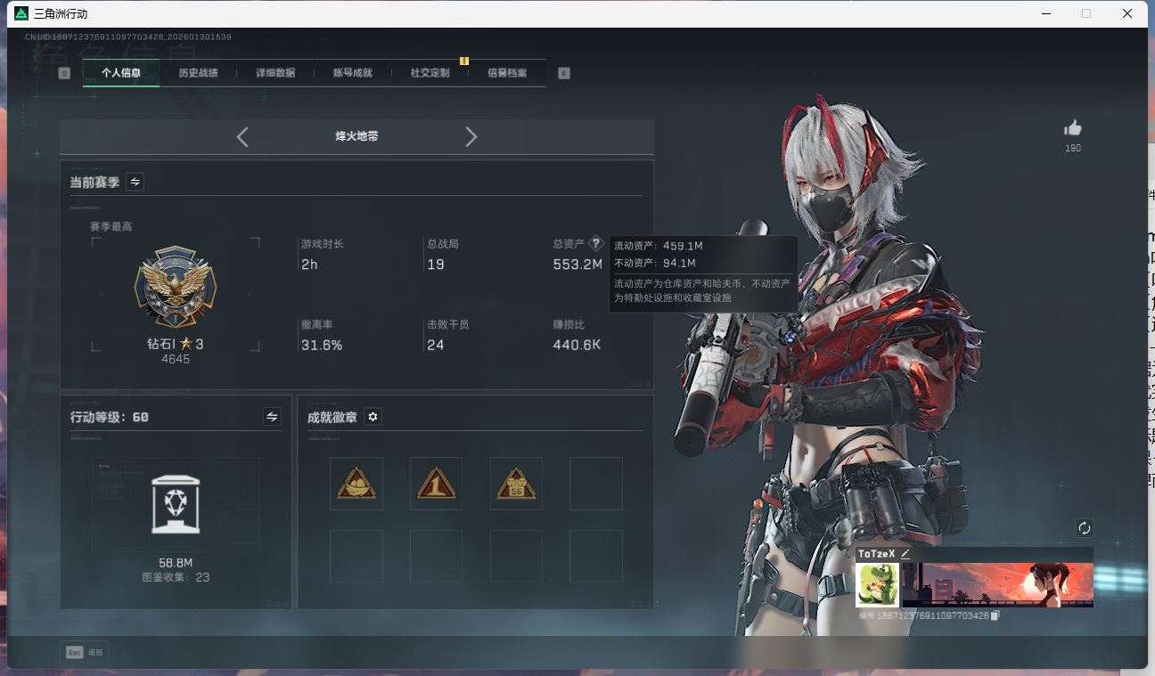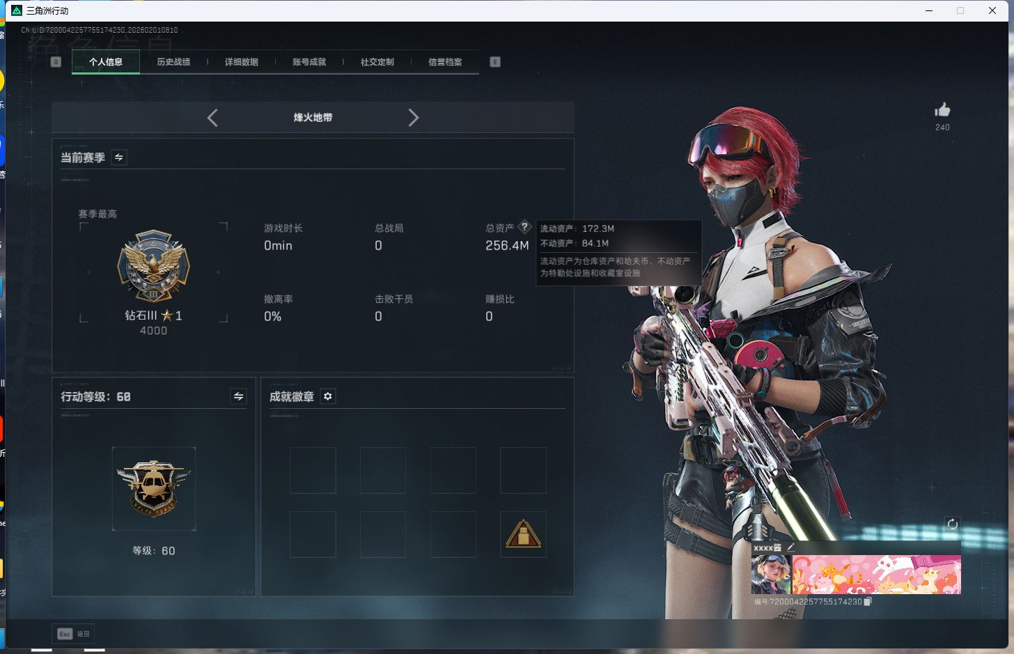 【游戏多多】 ljh AK031543 行动等级60黑鹰 总资产176.7m 流动123.2m 满体满负重满潜水 s7赛季3*3【SG552突击步枪-运动员P90冲锋枪-信条SR-25射手步枪-信条KC17突击步枪-电锯惊魂G3战斗步枪-骑士ASh-12战斗步枪-鹅鸭杀QCQ171冲锋枪-鹅鸭杀 SCAR-H战斗步枪-启航M250通用机枪-骑士之心AK-12突击步枪-特斯拉线圈UZI冲锋枪-特斯拉线圈SR-3M紧凑突击步枪-特斯拉线圈M4A1突击步枪-阿米娅 】【近战 近战-信条 近战-电锯惊魂 近战-黑鹰】【角色皮肤 红狼-电锯惊魂 无名-夜鹰 蜂医-送葬人无题密令 深蓝-不破誓约 露娜-金牌射手 】----安全箱等时效性道具请以游戏内数据为准:详情请看图----截图展示段位不代实际段位,赛季更新等不可抗拒因素发生变化、时限道具不保证所剩时间、标题未写送三角币默认不送】【主播担保+安全至上+性价比 买号卖号只选金牌商家一左友】