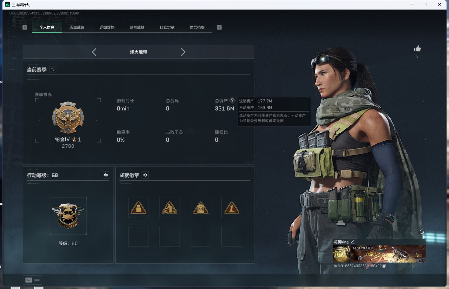 【游戏多多】 ljh AK031686 行动等级60铂金 总资产331.6m 流动177.7m 满体【典藏 ASVal突击步枪-悬赏令(极品s)腾龙气象感应(优品a火属性)m7棱镜攻势s2(优品a)毁灭之源2s 黑夜猎手4s】【近战 近战-怜悯 近战-影锋 近战-信条 近战-黑鹰】【角色皮肤 露娜-金牌射手 】----安全箱等时效性道具请以游戏内数据为准:详情请看图----截图展示段位不代实际段位,赛季更新等不可抗拒因素发生变化、时限道具不保证所剩时间、标题未写送三角币默认不送】【主播担保+安全至上+性价比 买号卖号只选金牌商家一左友】