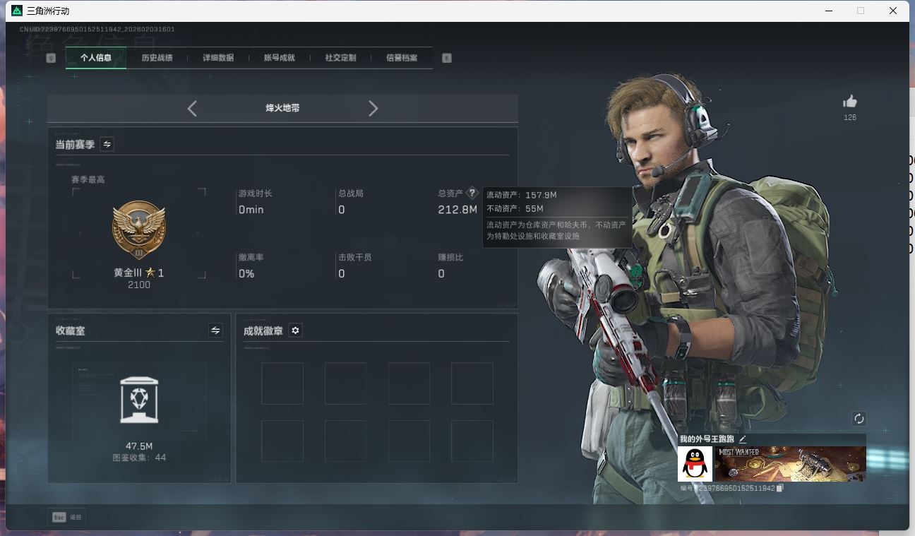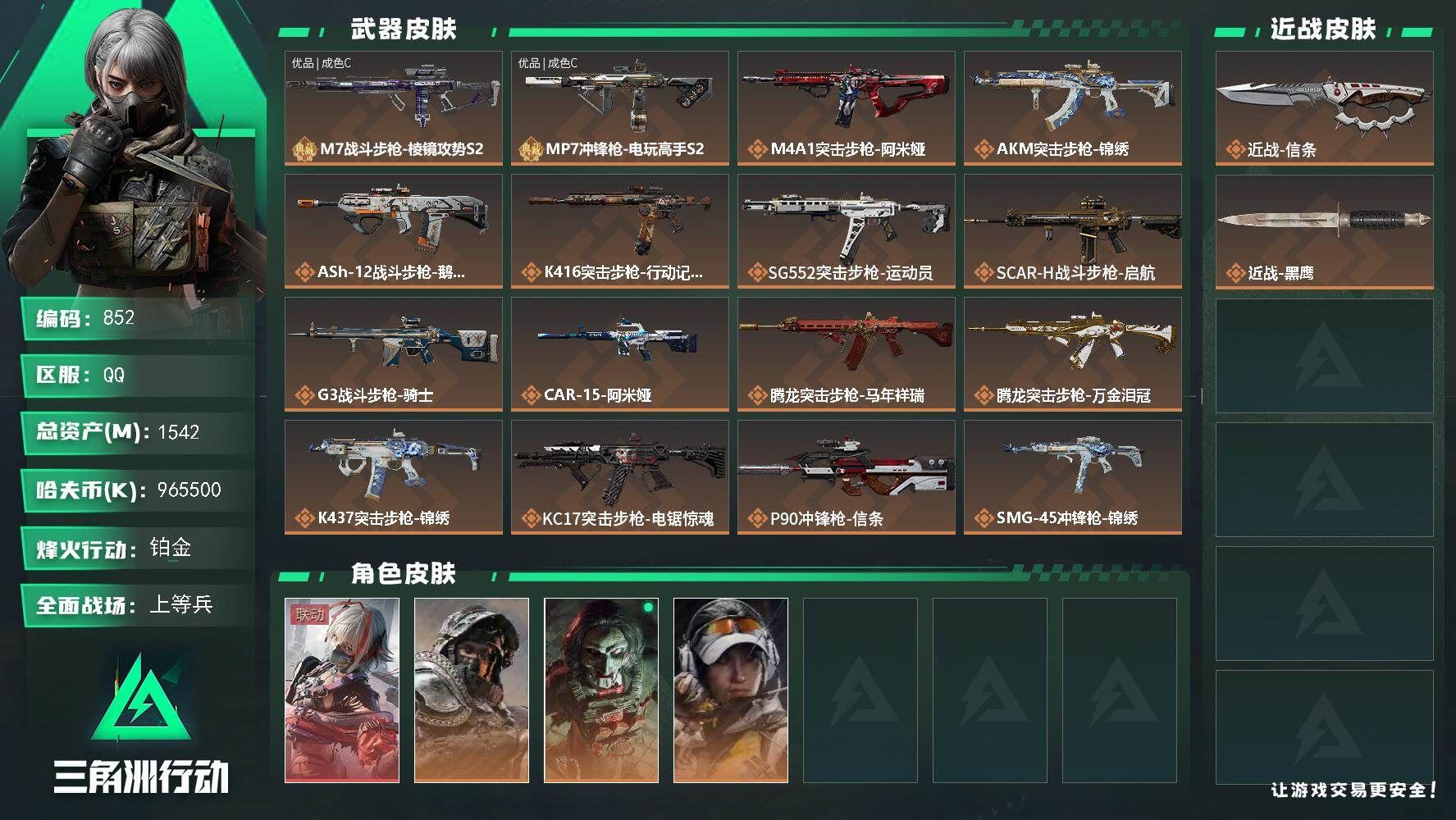 【游戏多多】 可二次QQ 【三角洲s8赛季:6格】1542m总资产-965500k哈伏币-60烽火等级-铂金-28战场等级-上等兵【干员外观】:骇爪-维什戴尔,深蓝-不破誓约,红狼-电锯惊魂,露娜-金牌射手【近战皮肤】:近战-信条,近战-黑鹰【典藏外观】:M7战斗步枪-棱镜攻势S2,MP7冲锋枪-电玩高手S2【典藏外观成色】:M7战斗步枪-棱镜攻势S2(优品C),MP7冲锋枪-电玩高手S2(优品C)【传说外观】:M4A1突击步枪-阿米娅,AKM突击步枪-锦绣,ASh-12战斗步枪-鹅鸭杀,K416突击步枪-行动记录,SG552突击步枪-运动员,SCAR-H战斗步枪-启航,G3战斗步枪-骑士,CAR-15突击步枪-阿米娅,腾龙突击步枪-马年祥瑞,腾龙突击步枪-万金泪冠,K437突击步枪-锦绣,KC17突击步枪-电锯惊魂,P90冲锋枪-信条,SMG-45冲锋枪-锦绣,勇士冲锋枪-万金泪冠,QCQ171冲锋枪-鹅鸭杀,M250通用机枪-骑士之心,QJB201轻机枪-鹅鸭杀,M14射手步枪-蛮荒,M14射手步枪-缄花,SKS射手步枪-骑士,SR-25射手步枪-信条,SR-25射手步枪-缄花,R93狙击步枪-维什戴尔,AWM狙击步枪-万金泪冠,.357左轮-缄花,G18-马年祥瑞【史诗外观】:QBZ95-1突击步枪-曙光,ASh-12战斗步枪-无极限,K416突击步枪-冬日风情,K416突击步枪-腊梅,AUG突击步枪-蝮蛇,M7战斗步枪-百步穿杨,SG552突击步枪-哈夫克警备,G3战斗步枪-流沙送葬,G3战斗步枪-哈夫克警备,AS Val突击步枪-百步穿杨,腾龙突击步枪-猎鳄行动,K437突击步枪-守护者,MP5冲锋枪-战术竞备,MP5冲锋枪-竞技风,Vector冲锋枪-猎鳄行动,Vector冲锋枪-百步穿杨,Vector冲锋枪-异域战争,SMG-45冲锋枪-阿萨拉特攻,SR-3M紧凑突击步枪-战术竞备,SR-3M紧凑突击步枪-开工大吉,勇士冲锋枪-工业狂潮,勇士冲锋枪-丛影谍踪,MP7冲锋枪-守护者,MP7冲锋枪-六套之力,PKM通用机枪-蝮蛇,PKM通用机枪-阿萨拉特攻,M249轻机枪-丛影谍踪,Mini-14射手步枪-守护者,VSS射手步枪-丛影谍踪,SVD狙击步枪-阿萨拉工艺,M14射手步枪-工业狂潮, M14射手步枪-航天庆典,SV-98狙击步枪-囚徒,M700狙击步枪-蝮蛇,M700狙击步枪-百步穿杨,M700狙击步枪-哈夫克警备,AWM狙击步枪-无极限,AWM狙击步枪-流沙送葬,复合弓-守护者【稀有外观】:AUG突击步枪-花岗岩,M14射手步枪-天际线,SCAR-H战斗步枪-旧梦,M4A1突击步枪-繁盛,AKM突击步枪-战术演练,AKM突击步枪-肃杀,QBZ95-1突击步枪-公平竞技,AKS-74U突击步枪-前沿科技,ASh-12战斗步枪-繁盛,K416突击步枪-一帆风顺,M7战斗步枪-前沿科技,M7战斗步枪-捣蛋鬼,SG552突击步枪-2026,SG552突击步枪-马年新春, AK-12突击步枪-马年新春,SCAR-H战斗步枪-荣耀列队,SCAR-H战斗步枪-黄昏,G3战斗步枪-战术演练,G3战斗步枪-主宰*2,CAR-15突击步枪-前沿科技,CAR-15突击步枪-来财,腾龙突击步枪-冰天雪地,KC17突击步枪-来财,MP5冲锋枪-哈夫克卫队,P90冲锋枪-黄昏,P90冲锋枪-捣蛋鬼,Vector冲锋枪-先锋,UZI冲锋枪-前沿科技,UZI冲锋枪-亚特兰蒂斯,野牛冲锋枪-前沿科技,SMG-45冲锋枪-行动开启,SMG-45冲锋枪-幻影结构,SR-3M紧凑突击步枪-马年新春,勇士冲锋枪-主宰,勇士冲锋枪-冰天雪地,M1014霰弹枪-幻影结构,S12K霰弹枪-战术演练,M249轻机枪-毛鲁斯之力,M249轻机枪-冰天雪地,QJB201轻机枪-黄昏,QJB201轻机枪-哈夫克卫队,Mini-14射手步枪-荣耀列队,Mini-14射手步枪-来财,SR-25射手步枪-开拓,SR9射手步枪-肃杀,PSG-1射手步枪-主宰,SV-98狙击步枪-星链科技,SV-98狙击步枪-哈夫克航天,SV-98狙击步枪-精英联盟【普通外观】:AKM突击步枪-淘金者,AS Val突击步枪-猛兽,M1014霰弹枪-旧工业,腾龙突击步枪-古铜,S12K霰弹枪-古铜,M7战斗步枪-噬菌体,PTR-32突击步枪-噬菌体,M4A1突击步枪-粉色涂装,M4A1突击步枪-高雅黑,M4A1突击步枪-海色,QBZ95-1突击步枪-高雅黑,QBZ95-1突击步枪-海浪,QBZ95-1突击步枪-海色,QBZ95-1突击步枪-2026,腾龙突击步枪-三角洲力量,K416突击步枪-几何迷彩,K416突击步枪-高雅黑,K416突击步枪-重击,M16A4突击步枪