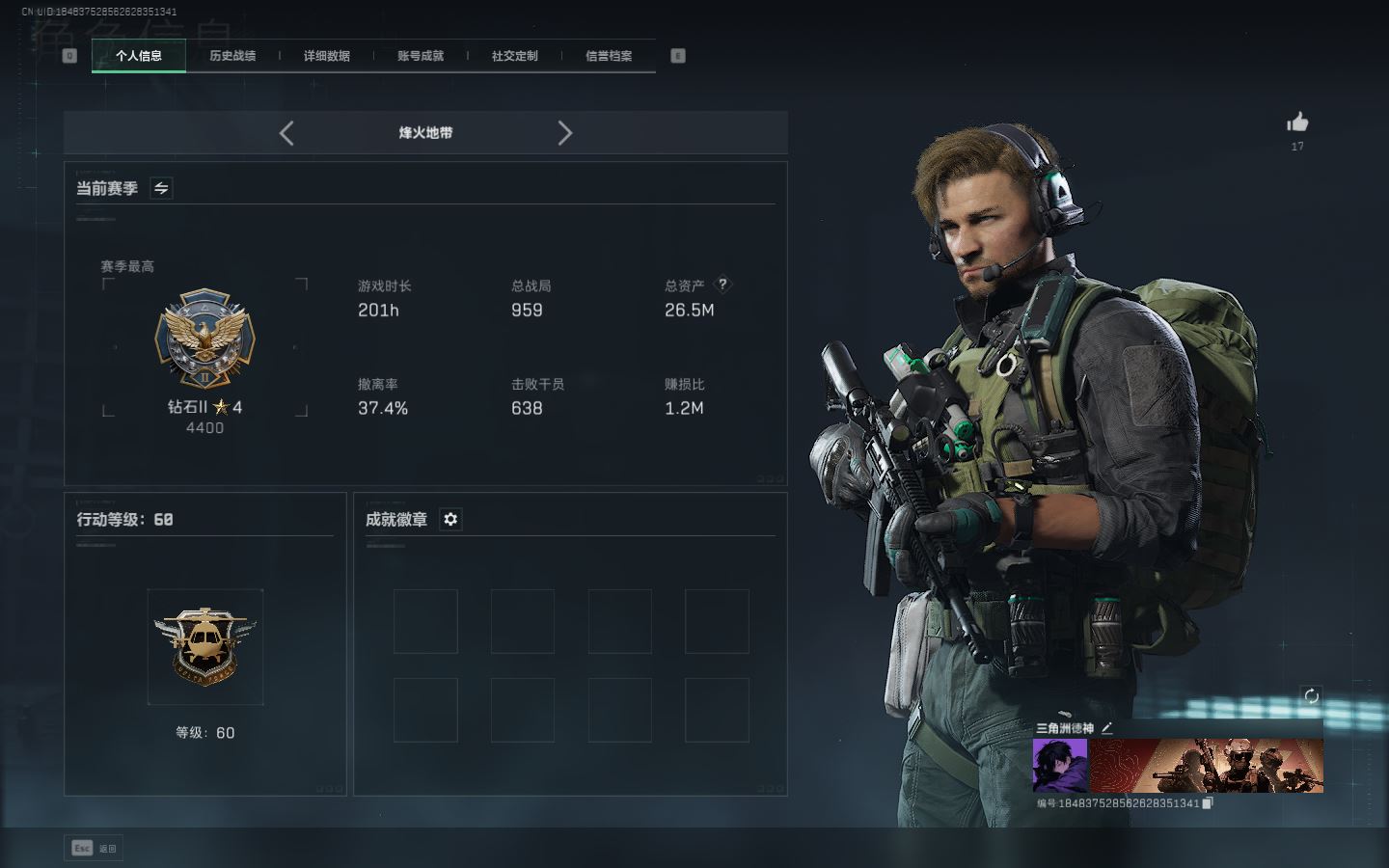 【游戏多多】 ljh AK025756 有二次 行动等级60黄金 总资产1b【3*3保险】【M4A1突击步枪-蚀金玫瑰ASh-12战斗步枪-鹅鸭杀0CQ171冲锋枪-鹅鸭郊QJ日201轻机枪-鹅鸭杀G3战斗步枪-骑士SCAR-H战斗步枪-启航M250通用机枪-骑士之心 M16A4突击步枪-狩猎时刻G3战斗步枪-狩猎时刻Vector冲锋枪-狩猎时刻!联动 M4A1突击步枪-阿米娅联动 勇士冲锋枪-能天使-午夜邮差AK-12突击步枪-特斯拉线 UZ1冲锋枪-特斯拉线园SR-3M紧凑突击步枪-特斯拉线园联动 复合弓-黑-天际线联动 CAR-15突击步枪-阿米娅K437突击步枪-北极星0CQ171冲锋枪-北极星联动 725双管疲弹枪-送葬人-无题密令】【近战 北极星 黑鹰】【角色皮肤 无名-夜鹰 蜂医-无题密令 深蓝-不破誓约 露娜-黑天际线】-----安全箱等时效性道具请以游戏内数据为准:详情请看图----截图展示段位不代实际段位,赛季更新等不可抗拒因素发生变化、时限道具不保证所剩时间、标题未写送三角券默认不送】【主播担保+安全至上+性价比 买号卖号只选金牌商家一左友】