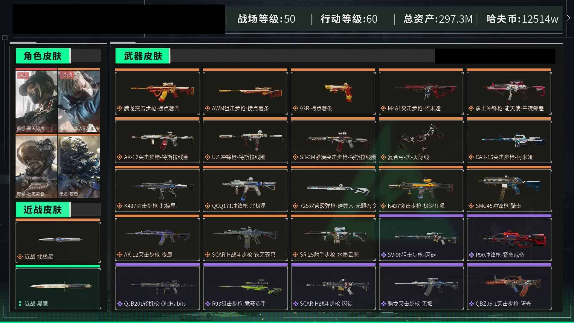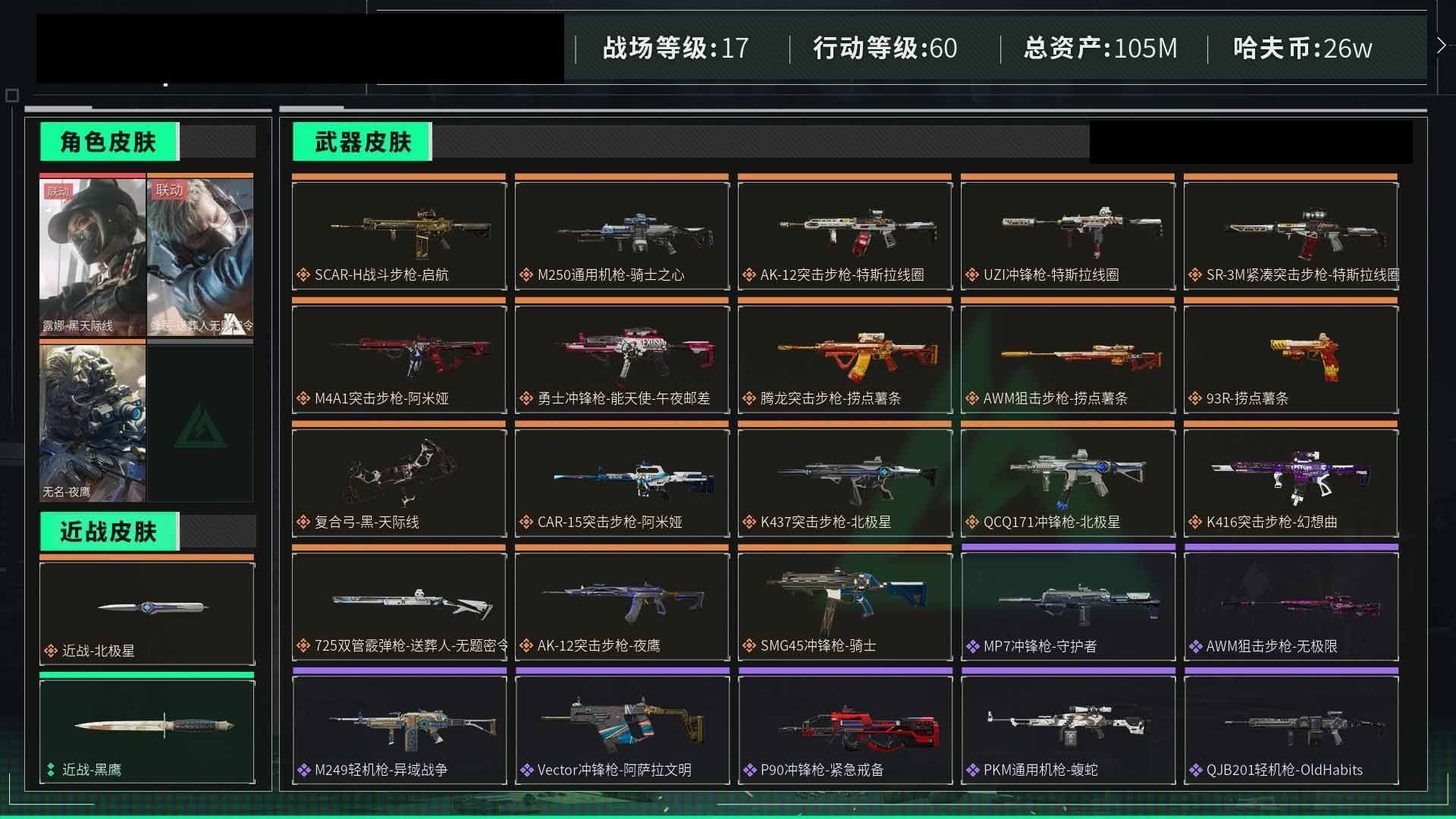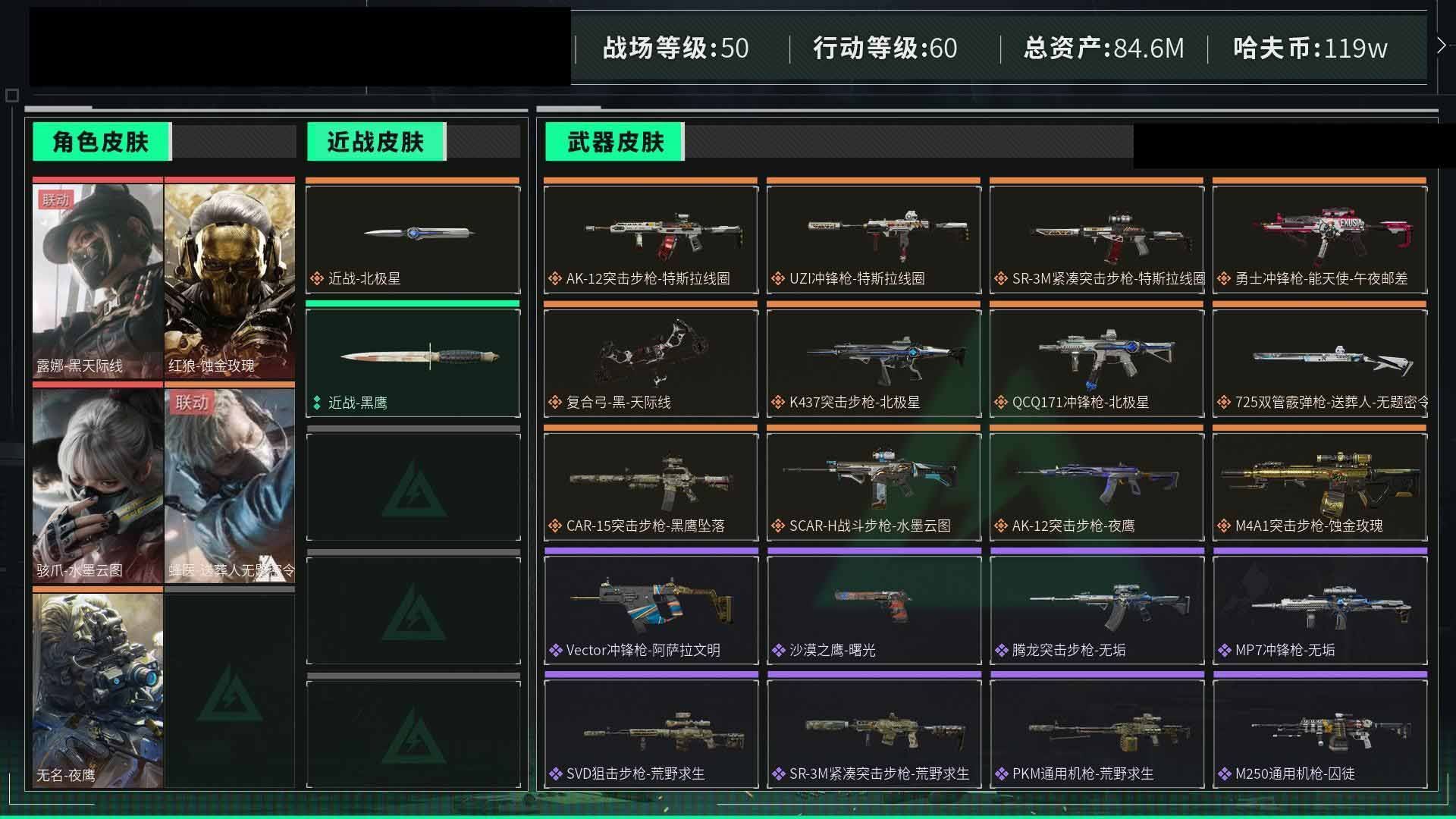 【游戏多多】 总资产84M,哈夫币119w,枪皮数量141,战场等级:50 军士长,行动等级:60 铂金,角色皮肤数量5,露娜-黑天际线/红狼-蚀金玫瑰/骇爪-水墨云图