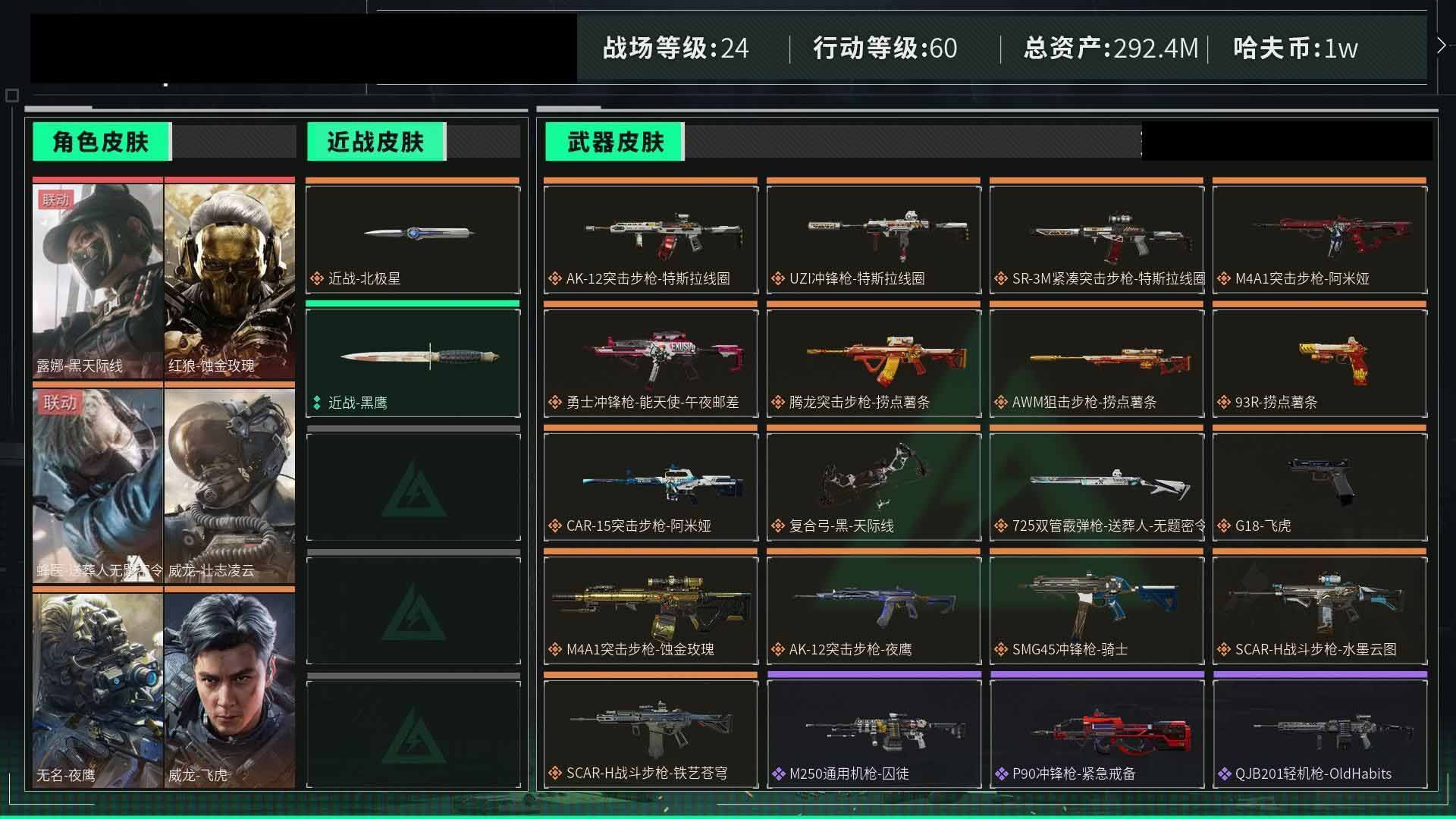 【游戏多多】 惠号是全卡号 巴克什监狱航天全卡】总资产292M,哈夫币1w,枪皮数量180,战场等级:24 上等兵,行动等级:60 钻石,角色皮肤数量6,露娜-黑天际线 【个人信息】战场等级:24 上等兵,行动等级:60 钻石 【哈夫币】1w 【总资产】292M 【烽火地带专区】总资产200M以上 【货币】17三角币/0曼德尔币/169三角券 【安全箱】基础安全箱2(1x2) 【通行证】通行证免费版 【特勤处】制药台Lv.3/工作台Lv.3/仓库Lv.8/防具台Lv.3/训练中心Lv.7/靶场Lv.7/技术中心Lv.3/指挥中心Lv.6/潜水中心Lv.3/收藏室Lv.2 【角色皮肤】露娜-黑天际线/红狼-蚀金玫瑰/威龙-壮志凌云/威龙-飞虎/无名-夜鹰/蜂医-送葬人无题密令/ 【已拥有捆绑包】飞虎捆绑包/捞点薯条捆绑包/特斯拉线圈捆绑包/ 【近战皮肤】近战-黑鹰/近战-北极星/ 【步枪皮肤】M4A1突击步枪-蚀金玫瑰/QBZ95-1突击步枪-曙光/SCAR-H战斗步枪-铁艺苍穹/SCAR-H战斗步枪-水墨云图/QBZ95-1突击步枪-ACE/AUG突击步枪-蝮蛇/G3战斗步枪-战场英杰/AUG突击步枪-特勤执行/M4A1突击步枪-特勤执行/PTR-32突击步枪-ACE/AK-12突击步枪-夜鹰/SG552突击步枪-尖端治疗/AS Val突击步枪-尖端治疗/ASh-12战斗步枪-守夜人/AKM突击步枪-林中猎手/PTR-32突击步枪-英雄/腾龙突击步枪-无垢/M16A4突击步枪-竞赛选手/SR-3M紧凑突击步枪-荒野求生/CAR-15突击步枪-阿米娅/M4A1突击步枪-阿米娅/腾龙突击步枪-捞点薯条/AK-12突击步枪-特斯拉线圈/SR-3M紧凑突击步枪-特斯拉线圈/ 【冲锋枪皮肤】UZI冲锋枪-特斯拉线圈/Vector冲锋枪-阿萨拉文明/Vector冲锋枪-红色彗星/MP5冲锋枪-深海恐惧/勇士冲锋枪-深海恐惧/SMG45冲锋枪-骑士/MP7冲锋枪-无垢/勇士冲锋枪-能天使-午夜邮差/P90冲锋枪-紧急戒备/勇士冲锋枪-工业狂潮/ 【霰弹枪皮肤】S12K霰弹枪-曙光/M1014霰弹枪-林中猎手/725双管霰弹枪-送葬人-无题密令/ 【轻机枪皮肤】PKM通用机枪-英雄/PKM通用机枪-守夜人/PKM通用机枪-荒野求生/M250通用机枪-囚徒/QJB201轻机枪-OldHabits/ 【精准射手步枪皮肤】SKS射手步枪-ACE/SR-25射手步枪-尖端治疗/PSG-1射手步枪-无垢/ 【狙击步枪皮肤】SVD狙击步枪-阿萨拉工艺/M700狙击步枪-竞技风/SV-98狙击步枪-囚徒/SVD狙击步枪-暗夜猎手/M700狙击步枪-守夜人/SV-98狙击步枪-林中猎手/SVD狙击步枪-荒野求生/AWM狙击步枪-捞点薯条/ 【手枪皮肤】沙漠之鹰-曙光/G18-飞虎/93R-捞点薯条/ 【特殊武器】复合弓-黑-天际线/ 【挂饰】挂饰-蚀金玫瑰/挂饰-王牌座驾/演出导演/挂饰-小羊/挂饰-彩蛋/阿萨拉机枪兵/挂饰-晶石幻想/挂饰-阿米娅/挂饰-来点薯条/挂饰-特斯拉线圈/阿萨拉徽章/ 【载具】步战车-无瑕/步战车-凝视/轮式突击炮-暗夜行动/轮式突击炮-凝视/突击直升机-飓风行动/突击直升机-暗夜行动/侦察直升机-凝视/ (典藏皮肤颜色请以典藏展示为准,安全箱等时效性道具请以游戏内数据为准)