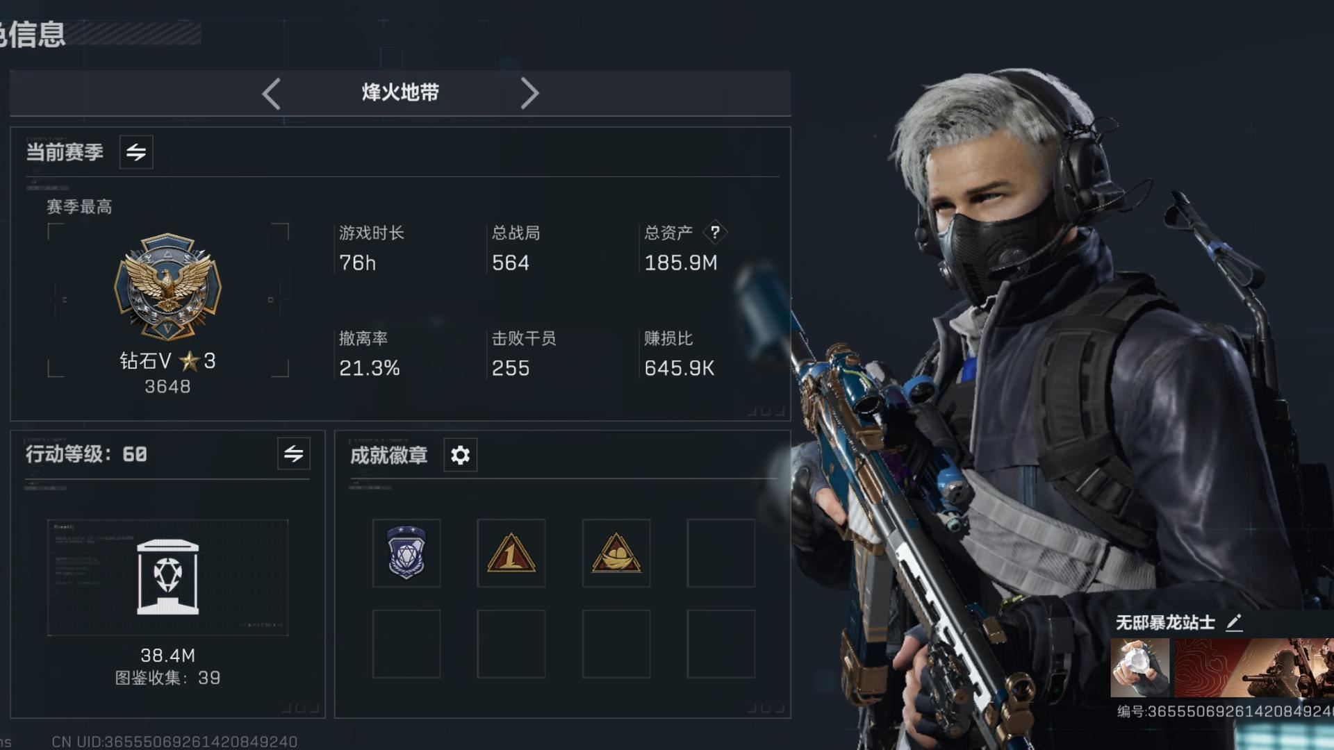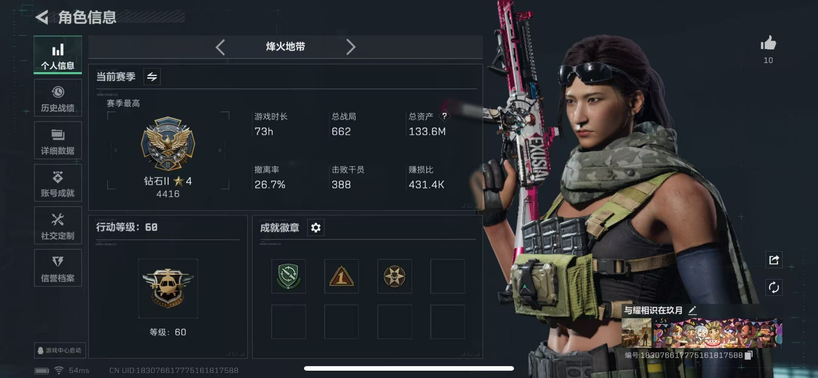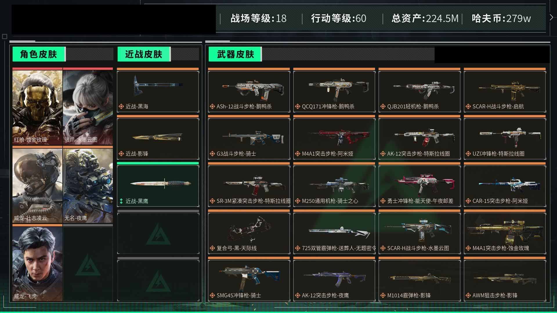 【游戏多多】 总资产68m,哈夫币178w,红狼-蚀金玫瑰/无名-夜鹰,呛皮数量140,战场等级:23 列兵,行动等级:60 钻石,近战-黑鹰,安全箱等时效性道具请以游戏内数据为准;详情请看图【个人信息】战场等级:23 列兵,行动等级:60 钻石【哈夫币】178w【总资产】68m【烽火地带专区】总资产60m-100m【安全箱】进阶安全箱4(2x2)/基础安全箱2(1x2)【通行证】通行证免费版【特勤处】制药台lv.3/工作台lv.3/仓库lv.8/防具台lv.3/训练中心lv.7/靶场lv.6/技术中心lv.3/指挥中心lv.6/潜水中心lv.0/收藏室lv.0【角色皮肤】红狼-蚀金玫瑰/无名-夜鹰/【近战皮肤】近战-黑鹰/【步呛皮肤】m4a1突击步呛-蚀金玫瑰/qbz95-1突击步呛-曙光/k416突击步呛-竞技风/as val突击步呛-刀锋/scar-h战斗步呛-水墨云图/sr-3m紧凑突击步呛-英雄/aug突击步呛-蝮蛇/g3战斗步呛-战场英杰/scar-h战斗步呛-猎鳄行动/ak-12突击步呛-夜鹰/sg552突击步呛-深海恐惧/sg552突击步呛-尖端治疗/as val突击步呛-尖端治疗/ash-12战斗步呛-守夜人/akm突击步呛-林中猎手/m16a4突击步呛-竞赛选手/【冲锋呛皮肤】vector冲锋呛-阿萨拉文明/mp5冲锋呛-深海恐惧/勇士冲锋呛-深海恐惧/smg45冲锋呛-骑士/勇士冲锋呛-能天使-午夜邮差/vector冲锋呛-能天使-午夜邮差/【霰弹呛皮肤】s12k霰弹呛-曙光/m1014霰弹呛-林中猎手/【轻机呛皮肤】pkm通用机呛-蝮蛇/pkm通用机呛-英雄/pkm通用机呛-守夜人/【精准射手步呛皮肤】sr-25射手步呛-水墨云图/sr-25射手步呛-尖端治疗/【狙击步呛皮肤】svd狙击步呛-阿萨拉工艺/m700狙击步呛-竞技风/m700狙击步呛-蝮蛇/svd狙击步呛-暗夜猎手/m700狙击步呛-守夜人/sv-98狙击步呛-林中猎手/【手呛皮肤】沙墨之鹦-曙光/qsz92g-风林火山/93r-博士/【特殊武器】复合弓-黑-天际线/【挂饰】挂饰-蚀金玫瑰/持盾者/挂饰-relink/雄狮之盾/爆裂鼓声/演出导演/重装记者/挂饰-小羊/挂饰-彩蛋/乐队纪念/阿萨拉霰弹兵/阿萨拉狙击兵/阿萨拉徽章/(典藏皮肤颜色请以典藏展示为准,安全箱等时效性道具请以游戏内数据为准)