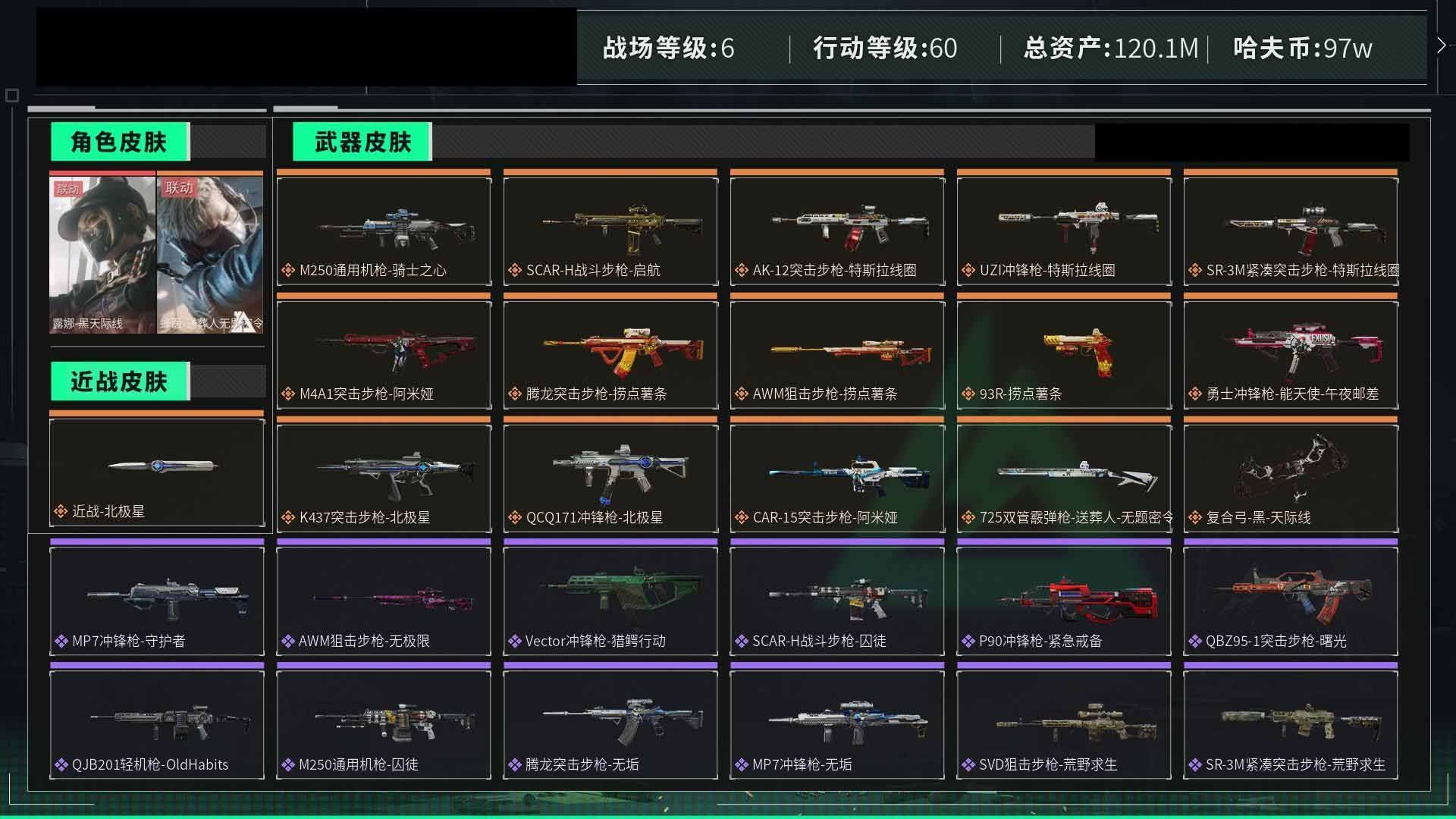 【游戏多多】 新390493总资产120M,哈夫币97w,枪皮数量139,战场等级:6 无军衔,行动等级:60 钻石,角色皮肤数量2,露娜-黑天际线/蜂医-送葬人无题密令,近战-北极 【个人信息】战场等级:6 无军衔,行动等级:60 钻石 【哈夫币】97w 【总资产】120M 【烽火地带专区】总资产100M-150M 【货币】11三角币/0曼德尔币/670三角券 【安全箱】基础安全箱2(1x2)/进阶安全箱4(2x2)/S6高级安全箱6(2x3) 【通行证】烽火地带限定版 【特勤处】制药台Lv.3/工作台Lv.3/仓库Lv.8/防具台Lv.3/训练中心Lv.4/靶场Lv.4/技术中心Lv.3/指挥中心Lv.3/潜水中心Lv.0/收藏室Lv.1 【角色皮肤】露娜-黑天际线/蜂医-送葬人无题密令/ 【已拥有捆绑包】北极星捆绑包/捞点薯条捆绑包/特斯拉线圈捆绑包/ 【近战皮肤】近战-黑鹰/近战-北极星/ 【步枪皮肤】QBZ95-1突击步枪-曙光/SG552突击步枪-深海恐惧/AKM突击步枪-林中猎手/PTR-32突击步枪-英雄/K437突击步枪-北极星/AS Val突击步枪-典狱官/腾龙突击步枪-无垢/SCAR-H战斗步枪-囚徒/M16A4突击步枪-竞赛选手/SR-3M紧凑突击步枪-荒野求生/CAR-15突击步枪-阿米娅/M4A1突击步枪-阿米娅/腾龙突击步枪-捞点薯条/AK-12突击步枪-特斯拉线圈/SR-3M紧凑突击步枪-特斯拉线圈/SCAR-H战斗步枪-启航/ 【冲锋枪皮肤】UZI冲锋枪-特斯拉线圈/勇士冲锋枪-深海恐惧/QCQ171冲锋枪-北极星/MP7冲锋枪-无垢/勇士冲锋枪-能天使-午夜邮差/P90冲锋枪-紧急戒备/Vector冲锋枪-猎鳄行动/MP7冲锋枪-守护者/勇士冲锋枪-工业狂潮/ 【霰弹枪皮肤】M1014霰弹枪-林中猎手/725双管霰弹枪-送葬人-无题密令/ 【轻机枪皮肤】PKM通用机枪-荒野求生/M250通用机枪-囚徒/QJB201轻机枪-OldHabits/M250通用机枪-骑士之心/ 【精准射手步枪皮肤】PSG-1射手步枪-无垢/ 【狙击步枪皮肤】SV-98狙击步枪-囚徒/M700狙击步枪-蝮蛇/SVD狙击步枪-暗夜猎手/SV-98狙击步枪-林中猎手/SVD狙击步枪-荒野求生/AWM狙击步枪-捞点薯条/ 【手枪皮肤】沙漠之鹰-曙光/93R-捞点薯条/ 【特殊武器】复合弓-黑-天际线/ 【挂饰】诡影狙击兵/诡影喷火兵/挂饰-启程/挂饰-彩蛋/阿萨拉盾兵/挂饰-北极星/阿萨拉霰弹兵/阿萨拉狙击兵/挂饰-晶石幻想/挂饰-阿米娅/挂饰-来点薯条/挂饰-特斯拉线圈/阿萨拉徽章/紧急会议/ (典藏皮肤颜色请以典藏展示为准,安全箱等时效性道具请以游戏内数据为准)