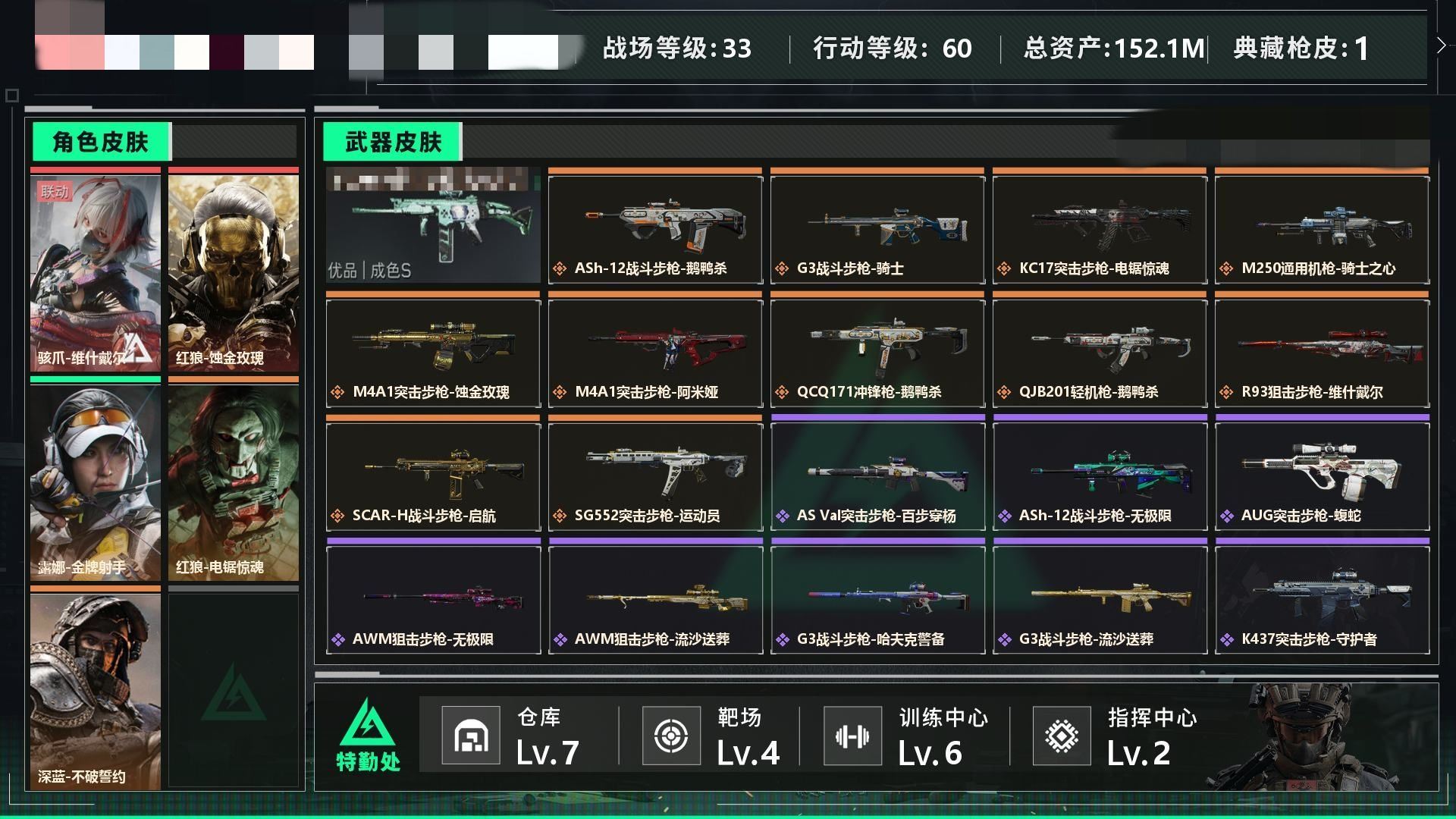 【游戏多多】 R51530 可二次QQ 【S7赛季6格】167m总资产-3096k哈伏币-60烽火等级-黄金-11战场等级-列兵【指挥中心5级+训练中心6级+靶场6级+收藏室1级】【干员外观】:露娜-金牌射手【近战皮肤】:近战-信条,近战-黑鹰【典藏外观】:M7战斗步枪-棱镜攻势S2极品A【传说外观】:M4A1突击步枪-蚀金玫瑰,SG552突击步枪-运动员,各种道具详情看截图、低价出售找回包 赔、截图展示段位不代 表实际段位,如赛季更新等不可抗拒因素发生变化、时限道具不保证所剩时间、标题未写送点劵默认不送【卖号买号首选亿梦】