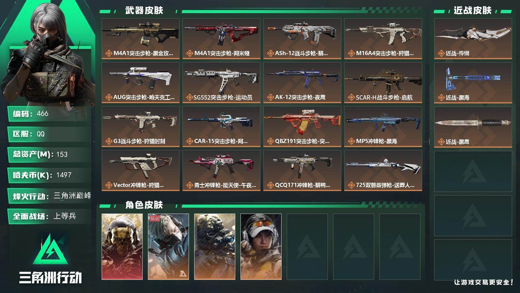 【游戏多多】 R51591 可二次QQ【S7赛季9格】153m总资产-1497k哈伏币-60烽火等级-三角洲巅峰-23战场等级-上等兵【仓库8级+指挥中心6级+训练中心7级+靶场7级+收藏室1级】【炫彩兰小登】【91发AWM子弹】【干员外观】:红狼-蚀金玫瑰,蜂医-送葬人·无题密令,无名-夜鹰,露娜-金牌射手【近战皮肤】:近战-怜悯,近战-黑海,近战-黑鹰【传说外观】:M4A1突击步枪-蚀金玫瑰,M4A1突击步枪-阿米娅,ASh-12战斗步枪-鹅鸭杀,M16A4突击步枪-狩猎时刻,AUG突击步枪-哈夫克工业,SG552突击步枪-运动员,AK-12突击步枪-夜鹰,SCAR-H战斗步枪-启航,G3战斗步枪-狩猎时刻,CAR-15突击步枪-阿米娅,腾龙突击步枪-捞点薯条,MP5冲锋枪-黑海,Vector冲锋枪-狩猎时刻,勇士冲锋枪-能天使-午夜邮差,QCQ171冲锋枪-鹅鸭杀,725双管霰弹枪-送葬人-无题密令,M250通用机枪-骑士之心,QJB201轻机枪-黑海,QJB201轻机枪-鹅鸭杀,M700狙击步枪-零度协议,AWM狙击步枪-捞点薯条,93R-捞点薯条,各种道具详情看截图、低价出售找回包 赔、截图展示段位不代 表实际段位,如赛季更新等不可抗拒因素发生变化、时限道具不保证所剩时间、标题未写送点劵默认不送【卖号买号首选亿梦】