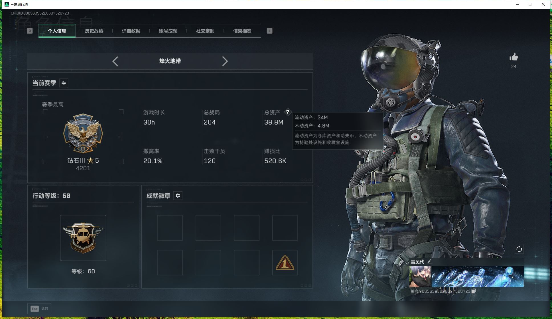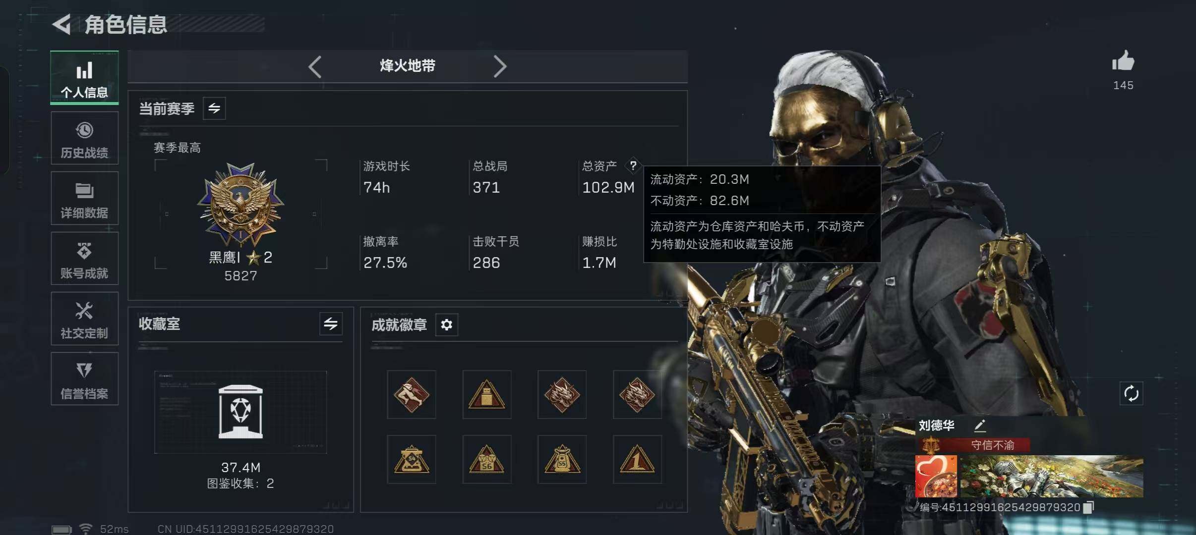 【游戏多多】 金(3906)【个人信息】战场等级33军士长, 行动等级60黑鹰 【哈夫币】753w 【总资产】152.1M 【货币】26曼德尔币/60三角券/36三角币 【安全箱】S7高级安全箱6(2x3) 【特勤处】技术中心Lv.2/工作台Lv.3/制药台Lv.3/防具台Lv.3/仓库Lv.7/指挥中心Lv.2/训练中心Lv.6/靶场Lv.4/潜水中心Lv.1/收藏室Lv.1 【仓库】338AP 【通行证】烽火地带限定版 【角色皮肤】骇爪-维什戴尔/红狼-蚀金玫瑰/露娜-金牌射手/红狼-电锯惊魂/深蓝-不破誓约 【近战皮肤】近战-黑鹰 【传说典藏】SCAR-H战斗步枪-电玩高手(优品S) 详情请看图
