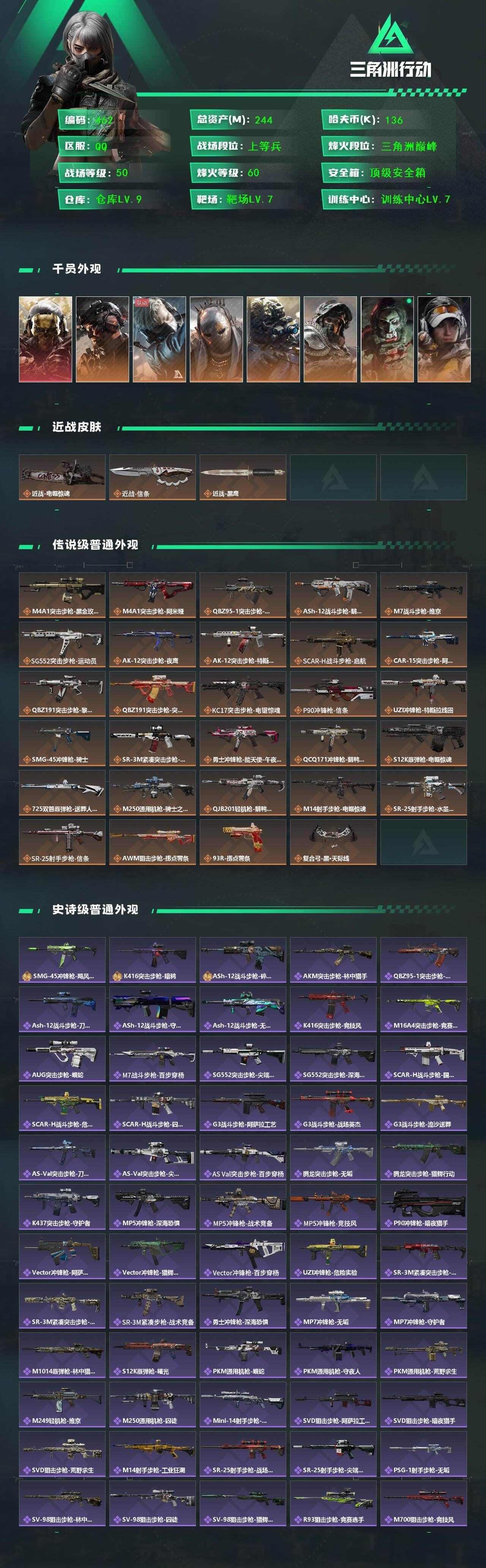 【游戏多多】 r51554 可二次qq【244m总资产-136k哈伏币-60烽火等级-三角洲巅峰-50战场等级-上等兵】【47发awm子弹】【仓库9级/指挥中心6级/训练中心7级/靶场7级】【红狼-蚀金玫瑰,威龙-铁面判官,蜂医-送葬人·无题密令,牧羊人-街头之王,无名-夜鹰,深蓝-不破誓约,红狼-电锯惊魂,露娜-金牌射手】【近战-电锯惊魂,近战-信条,近战-黑鹰】【M4A1突击步枪-蚀金玫瑰,M4A1突击步枪-阿米娅,QBZ95-1突击步枪-破军,ASh-12战斗步枪-鹅鸭杀,M7战斗步枪-维京,SG552突击步枪-运动员,AK-12突击步枪-夜鹰,AK-12突击步枪-特斯拉线圈,SCAR-H战斗步枪-启航,CAR-15突击步枪-阿米娅,腾龙突击步枪-黎明警戒,腾龙突击步枪-捞点薯条,KC17突击步枪-电锯惊魂,P90冲锋枪-信条,UZI冲锋枪-特斯拉线圈,SMG-45冲锋枪-骑士,SR-3M紧凑突击步枪-特斯拉线圈,勇士冲锋枪-能天使-午夜邮差,QCQ171冲锋枪-鹅鸭杀,S12K霰弹枪-电锯惊魂,725双管霰弹枪-送葬人-无题密令,M250通用机枪-骑士之心,QJB201轻机枪-鹅鸭杀,M14射手步枪-电锯惊魂,SR-25射手步枪-水墨云图,SR-25射手步枪-信条,AWM狙击步枪-捞点薯条,93R-捞点薯条,复合弓-黑·天际线】各种道具详情看截图、低价出售找回包 赔、截图展示段位不代 表实际段位,如赛季更新等不可抗拒因素发生变化、时限道具不保证所剩时间、标题未写送点劵默认不送【卖号买号首选亿梦】