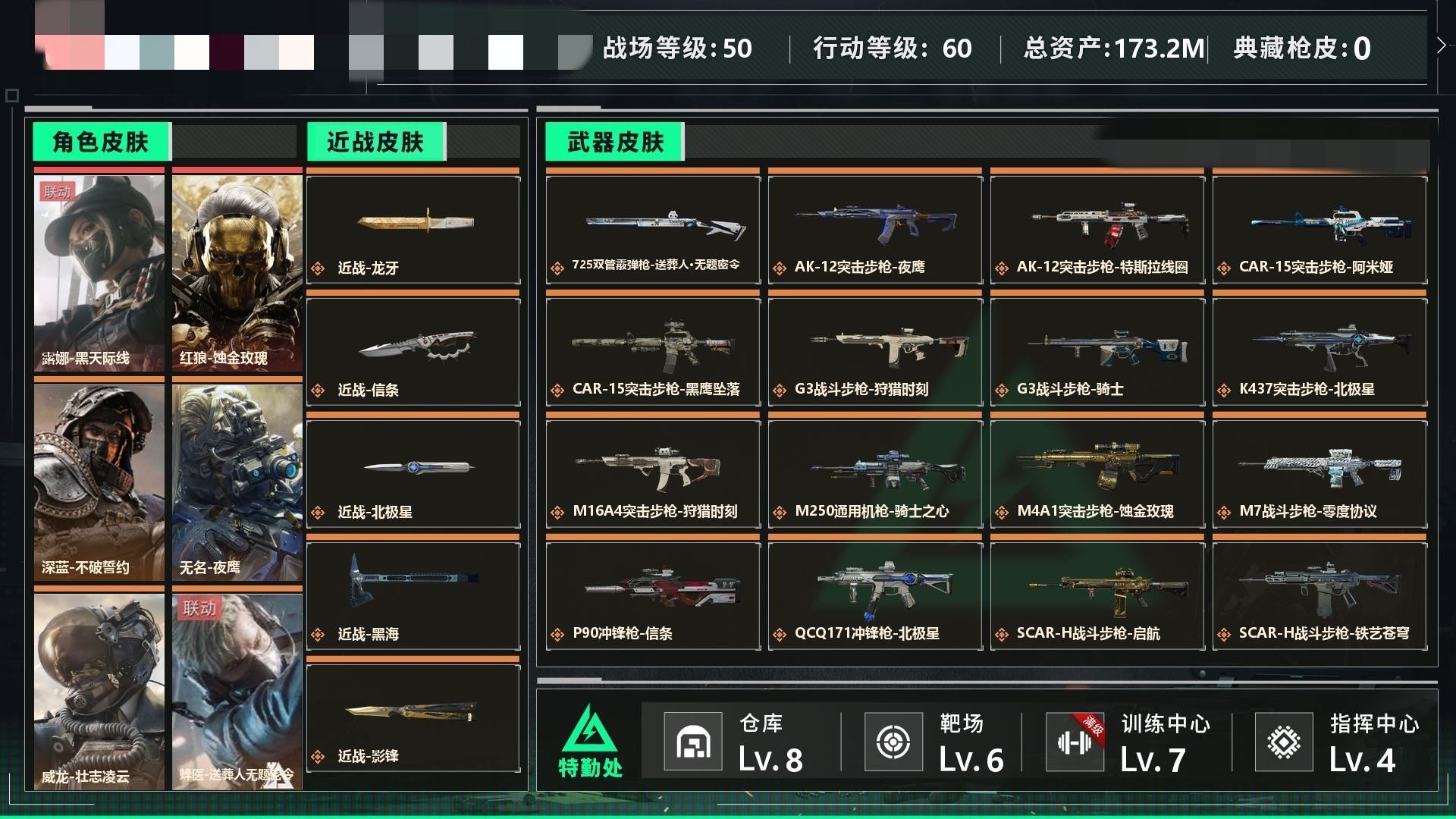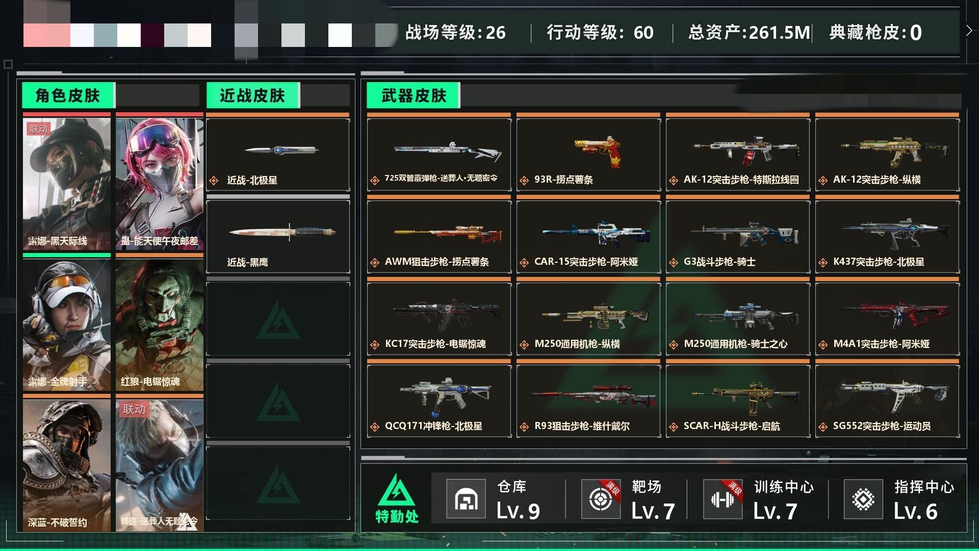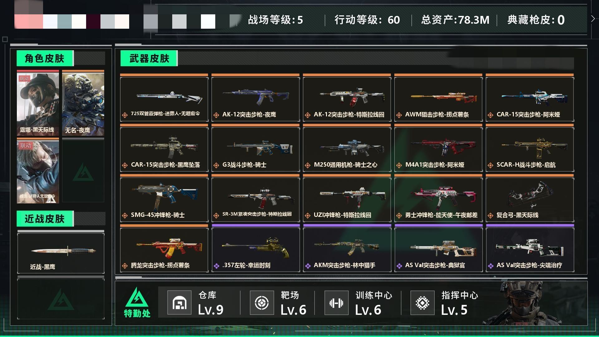 【游戏多多】 金(2747)【个人信息】战场等级5军士长, 行动等级60黑鹰 【哈夫币】64w 【总资产】78.3M 【货币】121三角券/20三角币 【特勤处】技术中心Lv.3/工作台Lv.3/制药台Lv.3/防具台Lv.3/仓库Lv.9/指挥中心Lv.5/训练中心Lv.6/靶场Lv.6/潜水中心Lv.2/收藏室Lv.2 【角色皮肤】露娜-黑天际线/无名-夜鹰/蜂医-送葬人无题密令 【已有捆绑包】捞点薯条捆绑包 【近战皮肤】近战-黑鹰 详情请看图