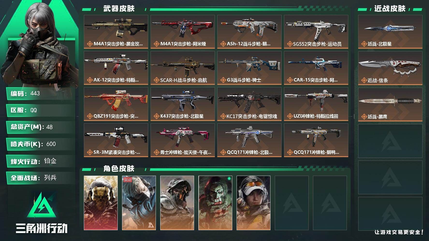 【游戏多多】 R51464 可二次QQ 【S7赛季9格】48m总资产-600k哈伏币-60烽火等级-铂金-26战场等级-列兵【仓库8级+指挥中心5级+训练中心7级+靶场7级+潜水中心3级+收藏室1级】【干员外观】:红狼-蚀金玫瑰,蜂医-送葬人·无题密令,深蓝-不破誓约,红狼-电锯惊魂,露娜-金牌射手【近战皮肤】:近战-北极星,近战-信条,近战-黑鹰【传说外观】:M4A1突击步枪-蚀金玫瑰,M4A1突击步枪-阿米娅,ASh-12战斗步枪-鹅鸭杀,SG552突击步枪-运动员,AK-12突击步枪-特斯拉线圈,SCAR-H战斗步枪-启航,G3战斗步枪-骑士,CAR-15突击步枪-阿米娅,腾龙突击步枪-捞点薯条,K437突击步枪-北极星,KC17突击步枪-电锯惊魂,UZI冲锋枪-特斯拉线圈,SR-3M紧凑突击步枪-特斯拉线圈,勇士冲锋枪-能天使-午夜邮差,QCQ171冲锋枪-北极星,QCQ171冲锋枪-鹅鸭杀,725双管霰弹枪-送葬人-无题密令,M250通用机枪-骑士之心,QJB201轻机枪-鹅鸭杀,M14射手步枪-电锯惊魂,AWM狙击步枪-捞点薯条,93R-捞点薯条,复合弓-黑·天际线,各种道具详情看截图、低价出售找回包 赔、截图展示段位不代 表实际段位,如赛季更新等不可抗拒因素发生变化、时限道具不保证所剩时间、标题未写送点劵默认不送【卖号买号首选亿梦】
