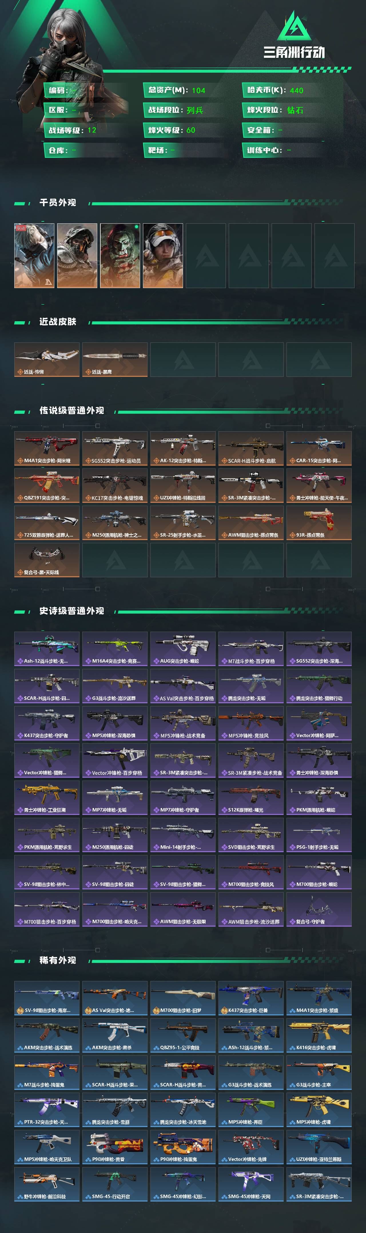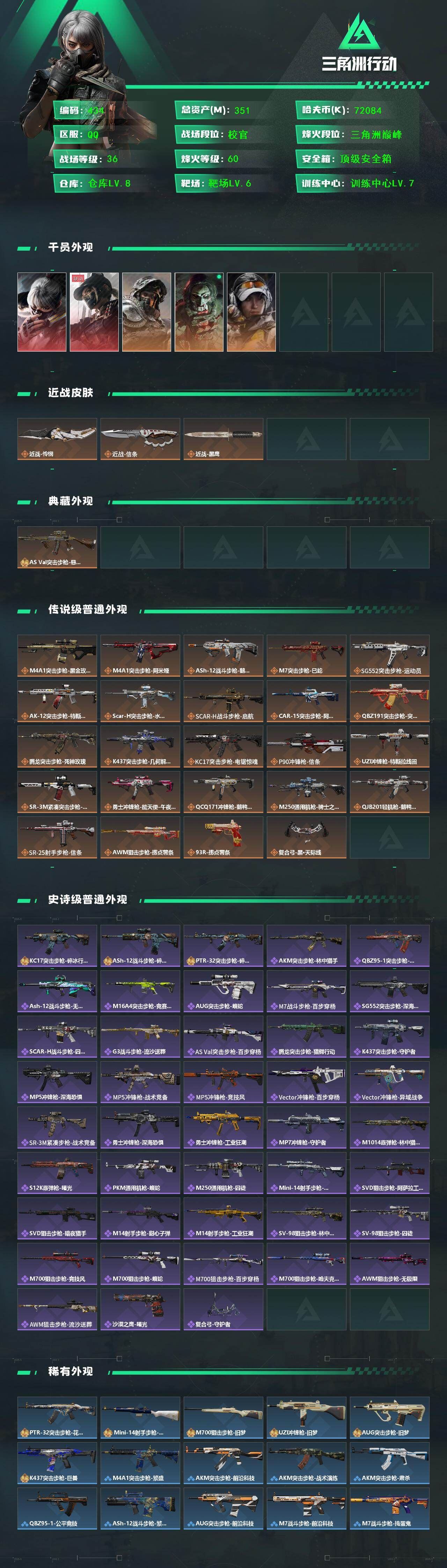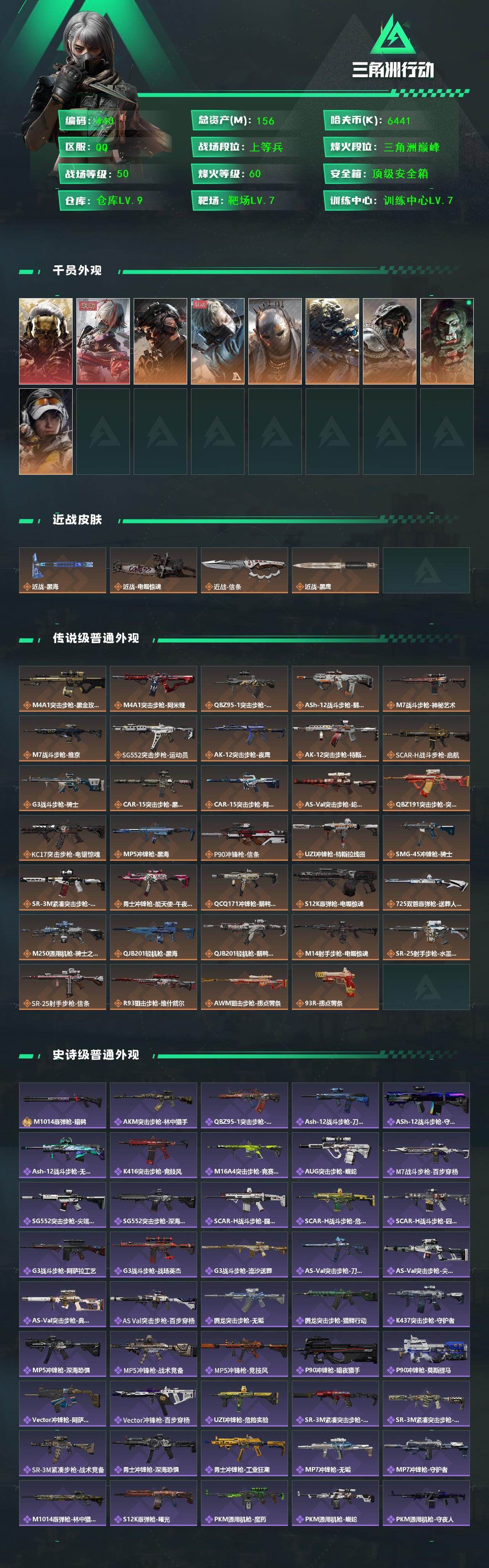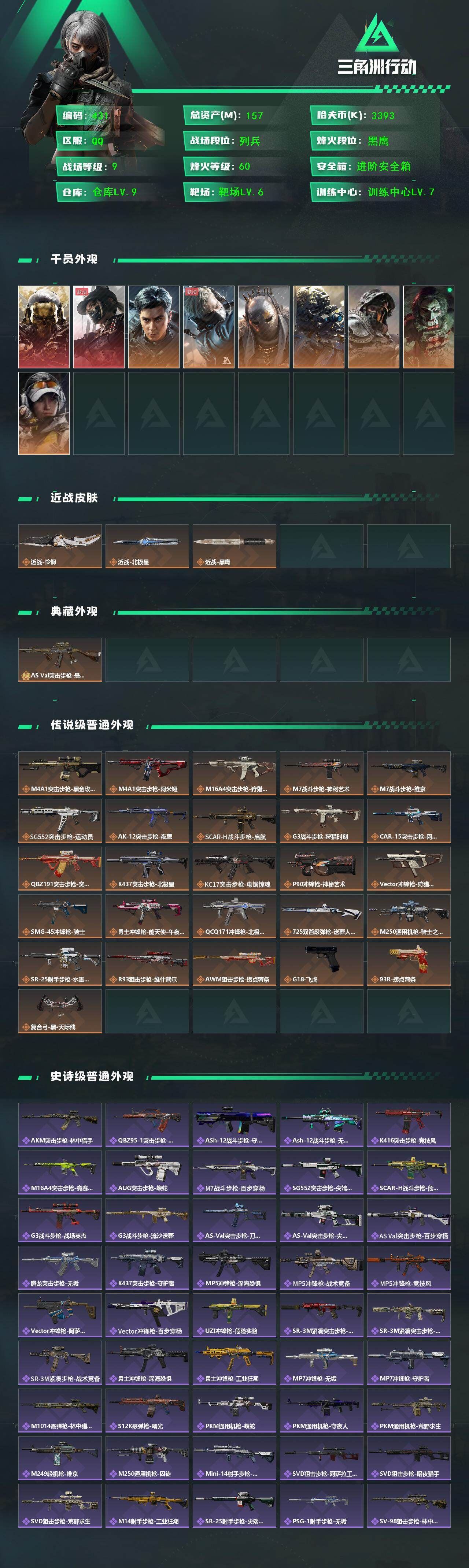 【游戏多多】 R51441 可二次QQ【S7赛季9格】【三角币854】405m总资产-113901k哈伏币-60烽火等级-黑鹰-29战场等级-上等兵【典藏外观】:M7战斗步枪-棱镜攻势S2极品B,AS Val突击步枪-悬赏令优品C【仓库10+指挥中心6级+训练中心7级+靶场7级+收藏室1级】【炫彩兰小登+阿米娅近卫】【非洲之心】【44发AWM子弹】【5组红弹】【干员外观】:红狼-蚀金玫瑰,骇爪-水墨云图,露娜-黑·天际线,威龙-壮志凌云,蜂医-送葬人·无题密令,无名-夜鹰,深蓝-不破誓约,红狼-电锯惊魂,露娜-金牌射手【近战皮肤】:近战-怜悯,近战-影锋,近战-北极星,近战-信条,近战-黑鹰【传说外观】:M4A1突击步枪-蚀金玫瑰,M4A1突击步枪-阿米娅,ASh-12战斗步枪-怜悯,ASh-12战斗步枪-鹅鸭杀,M16A4突击步枪-狩猎时刻,M7战斗步枪-怜悯,SG552突击步枪-运动员,AK-12突击步枪-夜鹰,SCAR-H战斗步枪-铁艺苍穹,SCAR-H战斗步枪-水墨云图,SCAR-H战斗步枪-启航,G3战斗步枪-狩猎时刻,CAR-15突击步枪-阿米娅,AS Val突击步枪-蛇年祥瑞,腾龙突击步枪-捞点薯条,K437突击步枪-北极星,KC17突击步枪-电锯惊魂,Vector冲锋枪-狩猎时刻,SMG-45冲锋枪-骑士,勇士冲锋枪-能天使-午夜邮差,QCQ171冲锋枪-北极星,QCQ171冲锋枪-鹅鸭杀,725双管霰弹枪-送葬人-无题密令,M250通用机枪-骑士之心,QJB201轻机枪-鹅鸭杀,SR-25射手步枪-水墨云图,PSG-1射手步枪-黑·天际线,AWM狙击步枪-捞点薯条,93R-捞点薯条,复合弓-黑·天际线,各种道具详情看截图、低价出售找回包 赔、截图展示段位不代 表实际段位,如赛季更新等不可抗拒因素发生变化、时限道具不保证所剩时间、标题未写送点劵默认不送【卖号买号首选亿梦】