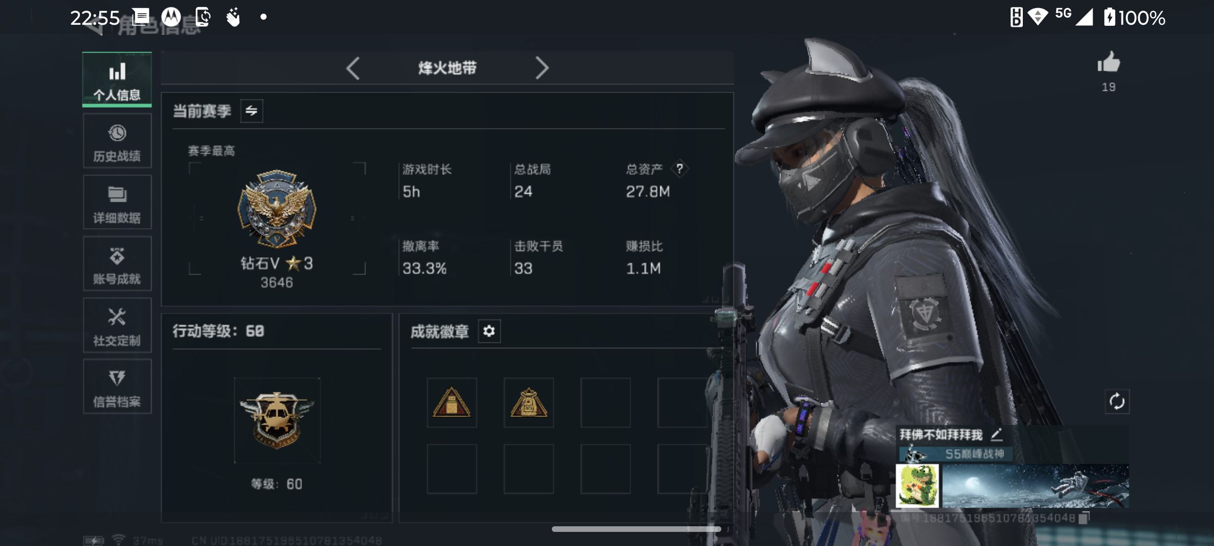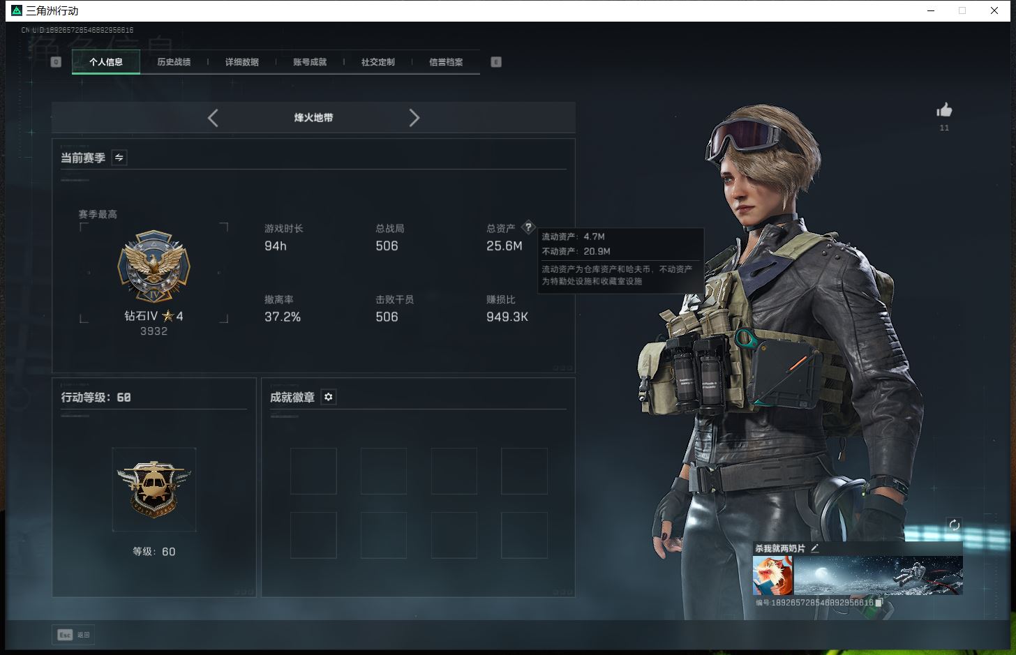 【游戏多多】 r50872 可二次qq,s7赛季安全箱9格,仓库9级,指挥中心6级,训练中心7级,靶场7级,收藏室2级,135发AWM子弹,391m总资产-140110k哈伏币-60烽火等级-钻石-47战场等级-上等兵【干员外观】:露娜-黑·天际线,无名-夜鹰,深蓝-不破誓约,红狼-电锯惊魂【近战皮肤】:近战-黑鹰【热门藏品】:非洲之心【挂饰】:挂饰-毁灭之源【传说外观】:M4A1突击步枪-阿米娅,ASh-12战斗步枪-鹅鸭杀,M16A4突击步枪-狩猎时刻,AK-12突击步枪-夜鹰,AK-12突击步枪-特斯拉线圈,SCAR-H战斗步枪-启航,G3战斗步枪-狩猎时刻,G3战斗步枪-骑士,CAR-15突击步枪-阿米娅,KC17突击步枪-电锯惊魂,Vector冲锋枪-狩猎时刻,UZI冲锋枪-特斯拉线圈,SMG-45冲锋枪-骑士,SR-3M紧凑突击步枪-特斯拉线圈,勇士冲锋枪-能天使-午夜邮差,QCQ171冲锋枪-鹅鸭杀,M250通用机枪-骑士之心,QJB201轻机枪-鹅鸭杀,复合弓-黑·天际线,各种道具详情看截图、低价出售找回包 赔、截图展示段位不代 表实际段位,如赛季更新等不可抗拒因素发生变化、时限道具不保证所剩时间、标题未写送点劵默认不送【卖号买号首选亿梦】