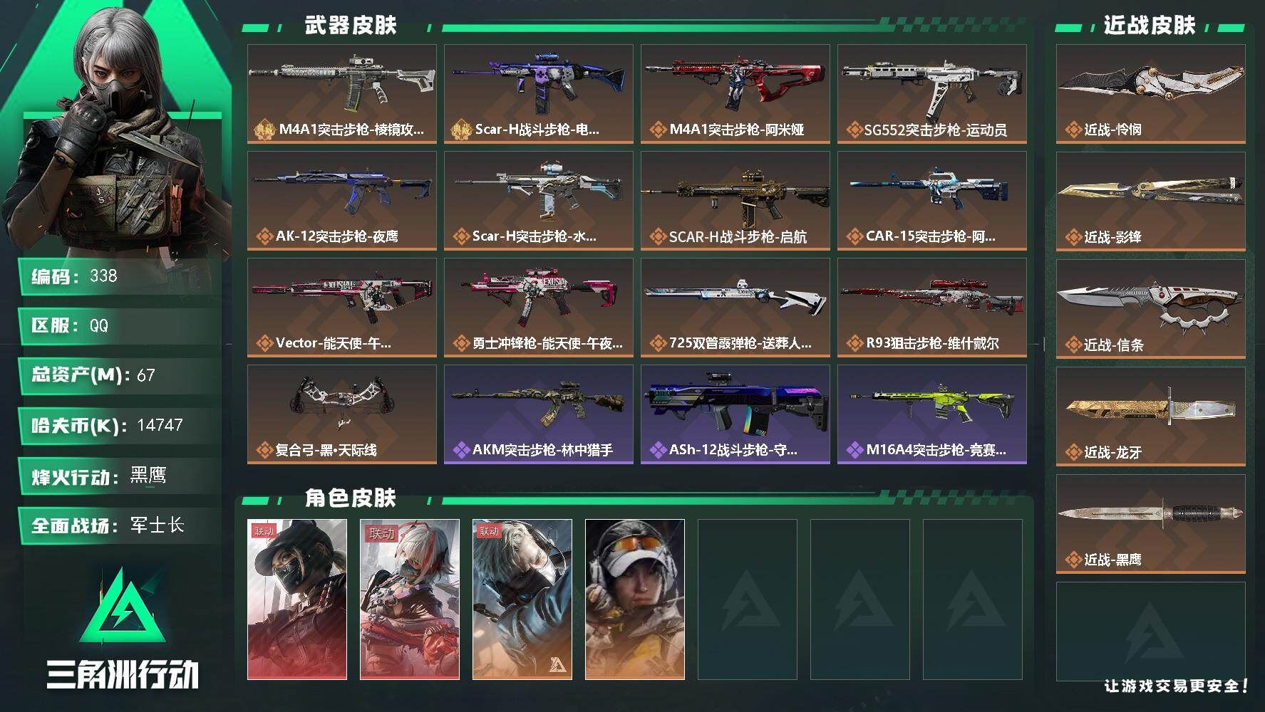 【游戏多多】 r50908 可二次qq【8天九格安全箱】【M7战斗步枪-棱镜攻势S2】【206m总资产-3473k哈伏币-60烽火等级-三角洲巅峰-46战场等级-上等兵】【非洲之心】【仓库9级/训练中心7级】【红狼-蚀金玫瑰,露娜-黑·天际线,威龙-飞虎,蜂医-送葬人·无题密令,无名-夜鹰,深蓝-不破誓约,红狼-电锯惊魂,露娜-金牌射手】【近战-北极星,近战-信条,近战-黑鹰】【M4A1突击步枪-蚀金玫瑰,M4A1突击步枪-阿米娅,M16A4突击步枪-狩猎时刻,M7战斗步枪-零度协议,SG552突击步枪-运动员,AK-12突击步枪-夜鹰,AK-12突击步枪-特斯拉线圈,SCAR-H战斗步枪-水墨云图,SCAR-H战斗步枪-启航,G3战斗步枪-狩猎时刻,CAR-15突击步枪-黑鹰坠落,CAR-15突击步枪-阿米娅,K437突击步枪-北极星,KC17突击步枪-电锯惊魂,P90冲锋枪-信条,Vector冲锋枪-狩猎时刻,UZI冲锋枪-特斯拉线圈,SMG-45冲锋枪-骑士,SR-3M紧凑突击步枪-特斯拉线圈,勇士冲锋枪-能天使-午夜邮差,QCQ171冲锋枪-北极星,725双管霰弹枪-送葬人-无题密令,M250通用机枪-骑士之心,SR-25射手步枪-信条,G18-飞虎,复合弓-黑·天际线】各种道具详情看截图、低价出售找回包 赔、截图展示段位不代 表实际段位,如赛季更新等不可抗拒因素发生变化、时限道具不保证所剩时间、标题未写送点劵默认不送【卖号买号首选亿梦】