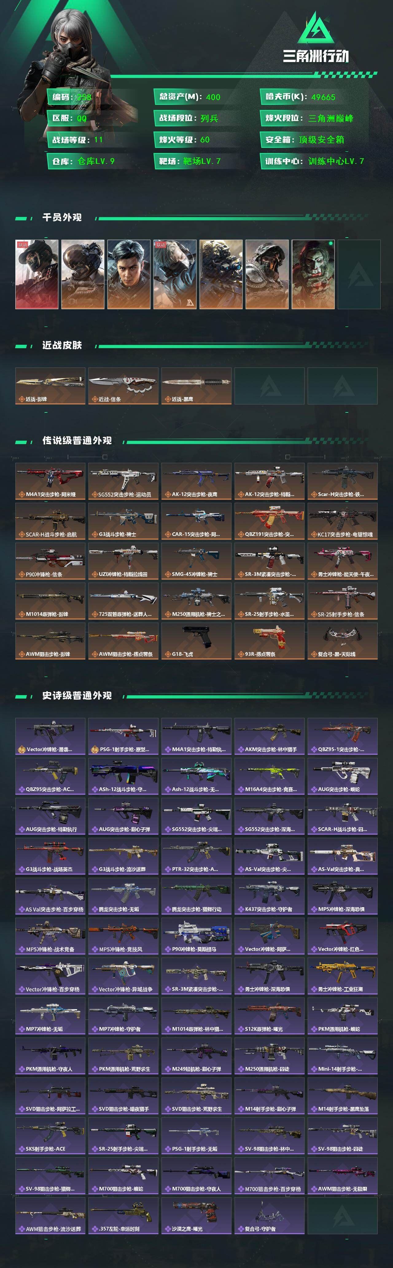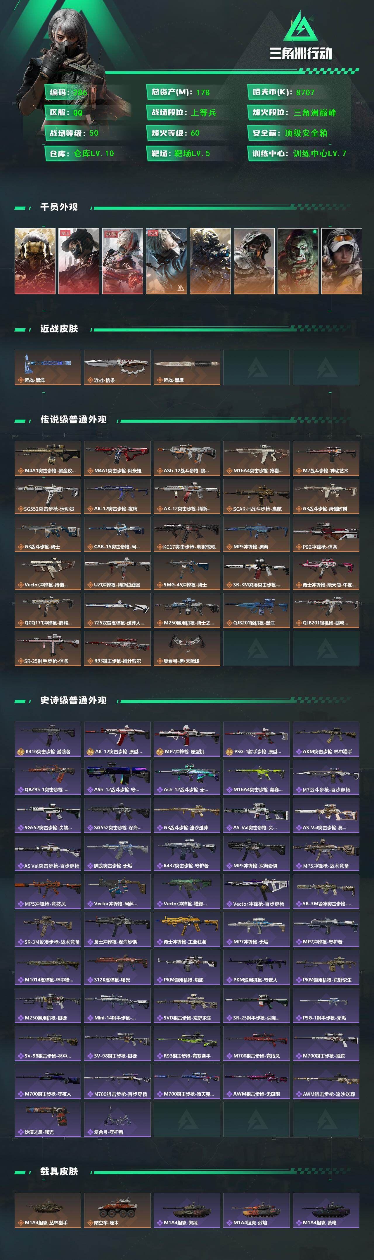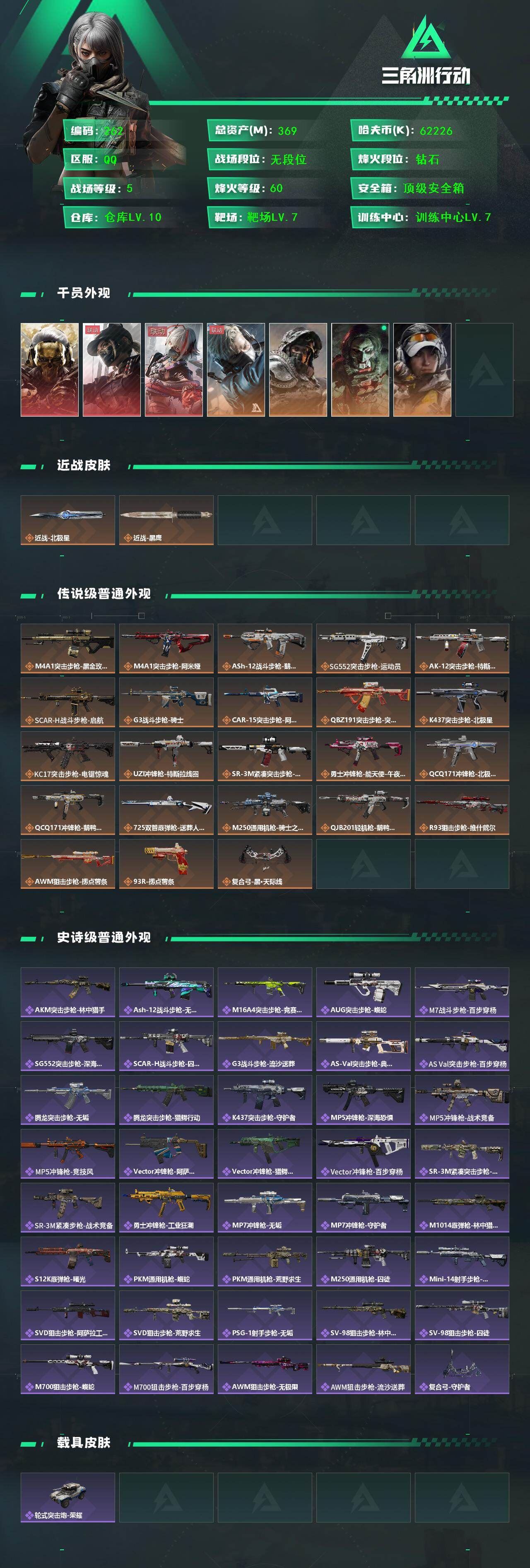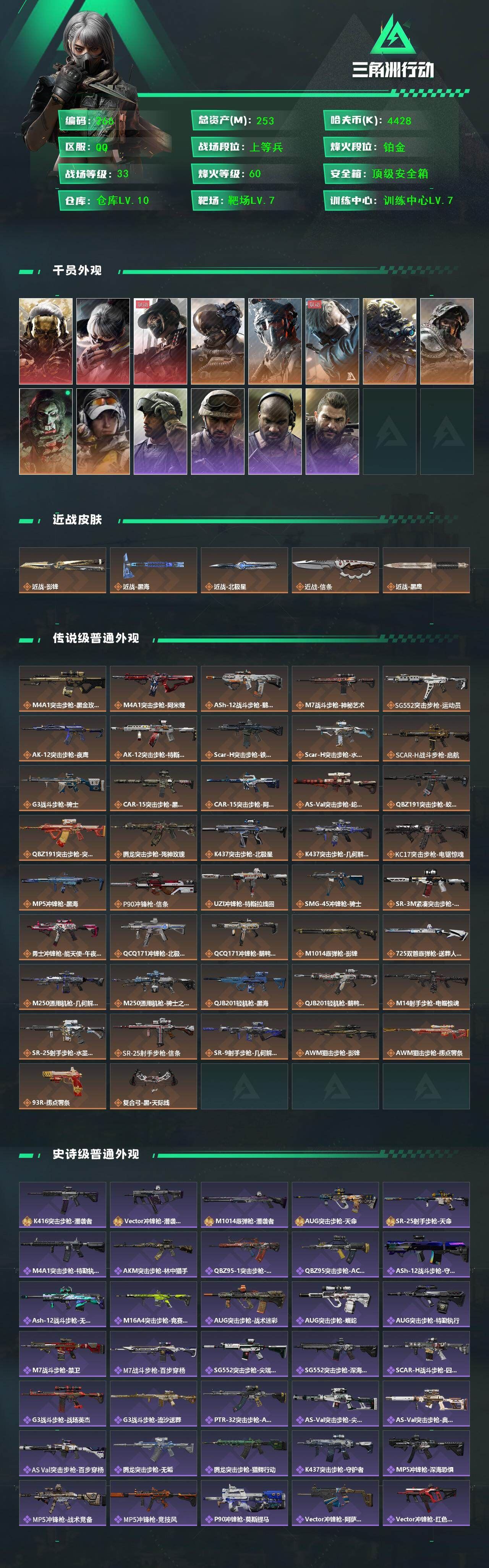 【游戏多多】 X557 54m总资产-2531k哈伏币-60烽火等级-钻石-41战场等级-校官【干员外观】:红狼-蚀金玫瑰,蛊-能天使午夜邮差,蜂医-送葬人·无题密令,深蓝-不破誓约,露娜-金牌射手【近战皮肤】:近战-黑鹰【典藏外观】:Vector冲锋枪-美杜莎【传说外观】:M4A1突击步枪-蚀金玫瑰,M4A1突击步枪-阿米娅,ASh-12战斗步枪-鹅鸭杀,SG552突击步枪-运动员,AK-12突击步枪-特斯拉线圈,SCAR-H战斗步枪-启航,G3战斗步枪-骑士,CAR-15突击步枪-阿米娅,腾龙突击步枪-捞点薯条,Vector冲锋枪-能天使-午夜邮差,UZI冲锋枪-特斯拉线圈,SMG-45冲锋枪-骑士,SR-3M紧凑突击步枪-特斯拉线圈,勇士冲锋枪-能天使-午夜邮差,QCQ171冲锋枪-鹅鸭杀,725双管霰弹枪-送葬人-无题密令,M250通用机枪-骑士之心,QJB201轻机枪-鹅鸭杀,AWM狙击步枪-捞点薯条,93R-捞点薯条,复合弓-黑·天际线【史诗外观】:AKM突击步枪-林中猎手,ASh-12战斗步枪-无极限,M16A4突击步枪-竞赛选手,AUG突击步枪-蝮蛇,M7战斗步枪-百步穿杨,SCAR-H战斗步枪-囚徒,G3战斗步枪-流沙送葬,AS Val突击步枪-百步穿杨,腾龙突击步枪-无垢,K437突击步枪-守护者,MP5冲锋枪-深海恐惧,MP5冲锋枪-战术竞备,MP5冲锋枪-竞技风,Vector冲锋枪-猎鳄行动,Vector冲锋枪-百步穿杨,SR-3M紧凑突击步枪-荒野求生,SR-3M紧凑突击步枪-战术竞备,勇士冲锋枪-深海恐惧,勇士冲锋枪-工业狂潮,MP7冲锋枪-无垢,MP7冲锋枪-守护者,M1014霰弹枪-林中猎手,S12K霰弹枪-曙光,PKM通用机枪-蝮蛇,PKM通用机枪-荒野求生,M250通用机枪-囚徒,Mini-14射手步枪-守护者,SVD狙击步枪-阿萨拉工艺,SVD狙击步枪-荒野求生,PSG-1射手步枪-无垢,SV-98狙击步枪-林中猎手,M700狙击步枪-竞技风,M700狙击步枪-蝮蛇,M700狙击步枪-百步穿杨,M700狙击步枪-哈夫克警备,AWM狙击步枪-无极限,AWM狙击步枪-流沙送葬,沙漠之鹰-曙光,复合弓-守护者【稀有外观】:M700狙击步枪-阿萨拉卫队,野牛冲锋枪-黑潮,M14射手步枪-巨兽,M4A1突击步枪-繁盛,AKM突击步枪-战术演练,AKM突击步枪-肃杀,QBZ95-1突击步枪-公平竞技,ASh-12战斗步枪-繁盛,K416突击步枪-虎啸,M7战斗步枪-捣蛋鬼,SCAR-H战斗步枪-荣耀列队,SCAR-H战斗步枪-黄昏,G3战斗步枪-战术演练,G3战斗步枪-主宰,腾龙突击步枪-雪崩,MP5冲锋枪-前沿科技,MP5冲锋枪-弄臣,MP5冲锋枪-虎啸,MP5冲锋枪-哈夫克卫队,P90冲锋枪-新生,P90冲锋枪-黄昏,Vector冲锋枪-先锋,UZI冲锋枪-前沿科技,UZI冲锋枪-亚特兰蒂斯,野牛冲锋枪-前沿科技,SMG-45-行动开启,SMG-45冲锋枪-幻影结构,SMG-45冲锋枪-天网,SR-3M紧凑突击步枪-雪崩,勇士冲锋枪-主宰,勇士冲锋枪-冰天雪地,MP7冲锋枪-幻影结构,M1014霰弹枪-幻影结构,S12K霰弹枪-战术演练,M250通用机枪-虎啸,QJB201轻机枪-前沿科技,QJB201轻机枪-黄昏,QJB201轻机枪-哈夫克卫队,Mini-14射手步枪-荣耀列队,SKS射手步枪-弄臣,SKS射手步枪-雪崩,SR-25射手步枪-开拓,SR-9射手步枪-街头涂鸦,SR9射手步枪-肃杀,PSG-1射手步枪-主宰,SV-98狙击步枪-星链科技,SV-98狙击步枪-哈夫克航天,SV-98狙击步枪-精英联盟,G18-星链科技,G18-哈夫克航天