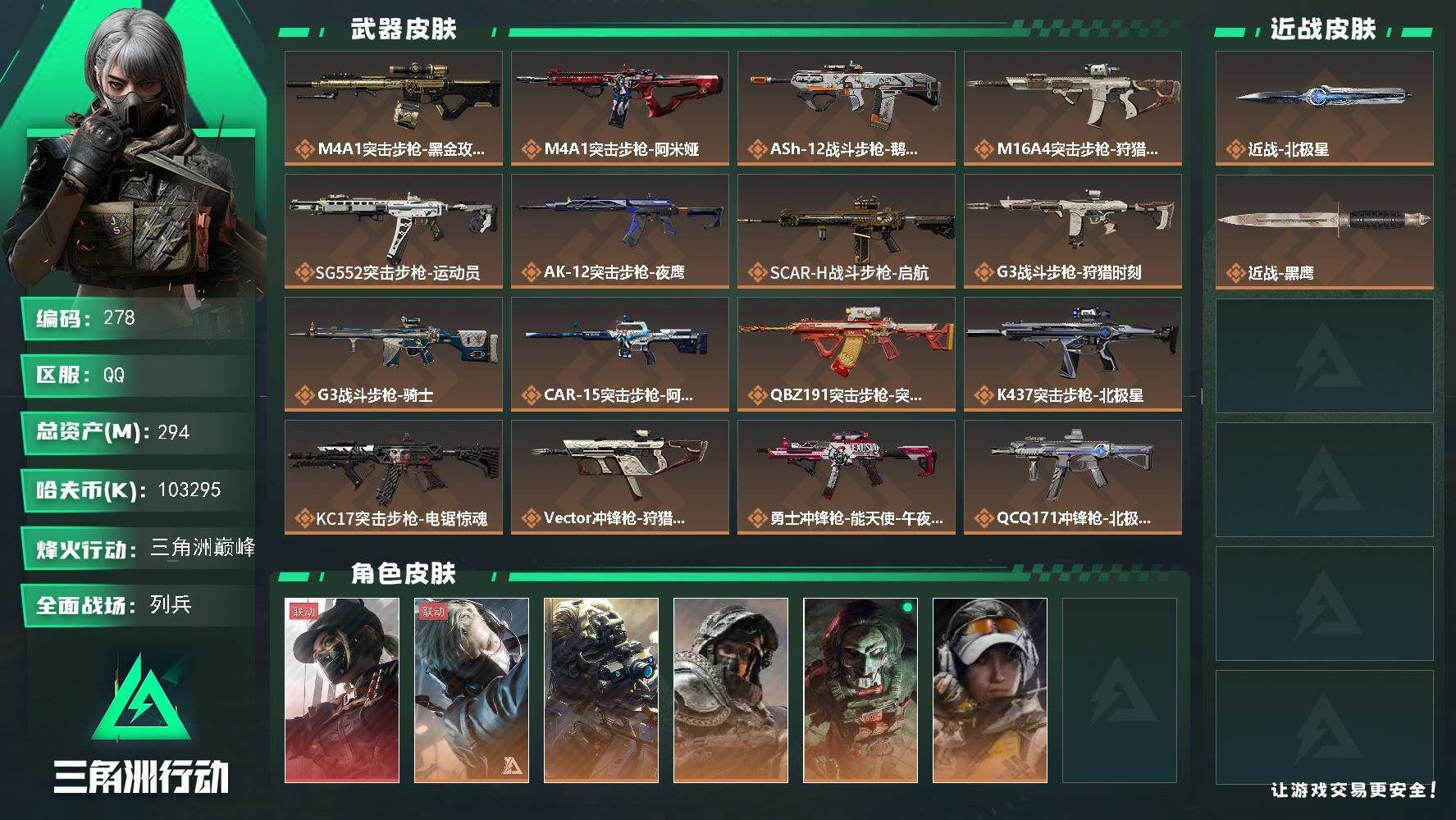 【游戏多多】 R50355 可二次QQ【S7赛季9格】294m总资产-103295k哈伏币-60烽火等级-三角洲巅峰-17战场等级-列兵【仓库8级+指挥中心5级+训练中心7级+靶场6级+收藏室1级】【炫彩克小圈+阿米娅近卫】【260发AWM子弹】【干员外观】:露娜-黑·天际线,蜂医-送葬人·无题密令,无名-夜鹰,深蓝-不破誓约,红狼-电锯惊魂,露娜-金牌射手【近战皮肤】:近战-北极星,近战-黑鹰【传说外观】:M4A1突击步枪-蚀金玫瑰,M4A1突击步枪-阿米娅,ASh-12战斗步枪-鹅鸭杀,M16A4突击步枪-狩猎时刻,SG552突击步枪-运动员,AK-12突击步枪-夜鹰,SCAR-H战斗步枪-启航,G3战斗步枪-狩猎时刻,G3战斗步枪-骑士,CAR-15突击步枪-阿米娅,腾龙突击步枪-捞点薯条,K437突击步枪-北极星,KC17突击步枪-电锯惊魂,Vector冲锋枪-狩猎时刻,勇士冲锋枪-能天使-午夜邮差,QCQ171冲锋枪-北极星,QCQ171冲锋枪-鹅鸭杀,725双管霰弹枪-送葬人-无题密令,M250通用机枪-骑士之心,QJB201轻机枪-鹅鸭杀,AWM狙击步枪-捞点薯条,93R-捞点薯条,复合弓-黑·天际线,各种道具详情看截图、低价出售找回包 赔、截图展示段位不代 表实际段位,如赛季更新等不可抗拒因素发生变化、时限道具不保证所剩时间、标题未写送点劵默认不送【卖号买号首选亿梦】