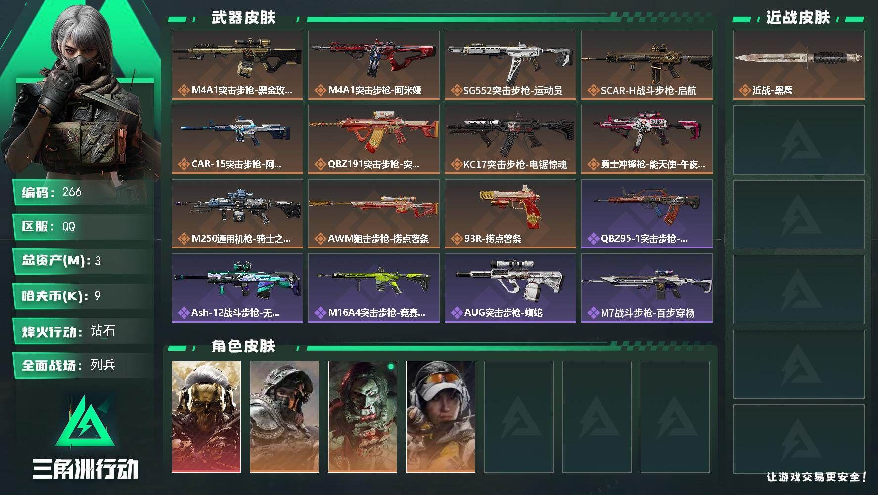 【游戏多多】 X332 3m总资产-9k哈伏币-60烽火等级-钻石-6战场等级-列兵【干员外观】:红狼-蚀金玫瑰,深蓝-不破誓约,红狼-电锯惊魂,露娜-金牌射手【近战皮肤】:近战-黑鹰【传说外观】:M4A1突击步枪-蚀金玫瑰,M4A1突击步枪-阿米娅,SG552突击步枪-运动员,SCAR-H战斗步枪-启航,CAR-15突击步枪-阿米娅,腾龙突击步枪-捞点薯条,KC17突击步枪-电锯惊魂,勇士冲锋枪-能天使-午夜邮差,M250通用机枪-骑士之心,AWM狙击步枪-捞点薯条,93R-捞点薯条【史诗外观】:QBZ95-1突击步枪-曙光,ASh-12战斗步枪-无极限,M16A4突击步枪-竞赛选手,AUG突击步枪-蝮蛇,M7战斗步枪-百步穿杨,G3战斗步枪-流沙送葬,AS Val突击步枪-百步穿杨,K437突击步枪-守护者,MP5冲锋枪-战术竞备,MP5冲锋枪-竞技风,Vector冲锋枪-阿萨拉文明,Vector冲锋枪-猎鳄行动,Vector冲锋枪-百步穿杨,SR-3M紧凑突击步枪-战术竞备,勇士冲锋枪-深海恐惧,勇士冲锋枪-工业狂潮,MP7冲锋枪-守护者,S12K霰弹枪-曙光,Mini-14射手步枪-守护者,SV-98狙击步枪-林中猎手,M700狙击步枪-竞技风,M700狙击步枪-蝮蛇,M700狙击步枪-百步穿杨,AWM狙击步枪-无极限,AWM狙击步枪-流沙送葬,复合弓-守护者【稀有外观】:SR-3M紧凑突击步枪-巨兽,M4A1突击步枪-繁盛,AKM突击步枪-战术演练,AKM突击步枪-肃杀,QBZ95-1突击步枪-医疗协议,QBZ95-1突击步枪-公平竞技,ASh-12战斗步枪-繁盛,M7战斗步枪-捣蛋鬼,SCAR-H战斗步枪-荣耀列队,SCAR-H战斗步枪-黄昏,G3战斗步枪-战术演练,G3战斗步枪-主宰,PTR-32突击步枪-天网,腾龙突击步枪-冰天雪地,MP5冲锋枪-弄臣,MP5冲锋枪-虎啸,MP5冲锋枪-哈夫克卫队,P90冲锋枪-黄昏,Vector冲锋枪-先锋,UZI冲锋枪-亚特兰蒂斯,SMG-45-行动开启,勇士冲锋枪-主宰,勇士冲锋枪-冰天雪地,S12K霰弹枪-战术演练,M249轻机枪-毛鲁斯之力,QJB201轻机枪-黄昏,QJB201轻机枪-哈夫克卫队,Mini-14射手步枪-荣耀列队,SKS射手步枪-弄臣,SR-25射手步枪-开拓,SR-9射手步枪-街头涂鸦,PSG-1射手步枪-主宰,SV-98狙击步枪-星链科技,SV-98狙击步枪-哈夫克航天,SV-98狙击步枪-精英联盟,G18-星链科技,G18-哈夫克航天【普通外观】:AK-12突击步枪-旧工业,PKM通用机枪-旧工业,S12K霰弹枪-古铜,M4A1突击步枪-粉色涂装,M4A1突击步枪-高雅黑,QBZ95-1突击步枪-高雅黑,QBZ95-1突击步枪-海浪,QBZ95-1突击步枪-海色,QBZ191突击步枪-三角洲力量,K416突击步枪-几何迷彩,K416突击步枪-高雅黑,M16A4突击步枪-山林猎人,M16A4突击步枪-高雅黑,AUG突击步枪-浅蓝涂装,M7战斗步枪-红色涂装,SG552突击步枪-浅蓝涂装,SG552突击步枪-海浪,AK-12突击步枪-变色龙,SCAR-H战斗步枪-数码迷彩,SCAR-H战斗步枪-电路图,G3战斗步枪-高雅黑,PTR-32突击步枪-黄蜂,PTR-32突击步枪-条纹,CAR-15突击步枪-电路图,CAR-15突击步枪-变色龙,K437突击步枪-磐石,MP5冲锋枪-安全工作,MP5冲锋枪-海色,MP5冲锋枪-黄蜂,P90冲锋枪-电路图,Vector冲锋枪-几何迷彩,UZI冲锋枪-海色,野牛冲锋枪-高雅黑,SMG-45冲锋枪-条纹,SR-3M紧凑突击步枪-变色龙,QCQ171冲锋枪-三角洲力量,M1014霰弹枪-高雅黑,M1014霰弹枪-海浪,M1014霰弹枪-变色龙,725双管霰弹枪-条纹,PKM通用机枪-彩墨喷涂,M249轻机枪-黄蜂,M250通用机枪-条纹,QJB201轻机枪-三角洲力量,QJB201轻机枪-磐石,SVD狙击步枪-高雅黑,SVD狙击步枪-电路图,SR-25射手步枪-黄蜂,SR9射手步枪-磐石,SV-98狙击步枪-红色涂装,SV-98狙击步枪-条纹,R93狙击步枪-变色龙,QSZ92G-电路图,QSZ92G-条纹,沙漠之鹰-海浪,沙漠之鹰-高雅黑【载具外观】:轮式突击炮-域外狂徒,M1A4坦克-烈焰,M1A4坦克-移动堡垒,步战车-移动堡垒,防空车-凝视,防空车-移动堡垒,轮式突击炮-荣耀,轮式突击炮-移动堡垒,突击直升机-凝视,GTQ35坦克-移动堡垒