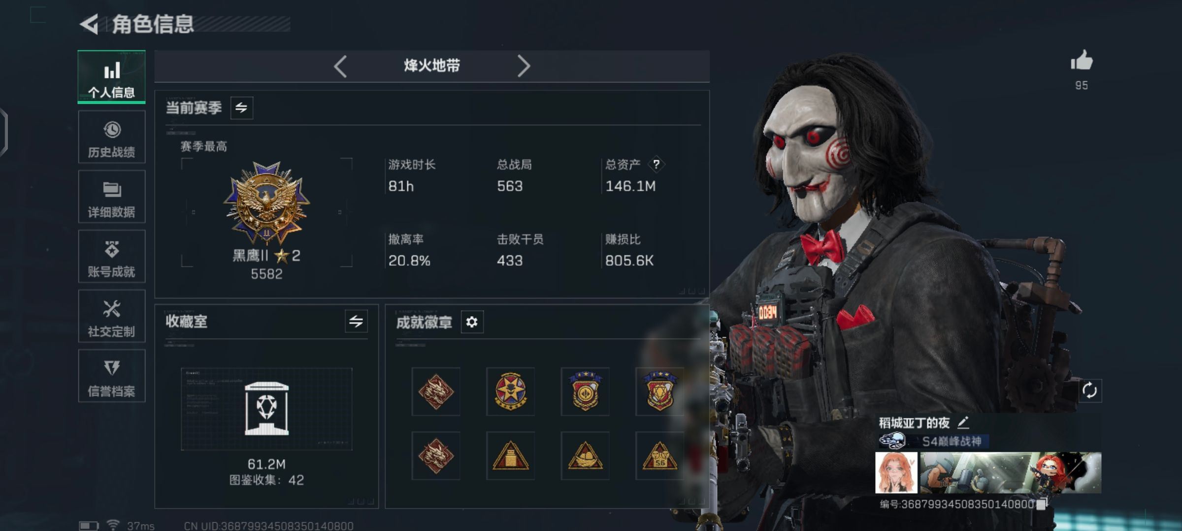 【游戏多多】 R47324 可二次QQ 619m总资产-315k哈伏币-60烽火等级-钻石-1战场等级-无军衔【仓库10级+指挥中心6级+训练中心7级+靶场7级+潜水中心3级+收藏室2级】【138发AWM子弹】【有心有泪】【干员外观】:骇爪-维什戴尔,蜂医-送葬人·无题密令,深蓝-不破誓约,红狼-电锯惊魂【近战皮肤】:近战-北极星,近战-黑鹰【传说外观】:M4A1突击步枪-阿米娅,ASh-12战斗步枪-鹅鸭杀,SG552突击步枪-运动员,AK-12突击步枪-特斯拉线圈,SCAR-H战斗步枪-启航,G3战斗步枪-骑士,CAR-15突击步枪-阿米娅,腾龙突击步枪-捞点薯条,K437突击步枪-北极星,KC17突击步枪-电锯惊魂,UZI冲锋枪-特斯拉线圈,SR-3M紧凑突击步枪-特斯拉线圈,勇士冲锋枪-能天使-午夜邮差,QCQ171冲锋枪-北极星,QCQ171冲锋枪-鹅鸭杀,725双管霰弹枪-送葬人-无题密令,M250通用机枪-骑士之心,QJB201轻机枪-鹅鸭杀,R93狙击步枪-维什戴尔,AWM狙击步枪-捞点薯条,93R-捞点薯条,各种道具详情看截图、低价出售找回包 赔、截图展示段位不代 表实际段位,如赛季更新等不可抗拒因素发生变化、时限道具不保证所剩时间、标题未写送点劵默认不送【卖号买号首选亿梦】