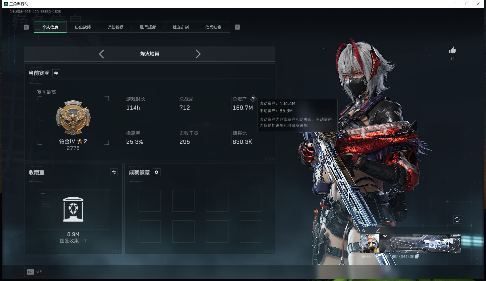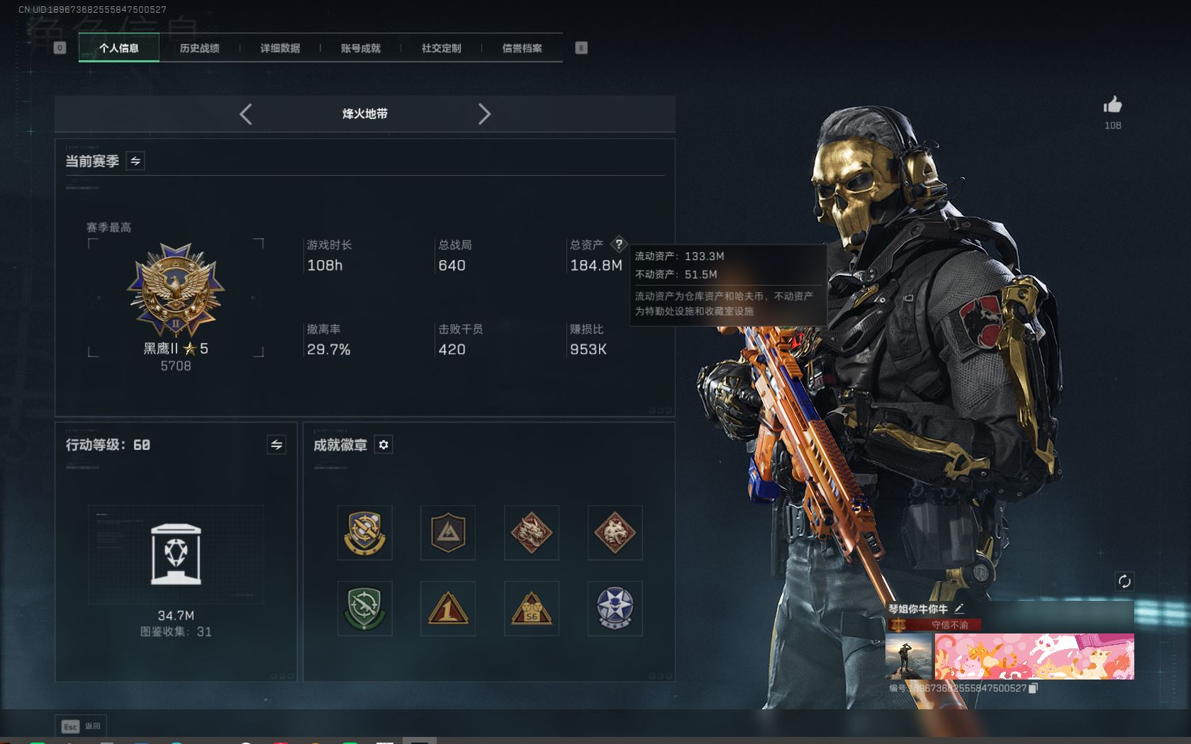 【游戏多多】 总资产169m/流动资金100M/3*3已经做完/安全箱皮肤差三个任务/信条刀皮/M7优品A皮肤/部门等级全满/潜水1级/收藏室1级/其余全满/电锯惊魂/不破誓约/金牌射手/维什戴尔/58个咖啡豆/炫彩兰小登/141枪皮/