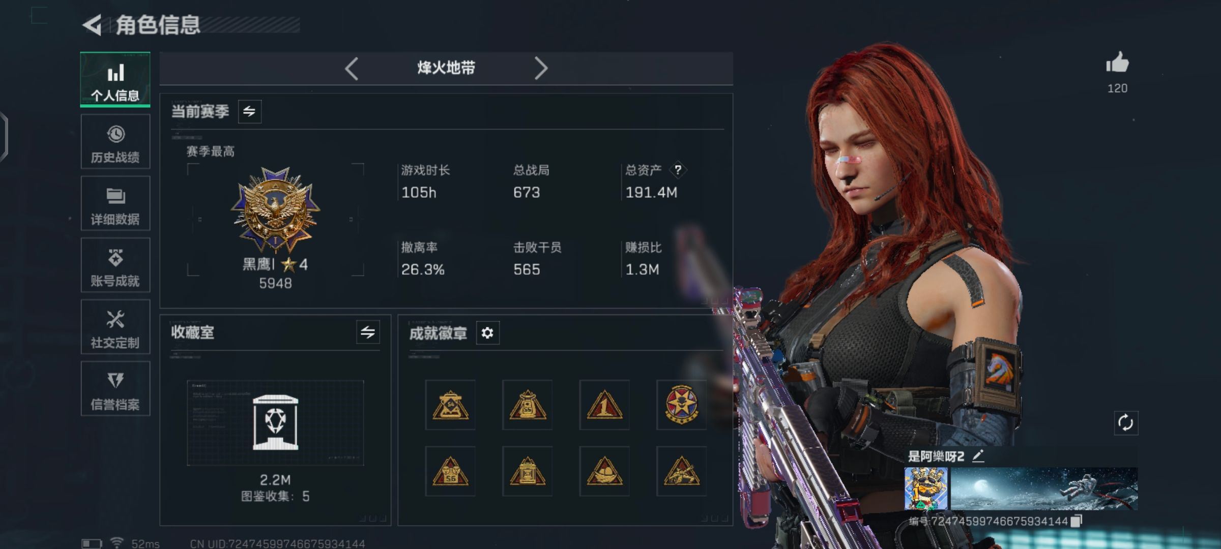 【游戏多多】 R48597 可二次QQ 【S7赛季9格】191m总资产-207k哈伏币-60烽火等级-黑鹰-50战场等级-上等兵【典藏外观】:SCAR-H战斗步枪-电玩高手*2(优品C/极品S),K416突击步枪-命运极品S,腾龙突击步枪-气象感应优品B,M7战斗步枪-棱镜攻势S2*4(优品A/优品S/极品A/极品B),AS Val突击步枪-悬赏令极品C【仓库10级+指挥中心6级+训练中心7级+靶场7级+潜水中心3级+收藏室2级】【挂饰:毁灭之源】【炫彩麦小蛋】【干员外观】:红狼-蚀金玫瑰,骇爪-水墨云图,露娜-黑·天际线,蛊-能天使午夜邮差,骇爪-维什戴尔,威龙-壮志凌云,威龙-飞虎,蜂医-送葬人·无题密令,无名-夜鹰,深蓝-不破誓约,红狼-电锯惊魂,露娜-金牌射手【近战皮肤】:近战-影锋,近战-黑海,近战-北极星,近战-信条,近战-黑鹰【传说外观】:M4A1突击步枪-蚀金玫瑰,M4A1突击步枪-阿米娅,ASh-12战斗步枪-鹅鸭杀,SG552突击步枪-运动员,AK-12突击步枪-夜鹰,AK-12突击步枪-特斯拉线圈,SCAR-H战斗步枪-铁艺苍穹,SCAR-H战斗步枪-水墨云图,SCAR-H战斗步枪-启航,CAR-15突击步枪-阿米娅,腾龙突击步枪-捞点薯条,K437突击步枪-北极星,KC17突击步枪-电锯惊魂,MP5冲锋枪-黑海,P90冲锋枪-信条,Vector冲锋枪-能天使-午夜邮差,UZI冲锋枪-特斯拉线圈,SMG-45冲锋枪-骑士,SR-3M紧凑突击步枪-特斯拉线圈,勇士冲锋枪-能天使-午夜邮差,QCQ171冲锋枪-北极星,QCQ171冲锋枪-鹅鸭杀,M1014霰弹枪-影锋,725双管霰弹枪-送葬人-无题密令,M250通用机枪-骑士之心,M250通用机枪-纵横,QJB201轻机枪-黑海,QJB201轻机枪-鹅鸭杀,M14射手步枪-电锯惊魂,SR-25射手步枪-信条,PSG-1射手步枪-黑·天际线,R93狙击步枪-维什戴尔,AWM狙击步枪-影锋,AWM狙击步枪-捞点薯条,G18-飞虎,93R-捞点薯条,复合弓-黑·天际线,各种道具详情看截图、低价出售找回包 赔、截图展示段位不代 表实际段位,如赛季更新等不可抗拒因素发生变化、时限道具不保证所剩时间、标题未写送点劵默认不送【卖号买号首选亿梦】