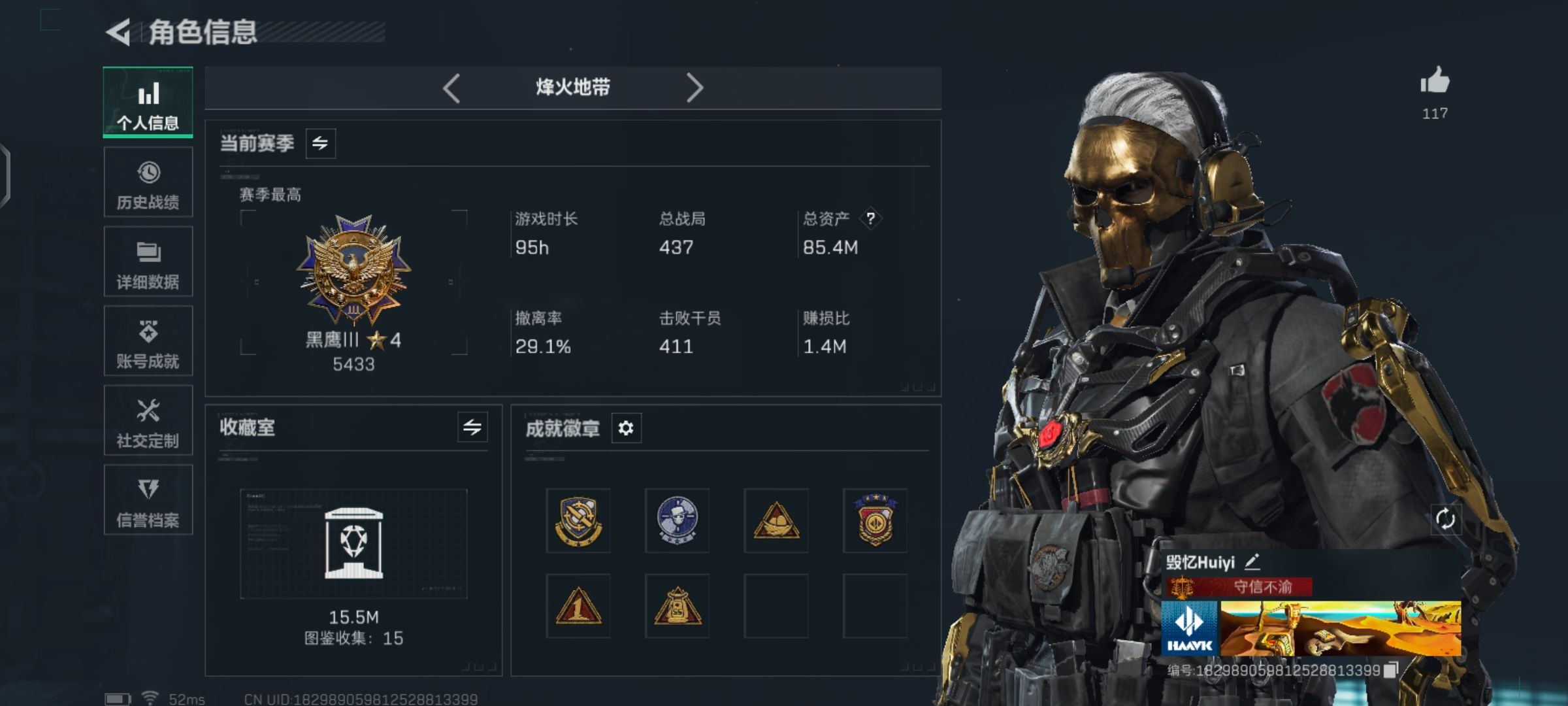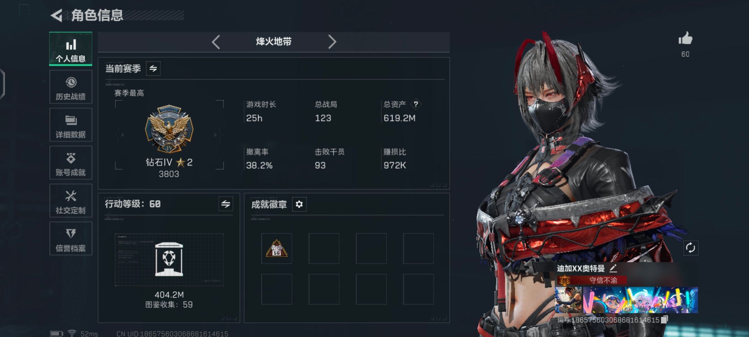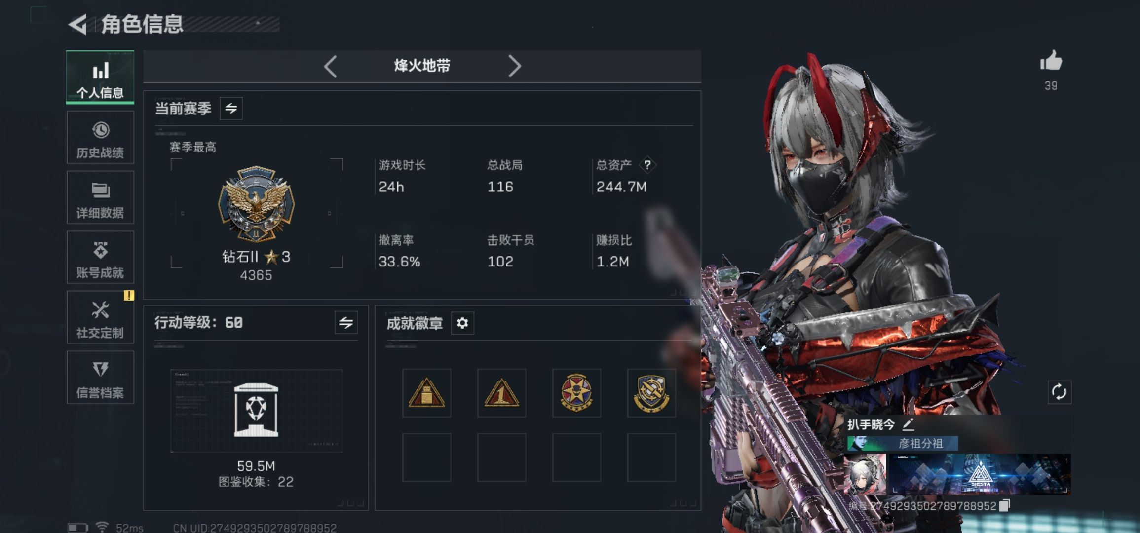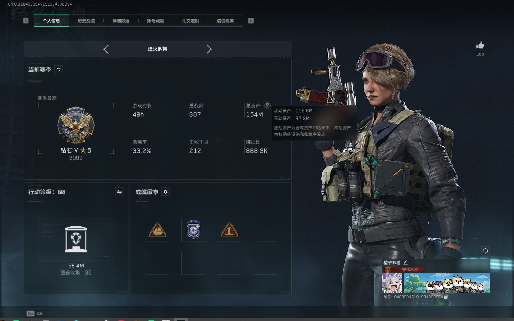 【游戏多多】 R47324 可二次QQ 619m总资产-315k哈伏币-60烽火等级-钻石-1战场等级-无军衔【仓库10级+指挥中心6级+训练中心7级+靶场7级+潜水中心3级+收藏室2级】【138发AWM子弹】【有心有泪】【干员外观】:骇爪-维什戴尔,蜂医-送葬人·无题密令,深蓝-不破誓约,红狼-电锯惊魂【近战皮肤】:近战-北极星,近战-黑鹰【传说外观】:M4A1突击步枪-阿米娅,ASh-12战斗步枪-鹅鸭杀,SG552突击步枪-运动员,AK-12突击步枪-特斯拉线圈,SCAR-H战斗步枪-启航,G3战斗步枪-骑士,CAR-15突击步枪-阿米娅,腾龙突击步枪-捞点薯条,K437突击步枪-北极星,KC17突击步枪-电锯惊魂,UZI冲锋枪-特斯拉线圈,SR-3M紧凑突击步枪-特斯拉线圈,勇士冲锋枪-能天使-午夜邮差,QCQ171冲锋枪-北极星,QCQ171冲锋枪-鹅鸭杀,725双管霰弹枪-送葬人-无题密令,M250通用机枪-骑士之心,QJB201轻机枪-鹅鸭杀,R93狙击步枪-维什戴尔,AWM狙击步枪-捞点薯条,93R-捞点薯条,各种道具详情看截图、低价出售找回包 赔、截图展示段位不代 表实际段位,如赛季更新等不可抗拒因素发生变化、时限道具不保证所剩时间、标题未写送点劵默认不送【卖号买号首选亿梦】