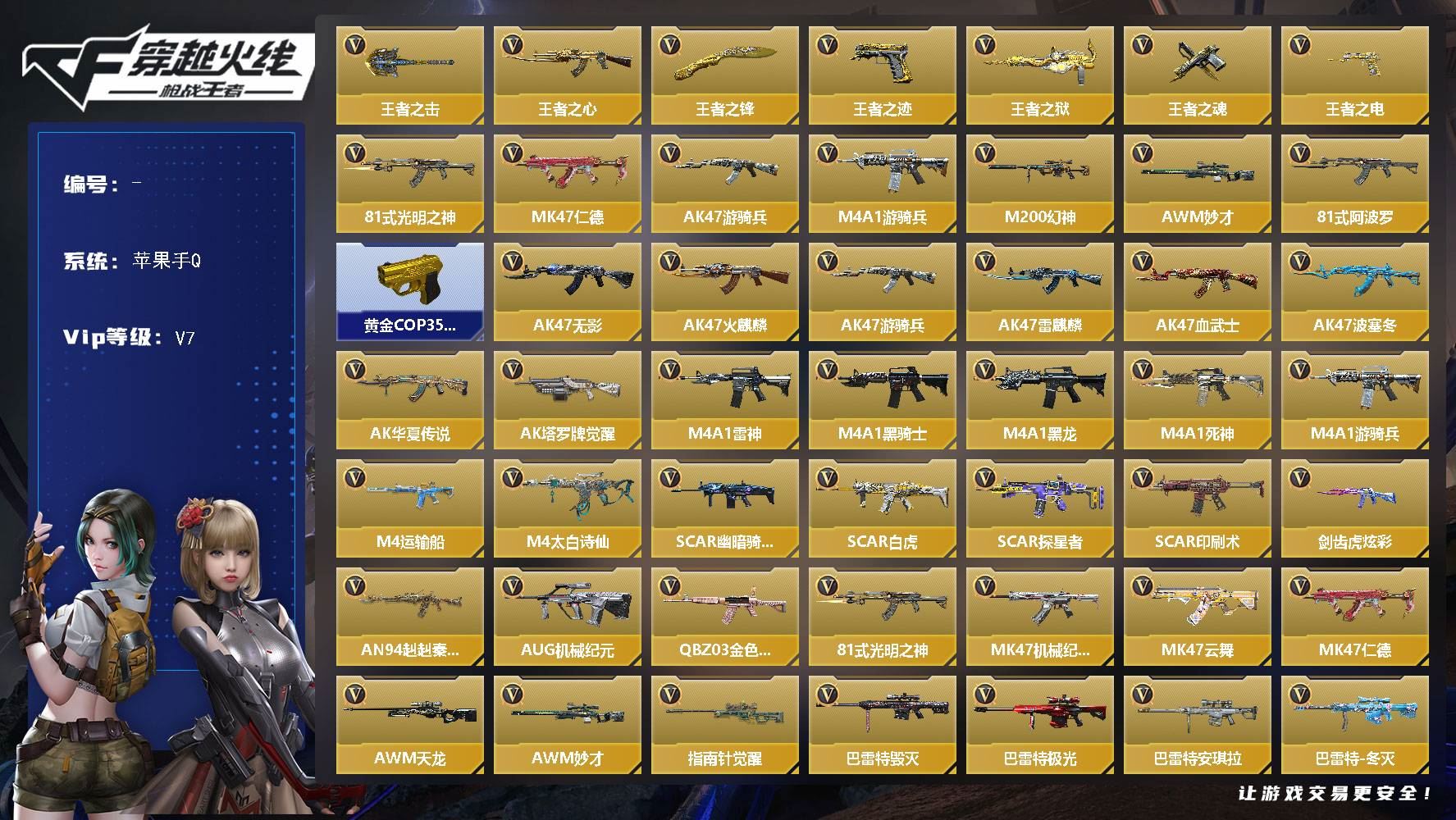 【游戏多多】 56英雄角色数-930英雄武器数 【王者系列】:巴雷特-雷霆王者,COP 357-雷霆王者,雷霆王者之锋,M4A1-雷霆王者,M12S-雷霆王者,王者之击,王者之轮,王者之城,王者之势,王者之戮,王者之力,王者之影,王者之光,王者之武,王者之怒,王者之魄,王者之心,王者之神,王者之锋,王者之迹,王者之掣,王者之翎,王者之蝶,王者之圣,王者之兽,王者之狱,王者之魂,王者之痕,王者幻神,王者之仞,王者之隐,王者之烈,王者之霆,王者之破,王者之业,王者之竞,QBZ03-王者蔷薇,王者之技,王者之誉 【热门武器】:KSG-孟获,81式-光明之神,MK47-仁德,AK47-策,81式-机械纪元,AK47-孟德,M4A1-仲达,AK47-奉先,AK47-常胜,M4A1-星象,AK47-游骑兵,M4A1-游骑兵,TAC-慈,M200-幻神,AWM-妙才,AWM-游骑兵,VEPR12-本初,VEPR12-宙斯,黑龙魂,COP 357-雷霆,COP 357-旗袍,COP 357-星象,COP 357-堕天神,81式-阿波罗,M200-权,CZS2-仲康,COP 357-安琪拉,AN94-盖 【角色】:春,蝉,蔡文昭,关小雨,九尾狐,葵,零,萝拉,岚兮儿,零-水下丽影,晴雅,乔月,审判者,瞳,雾萌萌,妩媚妖姬,幽灵刀锋-觉醒,樱,云悠悠,雨墨,雅典娜,子涵,职场灵狐-赛事经理,甄梦,凌霄,炽天使-X,祝融夫人,零-新生,步练师,虹儿,钟小魁 【英雄武器】:09式狙-天神,09式狙-幻兽,81式-机械纪元,81式-光明之神,9A91-死神,9A91-游骑兵,98K-黑骑士,98K-血月,98K-星神,98K-蜻蜓,AK47-无影,AK47-火麒麟,AK47-麒麟,AK47-黑武士,AK47-黑武士觉醒,AK47-沙漠领主,AK47-牡丹精灵,AK47-角斗士,AK47-耀金伯爵,AK47-游骑兵,AK47-冰魂,AK47-冰魂觉醒,AK47-Rush-星速,AK47-常胜,AK47-樱斗士-二觉,AK47-竞技战魂,AK47-机械迷城,AK47-无影-葵,AK47-变色龙,AK47-孟德,AK47-幸运日觉醒,AK47-猩红传说,AK47-沙漠郡主-一觉,AK47-沙漠郡主-超觉,AK47-雷麒麟,AK47-心动次元觉醒,AK47-雷暴,AK47-奉先,AK47-血武士,AK47-波塞冬,AK47-策,AK47-华夏传说,AK47-死神,AK47-黑鲨,AK47-风神翼龙,AK47-轮回,AK47-雷霆,AN94-超新星,AN94-卷帘大将军,AUG-机械纪元,AK12-天启,AWM-天龙,AWM-赛博时代,AWM-游骑兵,AWM-妙才,AWM-竞界荣光,AWM-裁决,AWM-天使,暗杀星,暗杀神,AA12-雷神,巴雷特-毁灭,巴雷特-极光,巴雷特-雷神,巴雷特-金色蔷薇,巴雷特-安琪拉,巴雷特-坦克堡垒,巴雷特-雷霆,巴雷特-极光-运动宝贝兰,巴雷特-冬灭觉醒,巴雷特-雷霆王者,白骨利刃,CZS2-善财童子,CZS2-心动次元,CZS2-心动次元觉醒,CZS2-血月,COP 357-星象,COP 357-雷霆,COP 357-堕天神,COP 357-旗袍,COP 357-雷霆王者,CZ75-死神,CZ75-穷奇,雌雄双股剑,丛林匕首-火力竞放觉醒,丛林匕首-庆龙觉醒,地狱火,地狱烈炎,夺魂,方天画戟,G36-机械纪元,G36-竞技战魂,G3A3-五色琉璃觉醒,GLOCK18-宙斯,HK416-混世行者,寒霜烈龙,黑龙魂,毁灭征服者-超越Max,海斯博士双刃-激光,虎贲钩镰刀,虎头湛金枪,剑齿虎,剑齿虎-炫彩,加特林-堡垒,加特林-炼狱,加特林-堡垒觉醒,加特林-蟒蛇,激光短刃-黑骑士,甲骨利斧,KSG-黑骑士,KSG-天蓬元帅,KSG-火力竞放觉醒,KSG-极光,KSG-孟获,柯尔特-仲达,柯尔特-伏刹山海觉醒,刘易斯-血月,刘易斯-天使,龙啸,镰刀-哈迪斯,龙啸-堕天神,雷霆王者之锋,龙胆亮银枪,雷霆权杖-宙斯,M4A1-雷神,M4A1-黑骑士,M4A1-黑龙,M4A1-死神,M4A1-玫瑰精灵,M4A1-游骑兵,M4A1-卧龙觉醒,M4A1-卧龙,M4A1-星象,M4A1-Rush-夜袭,M4A1-雷神-萝拉,M4A1-龙血,M4A1-仲达,M4A1-竞界荣光,M4A1-机械迷城,M4A1-赛博雷神,M4A1-雷霆,M4A1-海骑士,M4A1-冰锋觉醒,M4A1-哈迪斯,M4A1-破空冰刃,M4A1-堕天神,M4A1-心动次元,M4A1-心动次元觉醒,M4A1-运输船,M4A1-猎神,M4A1-雷霆王者,M14EBR-暗夜,M14EBR-天神,M14EBR-拂影,MK47-机械纪元,MK47-云舞,MK47-仁德,M200-幻神,M200-心【详情看截图,截图或者标题展示段位不代 表实际段位,如赛季更新等不可抗拒因素发生变化、时限道具不保证所剩时间、标题未写送点劵默认不送】