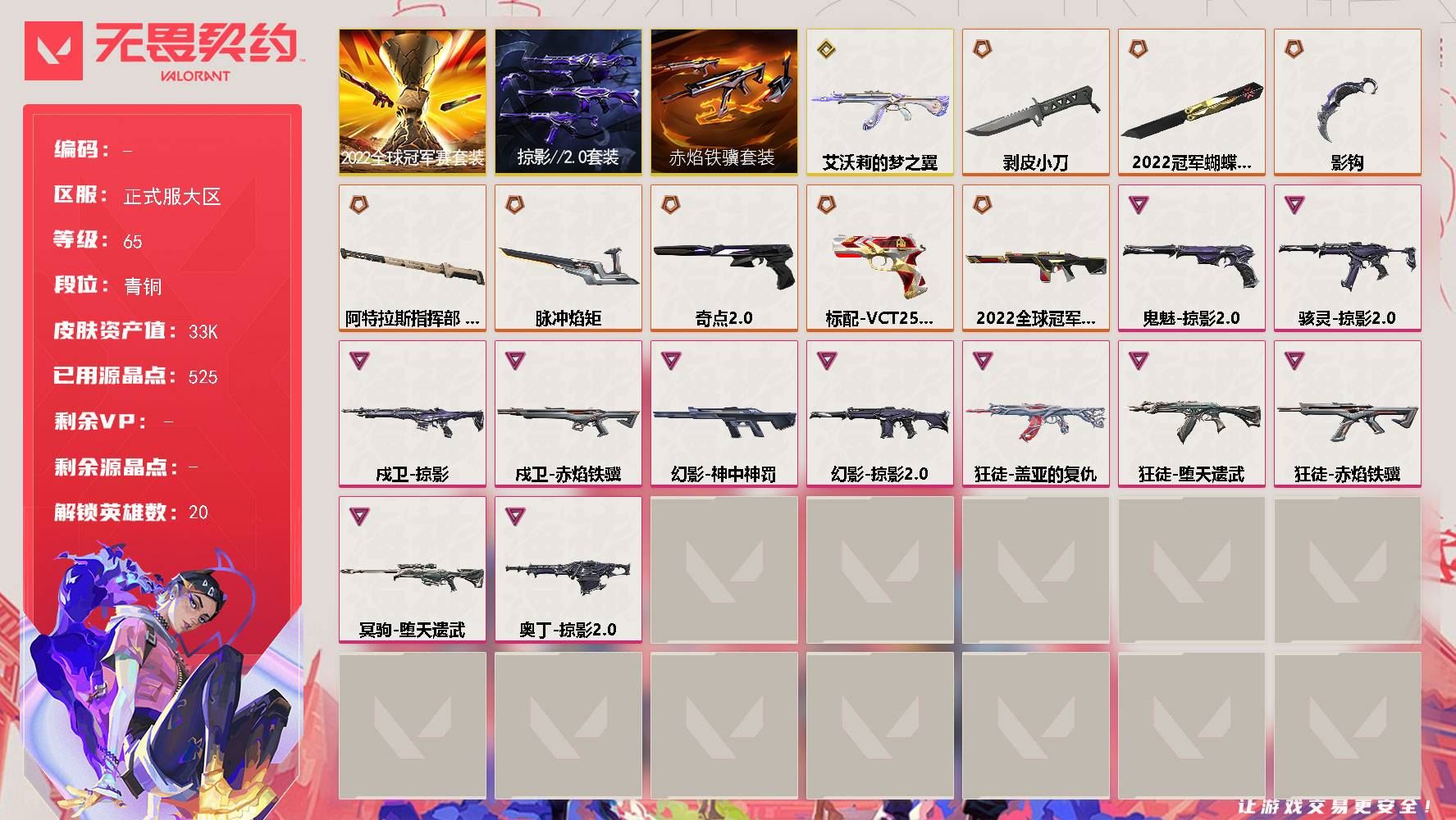 【游戏多多】 【可包人脸】hmcAK032879正式服大区 等级65 20英雄 38皮肤 8限定 1终极 11卓越 【套装】:2022全球冠军赛套装,掠影//2.0套装,赤焰铁骥套装【英雄】:炼狱,维斯,暮蝶,钛狐,壹决,铁臂,捷风,雷兹,幽影,不死鸟,贤者,猎枭,零,芮娜,尚勃勒,霓虹,斯凯,盖可,黑梦,钢锁【近战武器】:近战武器-剥皮小刀,近战武器-2022全球冠军赛 蝴蝶刀,近战武器-脉冲焰矩,近战武器-影钩,近战武器-阿特拉斯指挥部 甩棍【狂徒】:狂徒-艾沃莉的梦之翼,狂徒-堕天遗武,狂徒-盖亚的复仇,狂徒-赤焰铁骥【幻影】:幻影-2022全球冠军赛,幻影-神中神罚,幻影-掠影//2.0【戍卫】:戍卫-掠影,戍卫-赤焰铁骥【冥驹】:冥驹-堕天遗武【奥丁】:奥丁-掠影//2.0【骇灵】:骇灵-掠影//2.0【VCT手枪】:标配-VCT25 x AG【鬼魅】:鬼魅-奇点//2.0,鬼魅-掠影//2.0【详情请看截图,皮肤可能含有某些特权皮肤,具体以游戏内实际拥有为准】