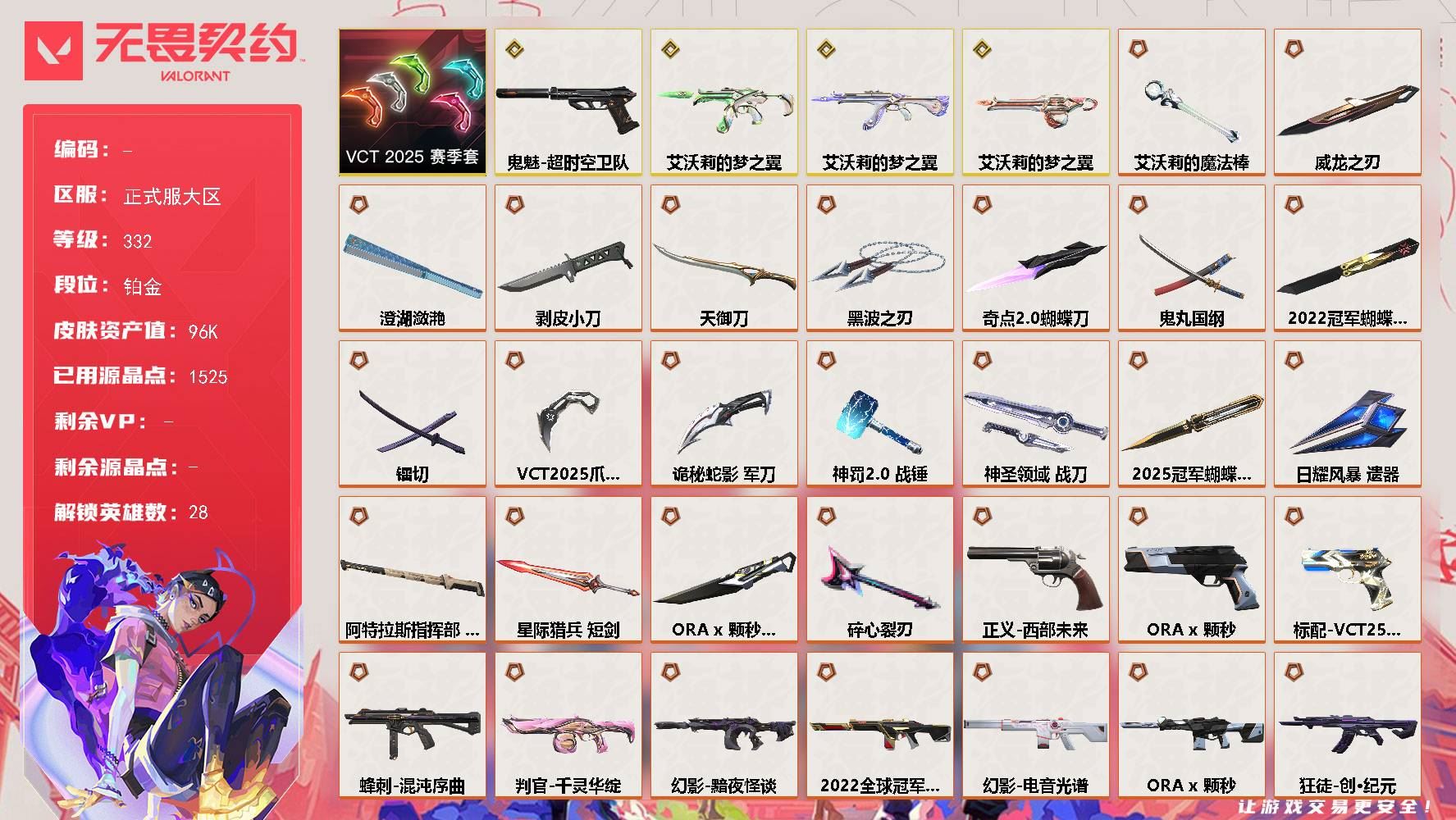 【游戏多多】 【可包人脸】正式服大区 等级332 28英雄 137皮肤 33限定 8终极 13卓越 【套装】:2025全球冠军赛套装,2022全球冠军赛套装,ORA x 颗秒套装,VCT 2025 赛季套装【英雄】:幻棱,炼狱,维斯,暮蝶,钛狐,壹决,铁臂,捷风,雷兹,幽影,不死鸟,贤者,猎枭,蝰蛇,零,芮娜,奇乐,尚勃勒,霓虹,斯凯,夜露,星礈,K/O,海神,盖可,黑梦,钢锁【近战武器】:近战武器-剥皮小刀,近战武器-黑波之刃,近战武器-艾沃莉的魔法棒,近战武器-威龙之刃,近战武器-澄湖潋滟,近战武器-天御刀,近战武器-2025全球冠军赛 蝴蝶刀,近战武器-2022全球冠军赛 蝴蝶刀,近战武器-碎心裂刃,近战武器-ORA x 颗秒 军刀【狂徒】:狂徒-艾沃莉的梦之翼,狂徒-盖亚的复仇,狂徒-日冕雄师,狂徒-耀鳞威龙,狂徒-紫阙金琅,狂徒-2025全球冠军赛,狂徒-创·纪元,狂徒-ORA x 颗秒,狂徒-诡秘蛇影【幻影】:幻影-侦察力量,幻影-2022全球冠军赛,幻影-黯夜怪谈,幻影-电音光谱,幻影-ORA x 颗秒,幻影-神圣领域,幻影-末日之翼【戍卫】:戍卫-天界神兵,戍卫-月球哨兵,戍卫-折光棱晶【獠犬】:獠犬-日冕雄师,獠犬-神圣领域【冥驹】:冥驹-偃月苍龙,冥驹-堕天遗武,冥驹-ORA x 颗秒,冥驹-星云暗涌【飞将】:飞将-黯夜怪谈,飞将-末日之翼【莽侠】:莽侠-创·纪元,莽侠-诡秘蛇影,莽侠-月球哨兵【战神】:战神-神圣领域【奥丁】:奥丁-艾沃莉的梦之翼,奥丁-末日之翼【判官】:判官-千灵华绽,判官-诡秘蛇影【雄鹿】:雄鹿-紫阙金琅//2.0,雄鹿-月球哨兵【骇灵】:骇灵-艾沃莉的梦之翼,骇灵-无限竞技,骇灵-星云暗涌【蜂刺】:蜂刺-混沌序曲,蜂刺-星云暗涌,蜂刺-折光棱晶【标配】:标配-折光棱晶【VCT手枪】:标配-VCT25 x 100T【正义】:正义-西部未来,正义-ORA x 颗秒,正义-离子武器,正义-纳米打击,正义-月球哨兵【鬼魅】:鬼魅-盖亚的复仇,鬼魅-天界神兵,鬼魅-超时空卫队,鬼魅-诡秘蛇影,鬼魅-星云暗涌【狂怒】:狂怒-神圣领域【短炮】:短炮-海洋之星,短炮-末日之翼【详情请看截图,皮肤可能含有某些特权皮肤,具体以游戏内实际拥有为准】
