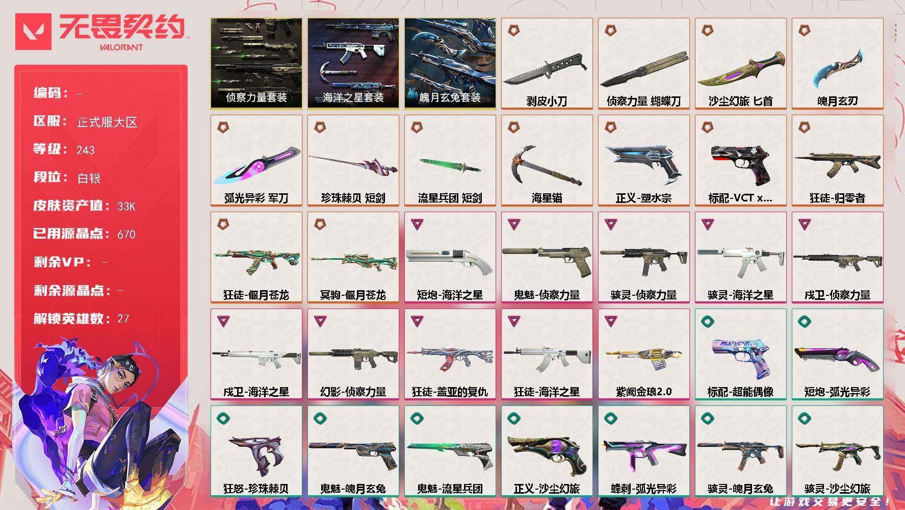 【游戏多多】 【可包人脸】hmc正式服大区 等级243 27英雄 81皮肤 13限定 0终极 10卓越 【套装】:海洋之星套装,侦察力量套装,魄月玄兔套装【英雄】:幻棱,炼狱,维斯,暮蝶,钛狐,壹决,铁臂,捷风,雷兹,幽影,不死鸟,贤者,猎枭,蝰蛇,零,芮娜,奇乐,尚勃勒,霓虹,斯凯,夜露,星礈,K/O,海神,盖可,黑梦,钢锁【近战武器】:近战武器-侦察力量 蝴蝶刀,近战武器-剥皮小刀,近战武器-珍珠棘贝 短剑,近战武器-流星兵团 短剑,近战武器-海星锚,近战武器-弧光异彩 军刀,近战武器-魄月玄刃,近战武器-沙尘幻旅 匕首【狂徒】:狂徒-归零者,狂徒-偃月苍龙,狂徒-盖亚的复仇,狂徒-海洋之星,狂徒-弧光异彩,狂徒-魄月玄兔,狂徒-沙尘幻旅,狂徒-流星兵团【幻影】:幻影-侦察力量,幻影-噬源兽防卫工程,幻影-珍珠棘贝【戍卫】:戍卫-海洋之星,戍卫-侦察力量,戍卫-珍珠棘贝,戍卫-彩梦之城,戍卫-萌彩剪影,戍卫-战术熊与伙伴们【獠犬】:獠犬-弧光异彩,獠犬-复古浪潮,獠犬-胡桃狂想【冥驹】:冥驹-偃月苍龙,冥驹-复古浪潮,冥驹-胡桃狂想【飞将】:飞将-魄月玄兔,飞将-沙尘幻旅,飞将-信手涂鸦,飞将-战术熊与伙伴们【莽侠】:莽侠-深海水族,莽侠-纤云弄巧【战神】:战神-萌彩剪影,战神-深海水族【奥丁】:奥丁-紫阙金琅//2.0,奥丁-信手涂鸦,奥丁-流星兵团【判官】:判官-萌彩剪影【雄鹿】:雄鹿-彩梦之城,雄鹿-复古浪潮【骇灵】:骇灵-海洋之星,骇灵-侦察力量,骇灵-魄月玄兔,骇灵-沙尘幻旅,骇灵-珍珠棘贝,骇灵-信手涂鸦,骇灵-流星兵团【蜂刺】:蜂刺-弧光异彩,蜂刺-胡桃狂想,蜂刺-深海水族,蜂刺-纤云弄巧【标配】:标配-彩梦之城,标配-超能偶像,标配-战术熊与伙伴们【VCT手枪】:标配-VCT x G2【正义】:正义-塑水宗,正义-沙尘幻旅,正义-复古浪潮,正义-纤云弄巧,正义-游戏结束【鬼魅】:鬼魅-侦察力量,鬼魅-魄月玄兔,鬼魅-光导纤维,鬼魅-胡桃狂想,鬼魅-信手涂鸦,鬼魅-流星兵团【狂怒】:狂怒-珍珠棘贝,狂怒-萌彩剪影,狂怒-喷火式,狂怒-战术熊与伙伴们【短炮】:短炮-海洋之星,短炮-弧光异彩,短炮-好搭档,短炮-梦魇恶魔,短炮-深海水族,短炮-纤云弄巧【详情请看截图,皮肤可能含有某些特权皮肤,具体以游戏内实际拥有为准】
