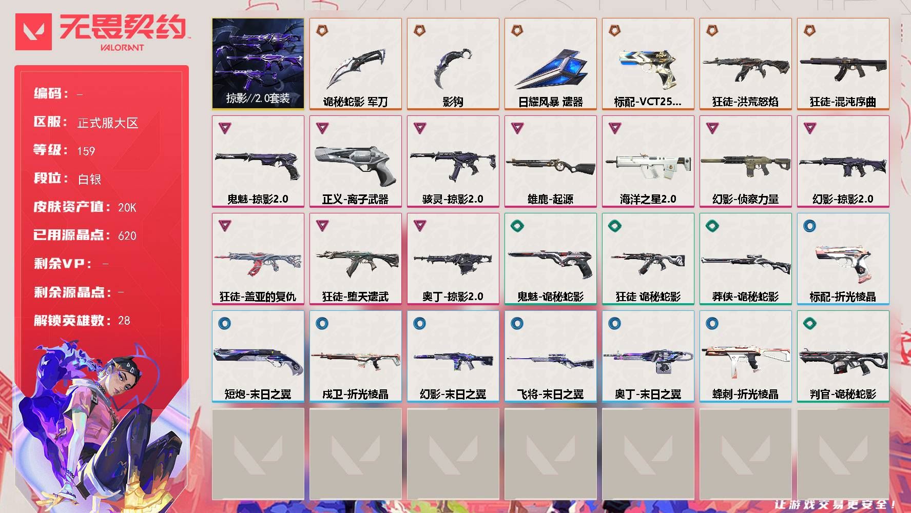 【游戏多多】 【可包人脸】hmcAK033516正式服大区 等级159 28英雄 43皮肤 6限定 0终极 10卓越 【套装】:掠影//2.0套装【英雄】:幻棱,炼狱,维斯,暮蝶,钛狐,壹决,铁臂,捷风,雷兹,幽影,不死鸟,贤者,猎枭,蝰蛇,零,芮娜,奇乐,尚勃勒,霓虹,斯凯,夜露,星礈,K/O,海神,盖可,黑梦,钢锁【近战武器】:近战武器-影钩,近战武器-诡秘蛇影 军刀,近战武器-日耀风暴 遗器【狂徒】:狂徒-洪荒怒焰,狂徒-堕天遗武,狂徒-盖亚的复仇,狂徒-混沌序曲,狂徒-诡秘蛇影【幻影】:幻影-侦察力量,幻影-掠影//2.0,幻影-末日之翼【戍卫】:戍卫-折光棱晶【獠犬】:獠犬-海洋之星//2.0【飞将】:飞将-末日之翼【莽侠】:莽侠-诡秘蛇影【奥丁】:奥丁-掠影//2.0,奥丁-末日之翼【判官】:判官-诡秘蛇影【雄鹿】:雄鹿-起源【骇灵】:骇灵-掠影//2.0【蜂刺】:蜂刺-折光棱晶【标配】:标配-折光棱晶【VCT手枪】:标配-VCT25 x 100T【正义】:正义-离子武器【鬼魅】:鬼魅-掠影//2.0,鬼魅-诡秘蛇影【短炮】:短炮-末日之翼【详情请看截图,皮肤可能含有某些特权皮肤,具体以游戏内实际拥有为准】