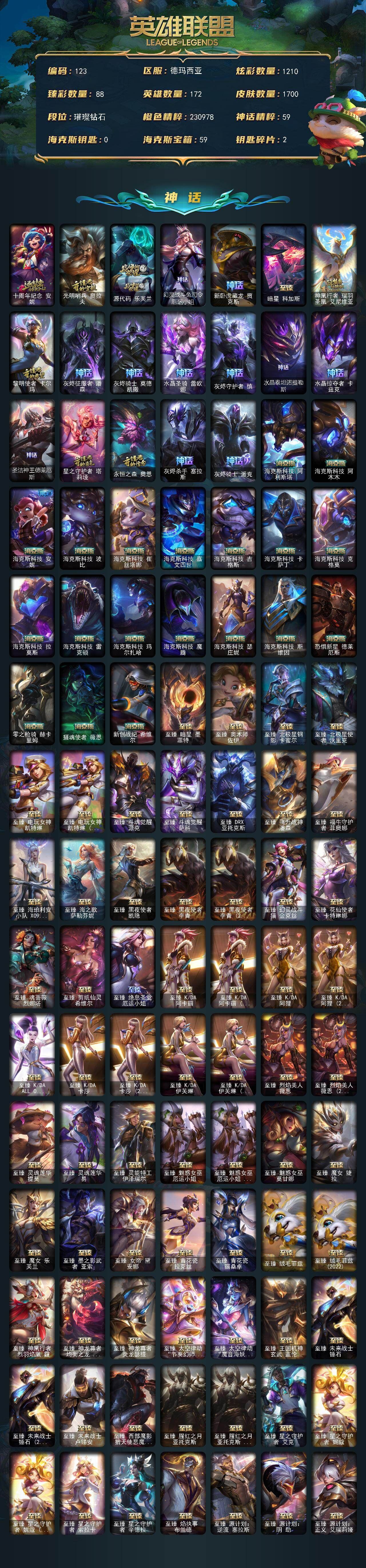 【游戏多多】 【可二次实名】r54189 可二次 德玛西亚【钻石段位-172英雄-1700皮肤-1210炫彩-9终极-128神话-348限定-129传说-215史诗】【神话皮肤:暗星科加斯,神凰行者瑞羽圣凰艾尼维亚,黎明使者卡尔玛,灰烬征服者潘森,灰烬骑士莫德凯撒,水晶圣骑蕾欧娜,灰烬守护者慎,水晶泰坦诺提勒斯,水晶掠夺者卡兹克,圣洁神王德莱厄斯,星之守护者塔莉垭,永恒之森奥恩,灰烬杀手塞拉斯,灰烬骑士派克,海克斯科技阿利斯塔,海克斯科技阿木木,海克斯科技安妮,海克斯科技波比,海克斯科技崔丝塔娜,海克斯科技嘉文四世,海克斯科技吉格斯,海克斯科技卡萨丁,海克斯科技克格莫,海克斯科技拉莫斯,海克斯科技雷克顿,海克斯科技玛尔扎哈,海克斯科技魔腾,海克斯科技瑟庄妮,海克斯科技斯维因,恐惧新星德莱厄斯,零之枪骑赫卡里姆,摄魂使者薇恩,新创战纪希维尔,至臻征服者贾克斯,至臻真实伤害奇亚娜,至臻真实伤害奇亚娜2022,至臻真实伤害赛娜,至臻真实伤害亚索,至臻至高天奎桑提,至臻神龙尊者比翼之龙洛,至臻天龙之子伊泽瑞尔,至臻至高天凯尔,至臻暗星墨菲特,至臻奥术师佐伊,至臻北极星钢影卡蜜尔,至臻北极星使者沃里克,至臻电玩女神凯特琳,至臻电玩女神凯特琳2022,至臻斗魂觉醒派克,至臻斗魂觉醒萨科,至臻DRX亚托克斯,至臻飞升战神潘森,至臻福牛守护者菲奥娜,至臻海珀利安小队X09星环灵风迦娜,至臻海之歌萨勒芬妮,至臻黑夜使者凯隐,至臻黑夜使者李青,至臻黑夜使者李青2022,至臻幻灵战斗猫金克丝,至臻花仙使者卡特琳娜,至臻魂蔷薇烈娜塔,至臻剪纸仙灵希维尔,至臻绝息圣堂厄运小姐,至臻KDA阿卡丽,至臻KDA阿卡丽2022,至臻KDA阿狸,至臻KDA阿狸2022,至臻KDAALLOUT卡莎,至臻KDA卡莎,至臻KDA卡莎2022,至臻KDA伊芙琳,至臻KDA伊芙琳2022,至臻烈焰美人薇恩,至臻烈焰美人薇恩2022,至臻灵魂莲华提莫,至臻灵魂莲华易,至臻灵能特工伊泽瑞尔,至臻魅惑女巫厄运小姐,至臻魅惑女巫厄运小姐2022,至臻魅惑女巫莫甘娜,至臻魔女婕拉,至臻魔女乐芙兰,至臻墨之影武者亚索,至臻女帝黛安娜,至臻青花瓷拉克丝,至臻青花瓷丽桑卓,至臻绒毛菲兹,至臻绒毛菲兹2022,至臻神凰行者烈羽焰凰霞,至臻神龙尊者均衡之龙沃利贝尔,至臻神龙尊者炎龙瑟提,至臻太空律动节奏幻师璐璐,至臻太空律动魔音海妖娜美,至臻王国机神玄武盖伦,至臻未来战士锤石,至臻未来战士锤石2022,至臻未来战士卢锡安,至臻西部魔影猎天使恶魔泰隆,至臻腥红之月亚托克斯,至臻腥红之月亚托克斯2022,至臻星之守护者艾克,至臻星之守护者妮蔻,至臻星之守护者妮蔻2022,至臻星之守护者索拉卡,至臻星之守护者辛德拉,至臻焰执事布兰德,至臻源计划逆流塞拉斯,至臻源计划阴劫,至臻源计划正义艾瑞莉娅,至臻源计划正义艾瑞莉娅2022,至臻月蚀骑士赛娜,至臻玉剑传说琴仙子,至臻玉剑传说武剑仙,至臻玉剑传说武剑仙2022,至臻战斗学院拉克丝,至臻战斗学院拉克丝2022,至臻战斗学院蕾欧娜】【年限皮肤】:龙的传人李青,银龙裁决泰隆,古琴余韵娑娜,定海神珍孙悟空,醒狮克格莫,你看见过我的熊猫吗安妮,碧玉之牙卡西奥佩娅,神龙之翼库奇,替父从军花木兰,广寒仙子嫦娥,神龙烈焰金克丝,美猴王孙悟空,紫金罗刹莫甘娜,玉净夜叉凯特琳,张辽文远,司马懿仲达,虎痴之拳蔚,南天之怒沃里克,北辰之威内瑟斯,春晖神女拉克丝,金猪烈焰瑟庄妮,烈焰美人薇恩,纳财大帝塔姆,王国机神青龙德莱文,王国机神朱雀蕾欧娜,王国机神苍狼瑟提,王国机神白虎贾克斯,王国机神玄武盖伦,福牛守护者安妮,福牛守护者厄斐琉斯,福牛守护者德莱厄斯,福牛守护者阿利斯塔,福牛守护者嘉文四世,福牛守护者菲奥娜,猛虎下山赵信,招财进宝提莫,虎头虎脑崔丝塔娜,烈焰仙子黛安娜,龙腾虎跃瑟提,剪纸仙灵加里奥,剪纸仙灵希维尔,剪纸仙灵婕拉,天龙之子李青,天龙之子易,天龙之子迦娜,天龙之子伊泽瑞尔,天龙之子黛安娜,天龙之子卡莎,天龙之子斯莫德,踏雪寻梅杰斯,踏雪寻梅亚索,龙马烈焰波比,龙马烈焰萨勒芬妮,龙马烈焰悠米】【终极皮肤:大元素使拉克丝,DJ娑娜,斗魂觉醒莎弥拉,KDAALLOUT萨勒芬妮独立音乐人,灵魂守卫乌迪尔,未来战士伊泽瑞尔,武装战姬厄运小姐】各种道具详情看截图、低价出售找回包 赔、截图展示段位不代 表实际段位,如赛季更新等不可抗拒因素发生变化、时限道具不保证所剩时间、标题未写送点劵默认不送【卖号买号首选亿梦】